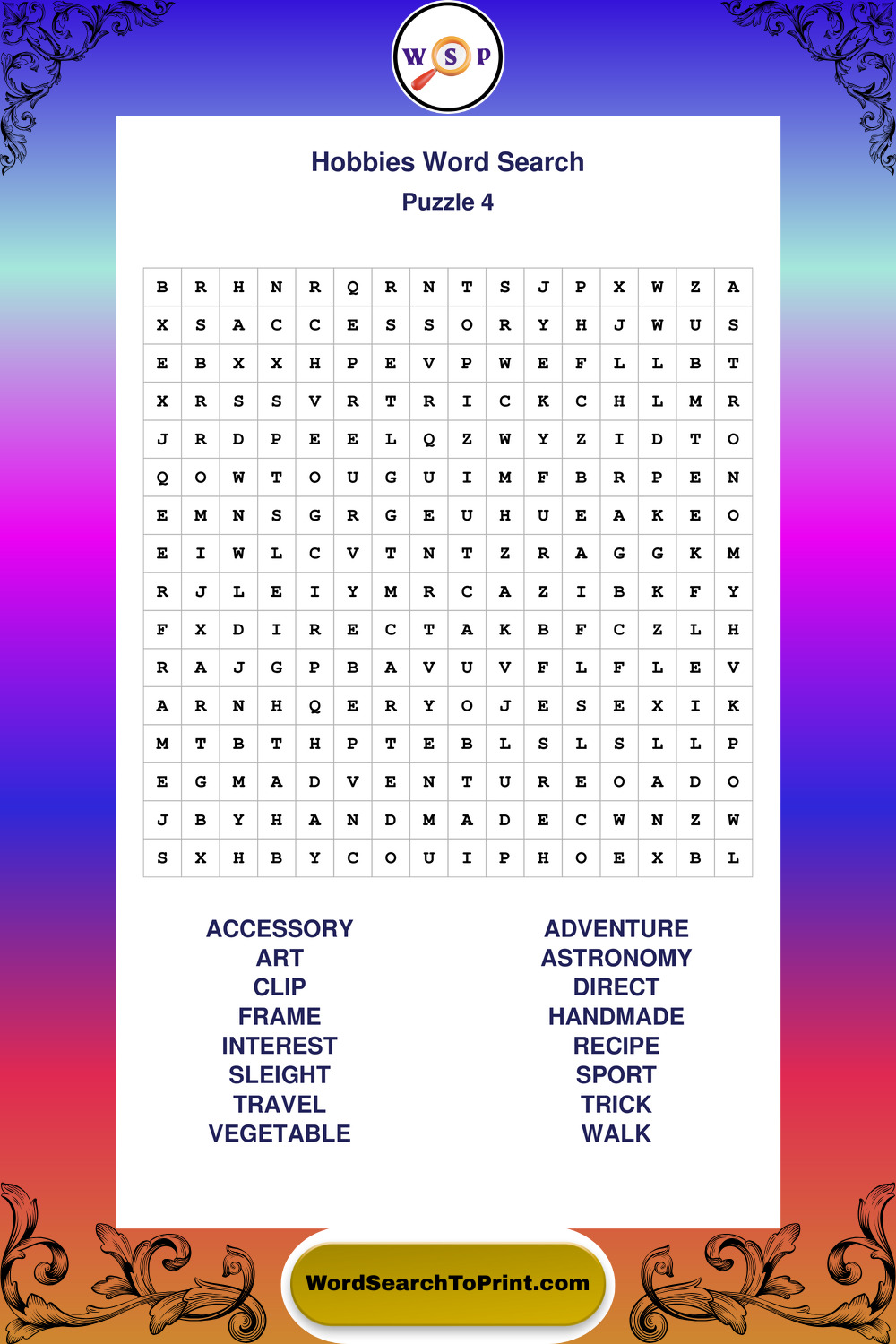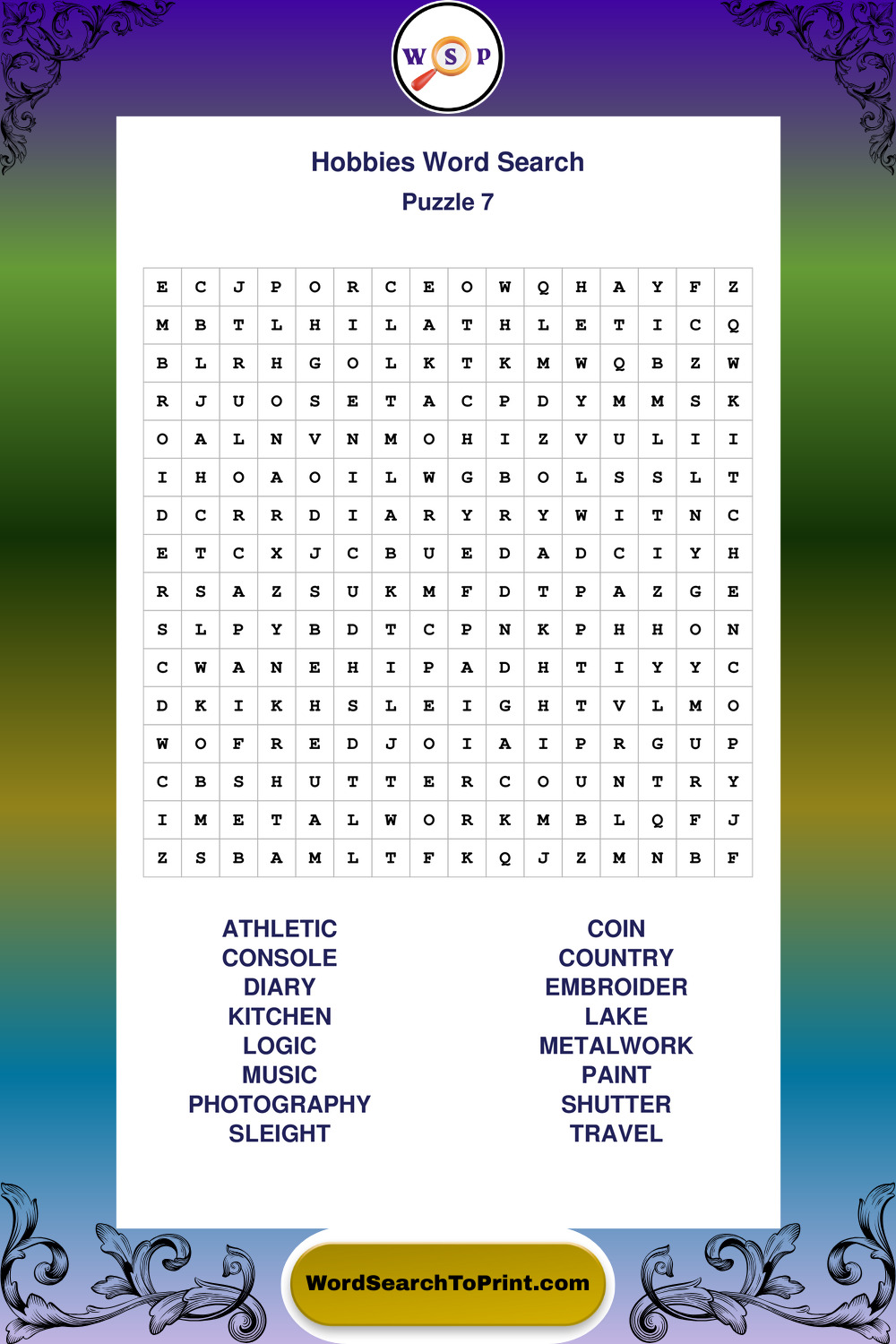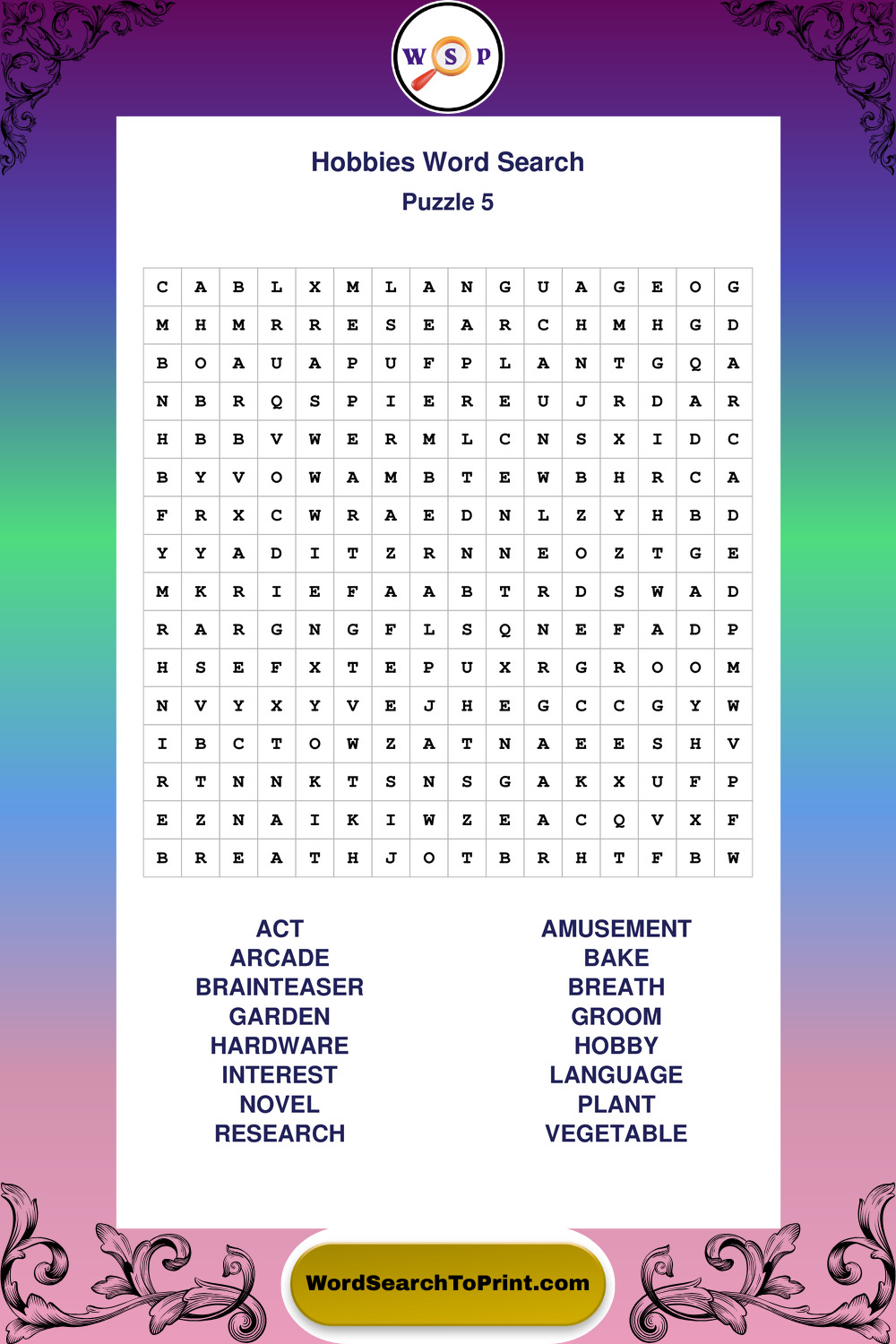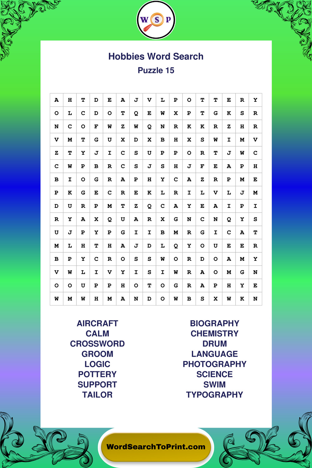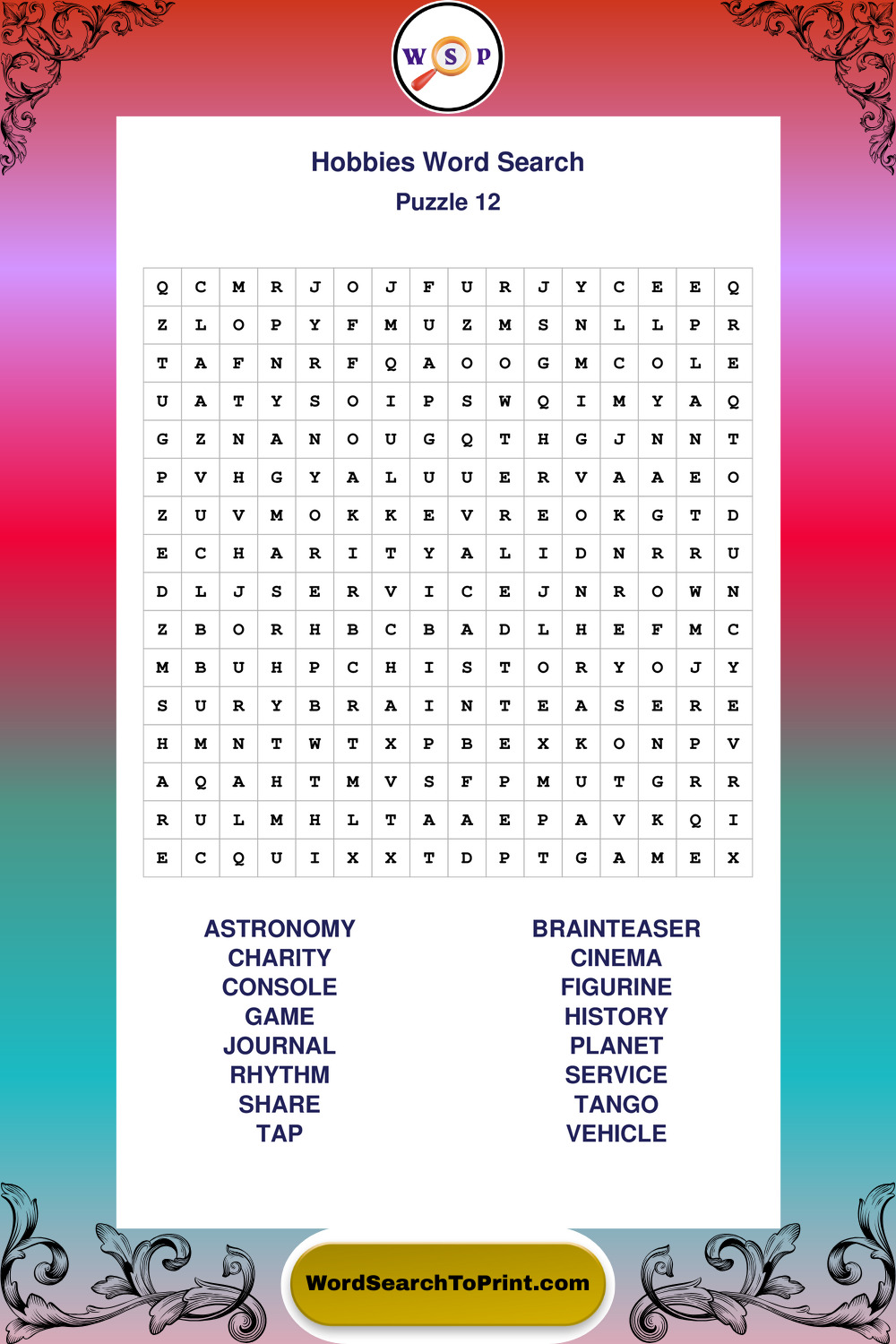 Enjoy a full set of large print Hobbies wordsearches perfect for quiet moments, daily routines, or casual brain exercise.