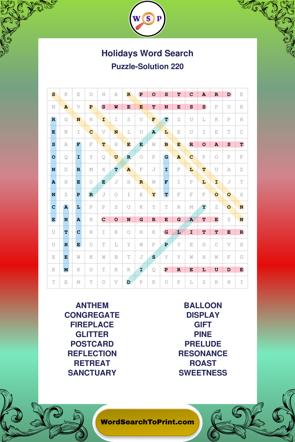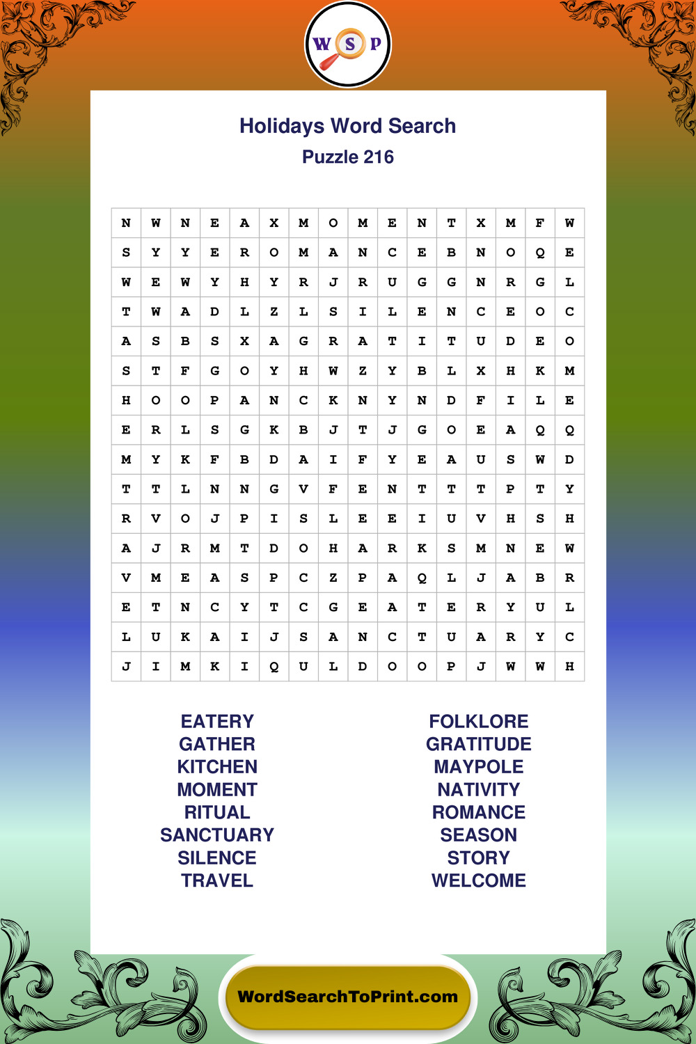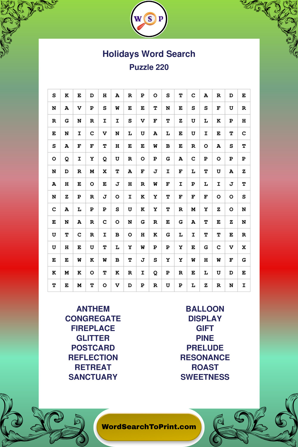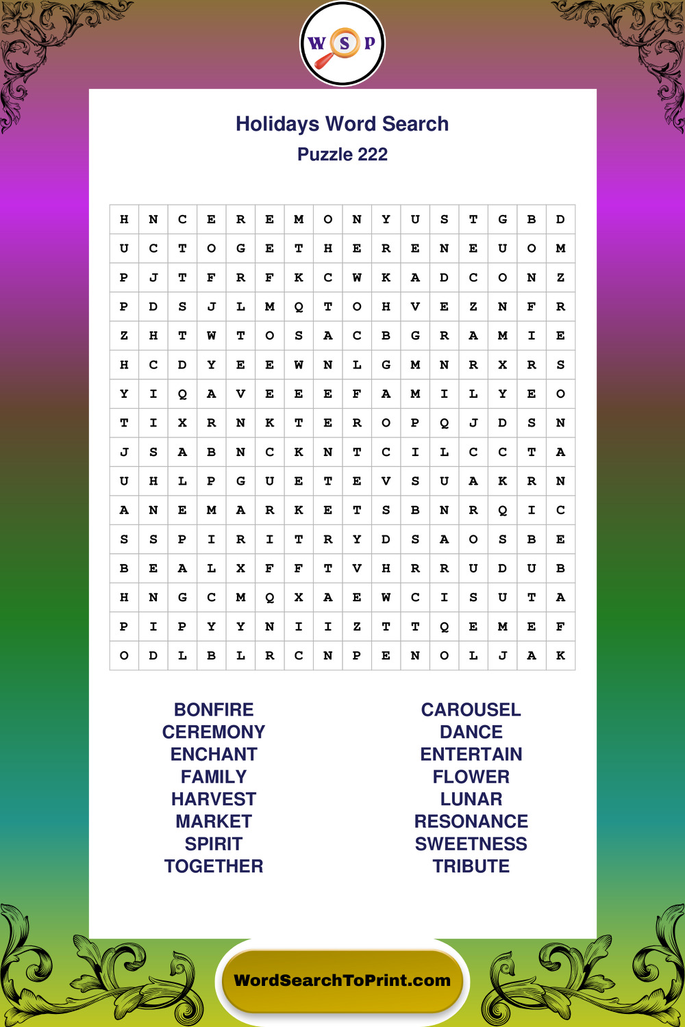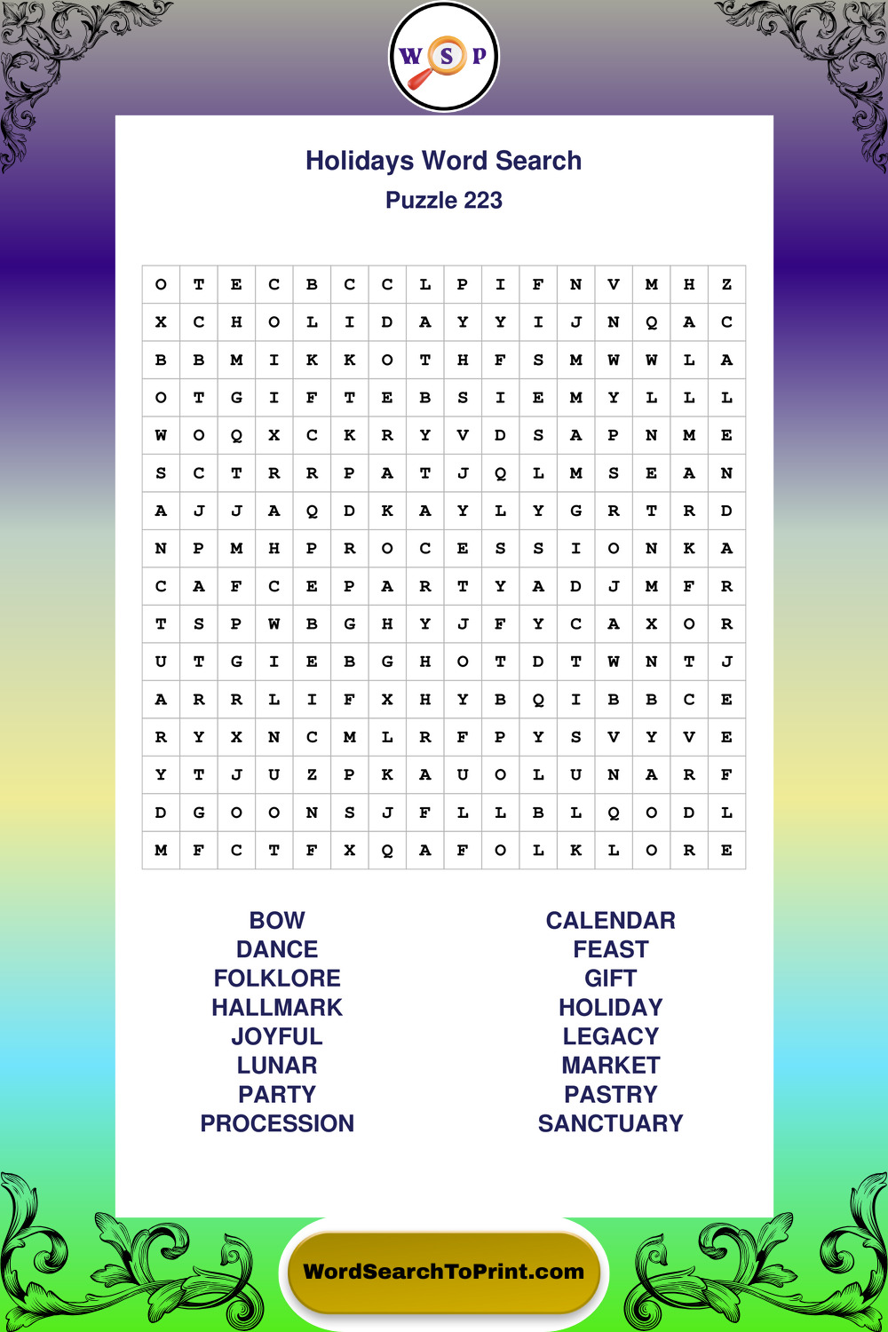 Find easy-to-read large print Holidays wordsearches designed for peaceful focus and simple, enjoyable solving.