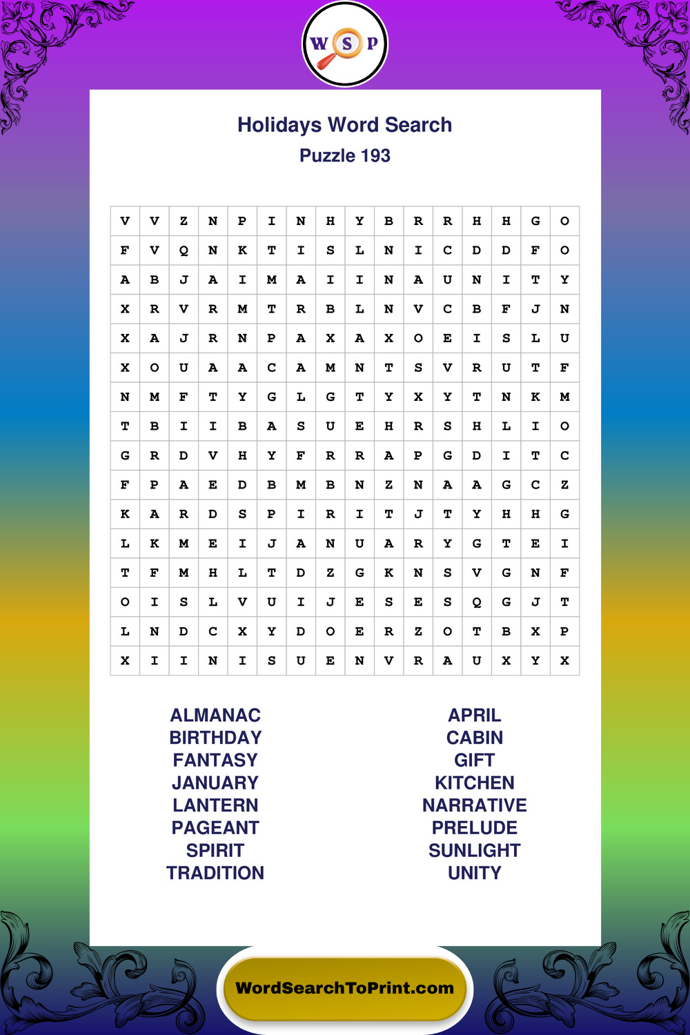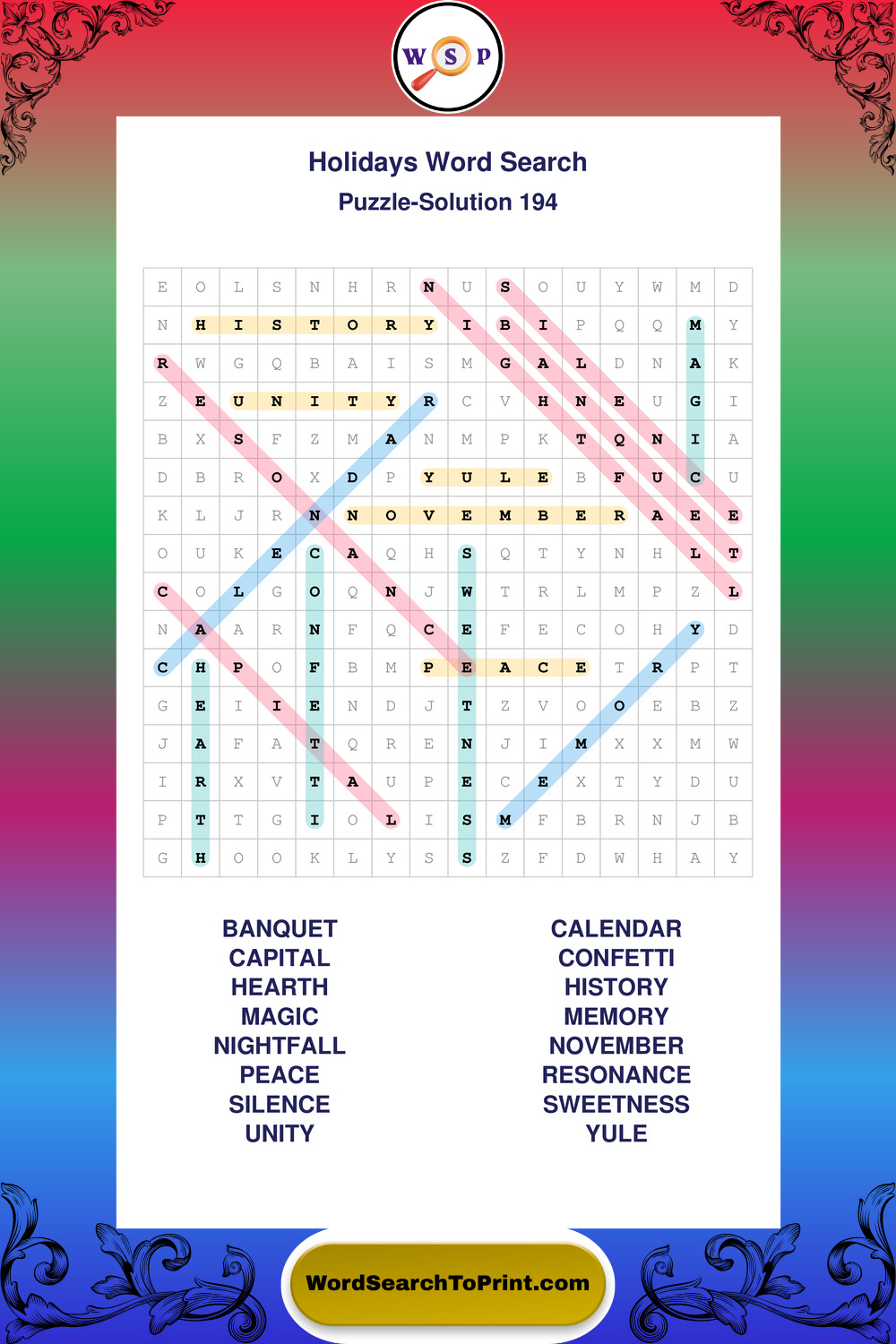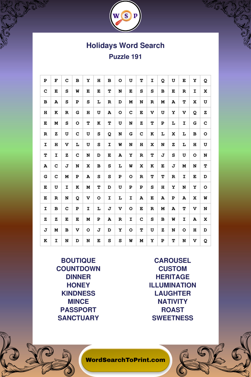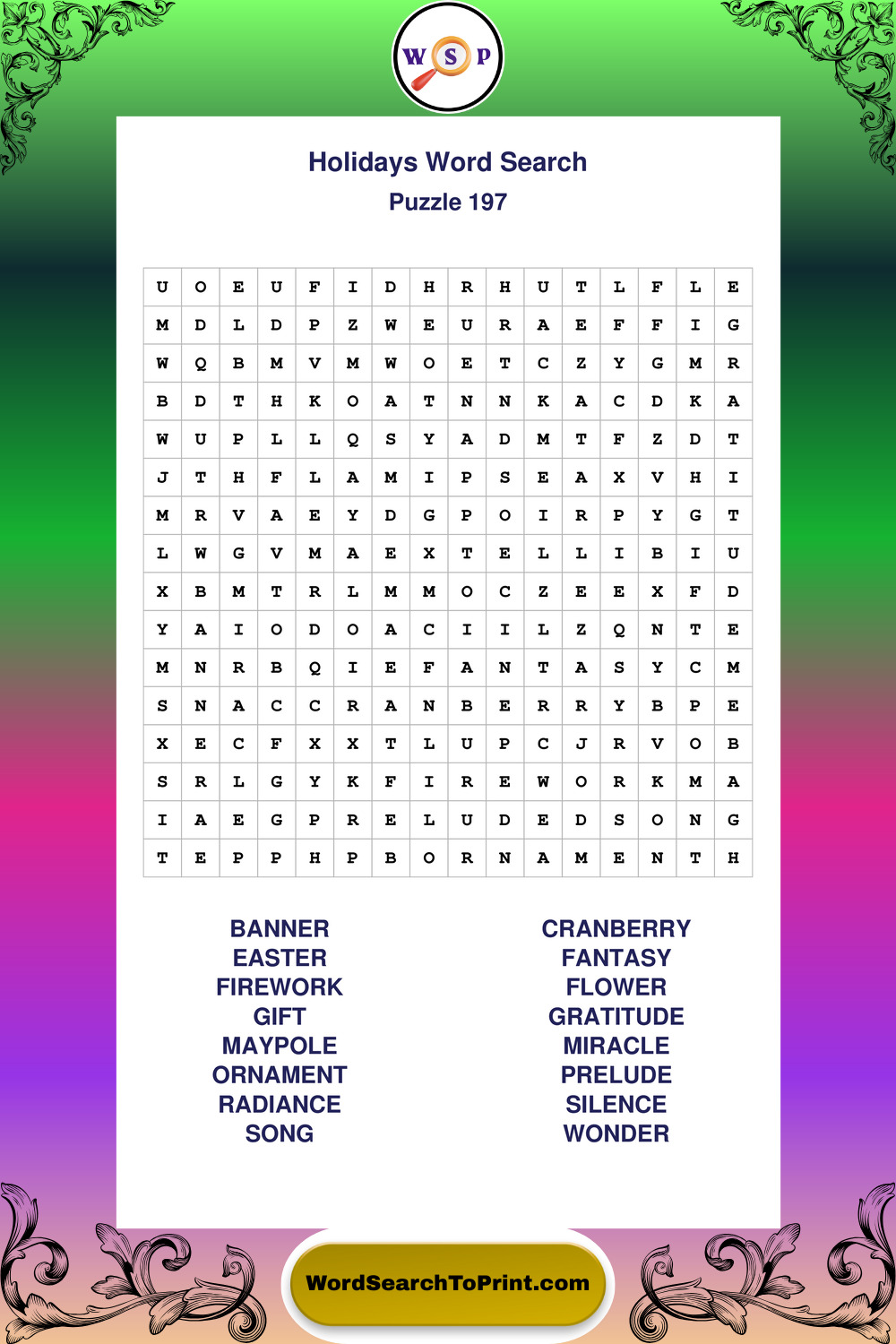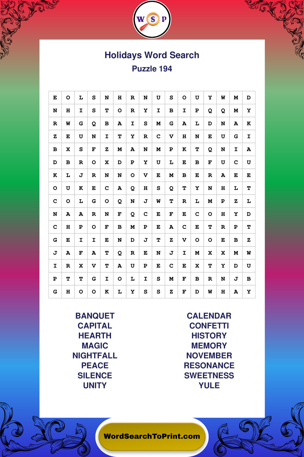 Find easy-to-read large print Holidays wordsearches designed for peaceful focus and simple, enjoyable solving.