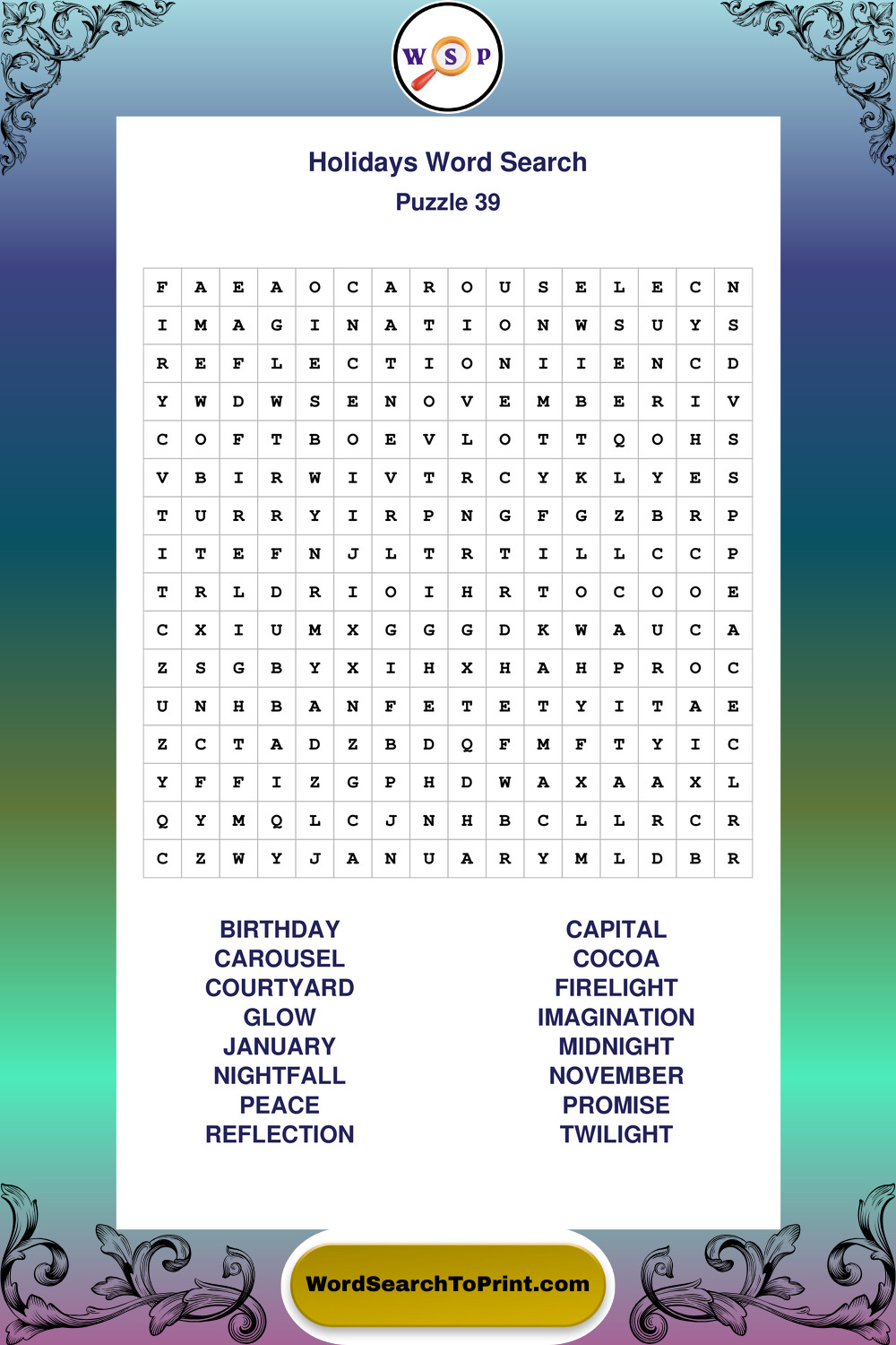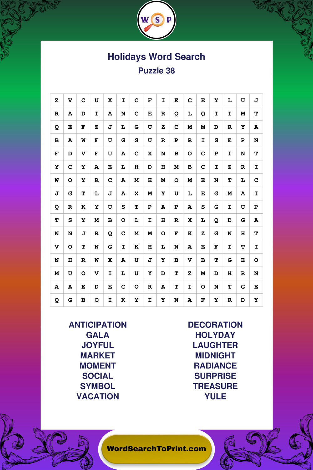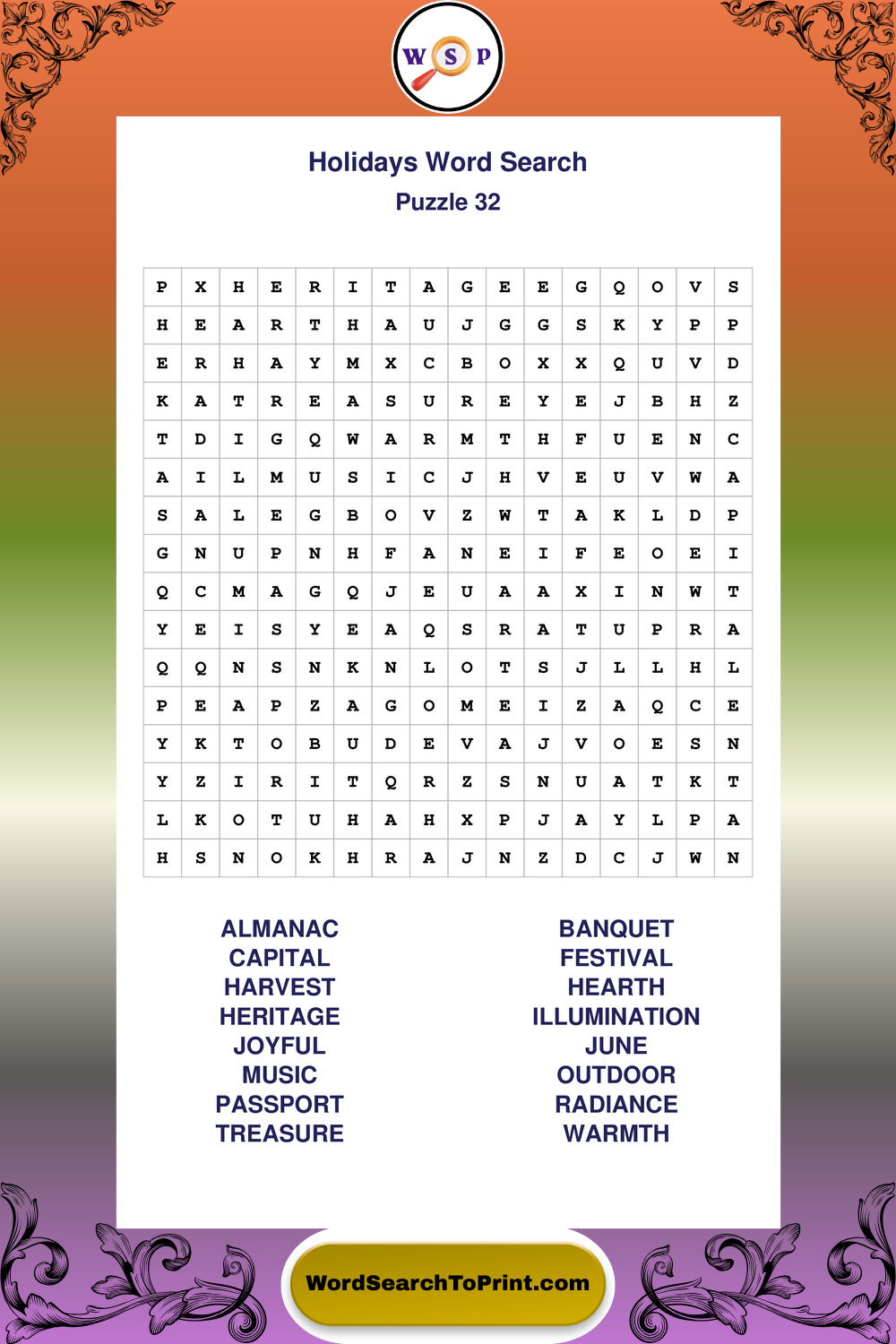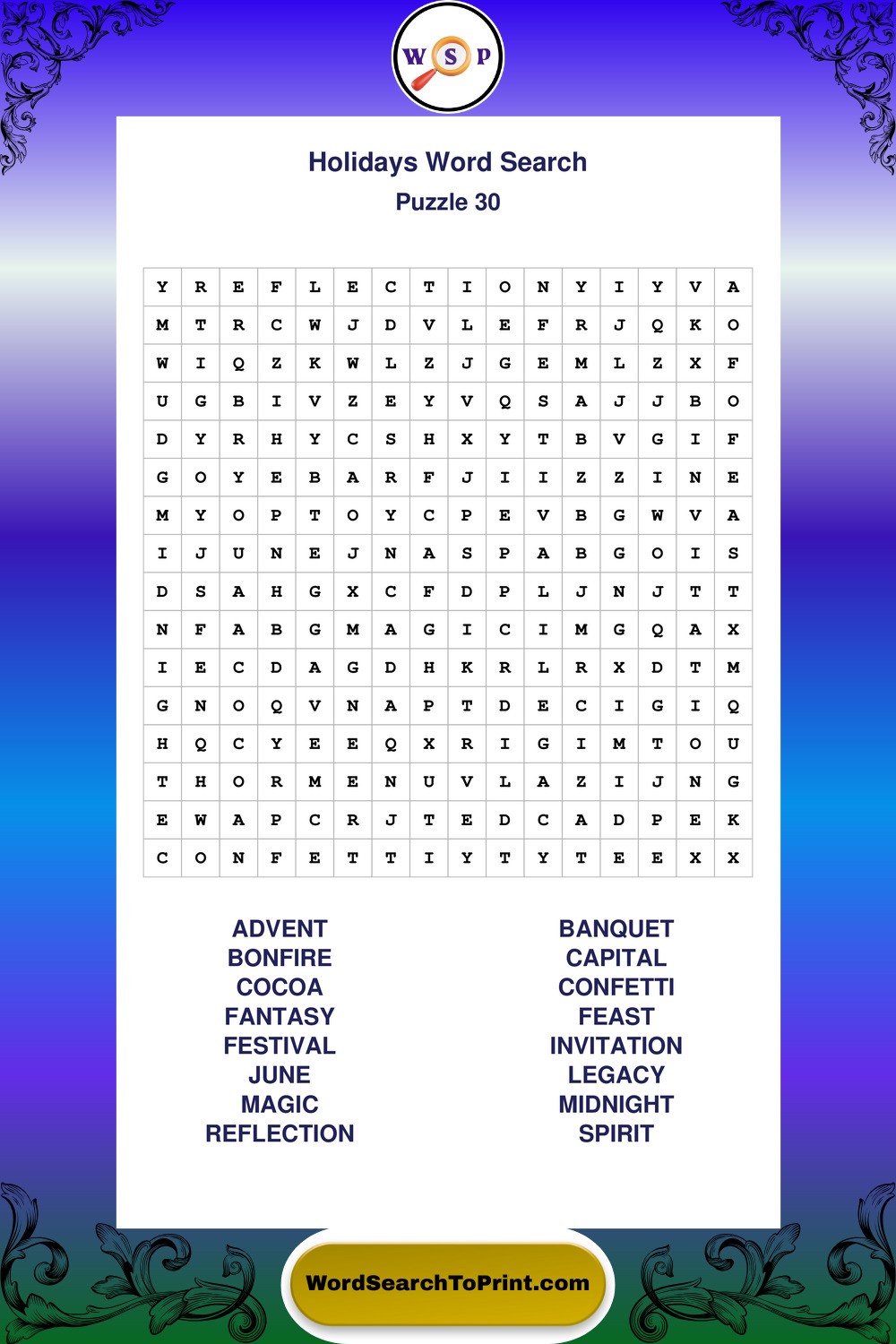 Find easy-to-read large print Holidays wordsearches designed for peaceful focus and simple, enjoyable solving.