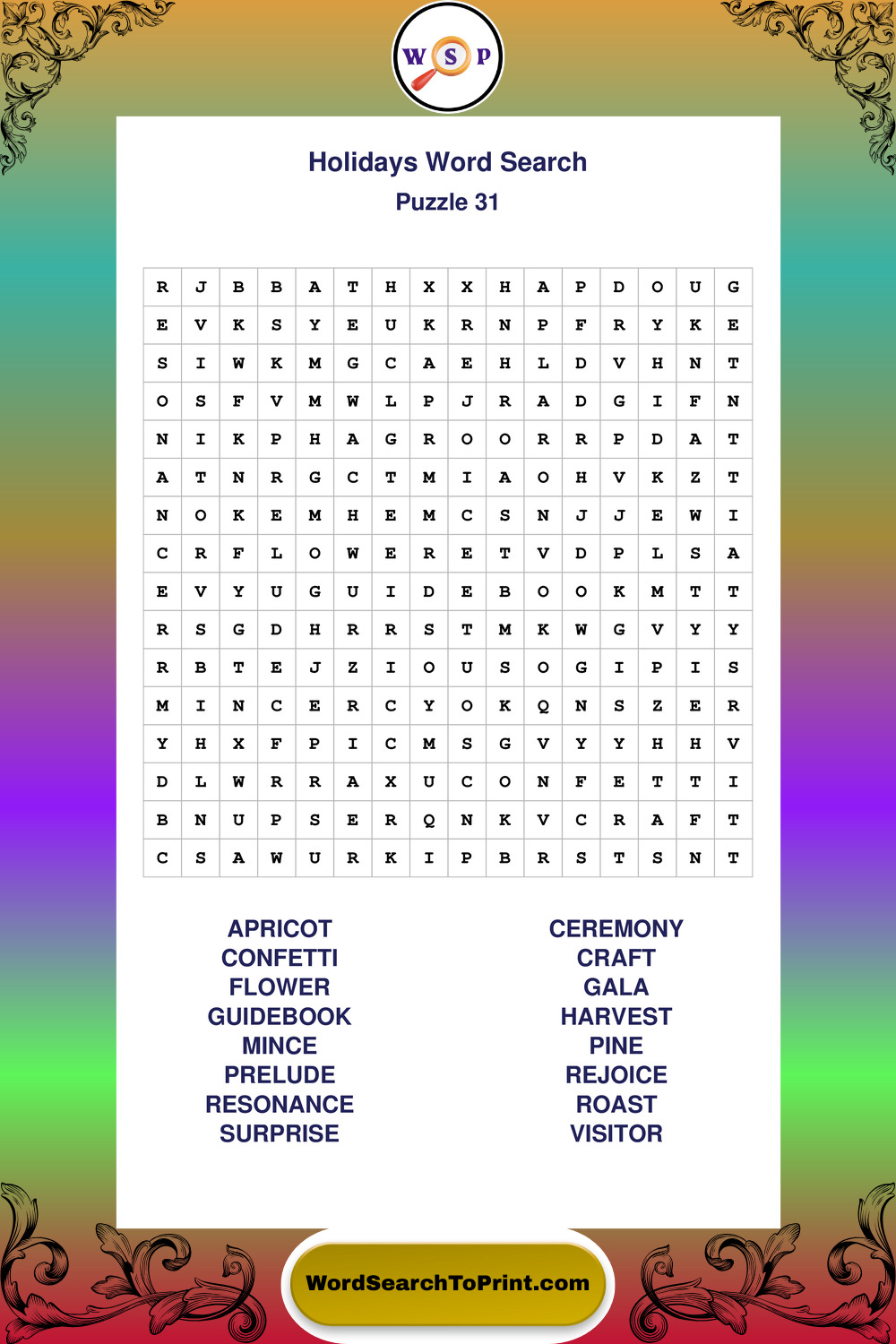 These puzzles include vocabulary connected to traditions, celebrations, festive events, and meaningful moments throughout the year. They offer a structured and engaging way to explore this topic while strengthening concentration and vocabulary recognition. You may also enjoy our St Patrick word search puzzles and Valentine word search puzzles.