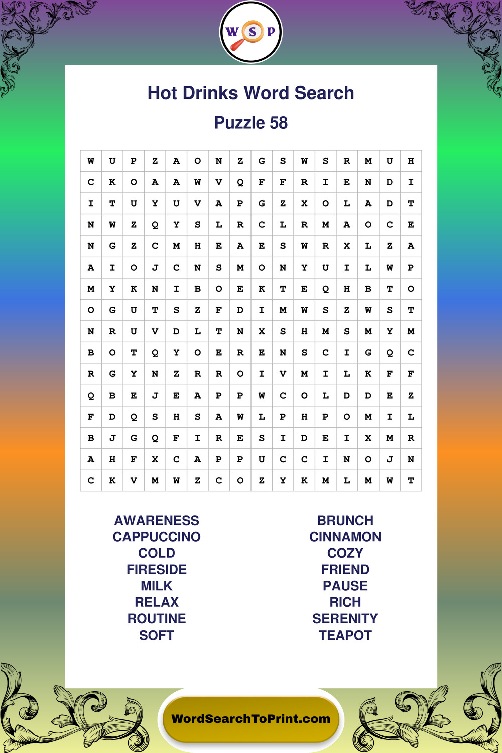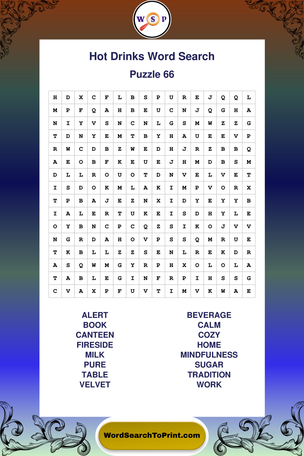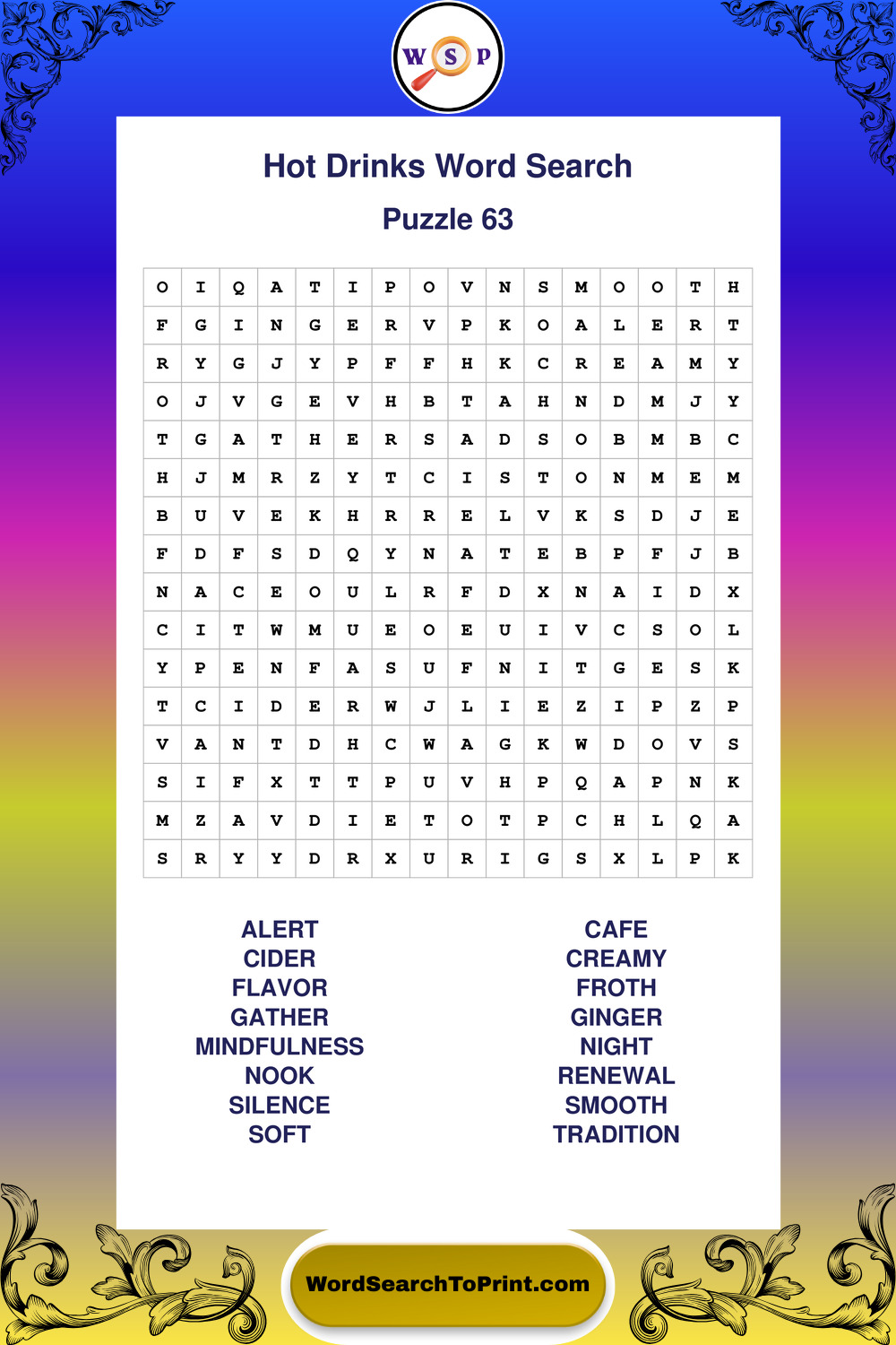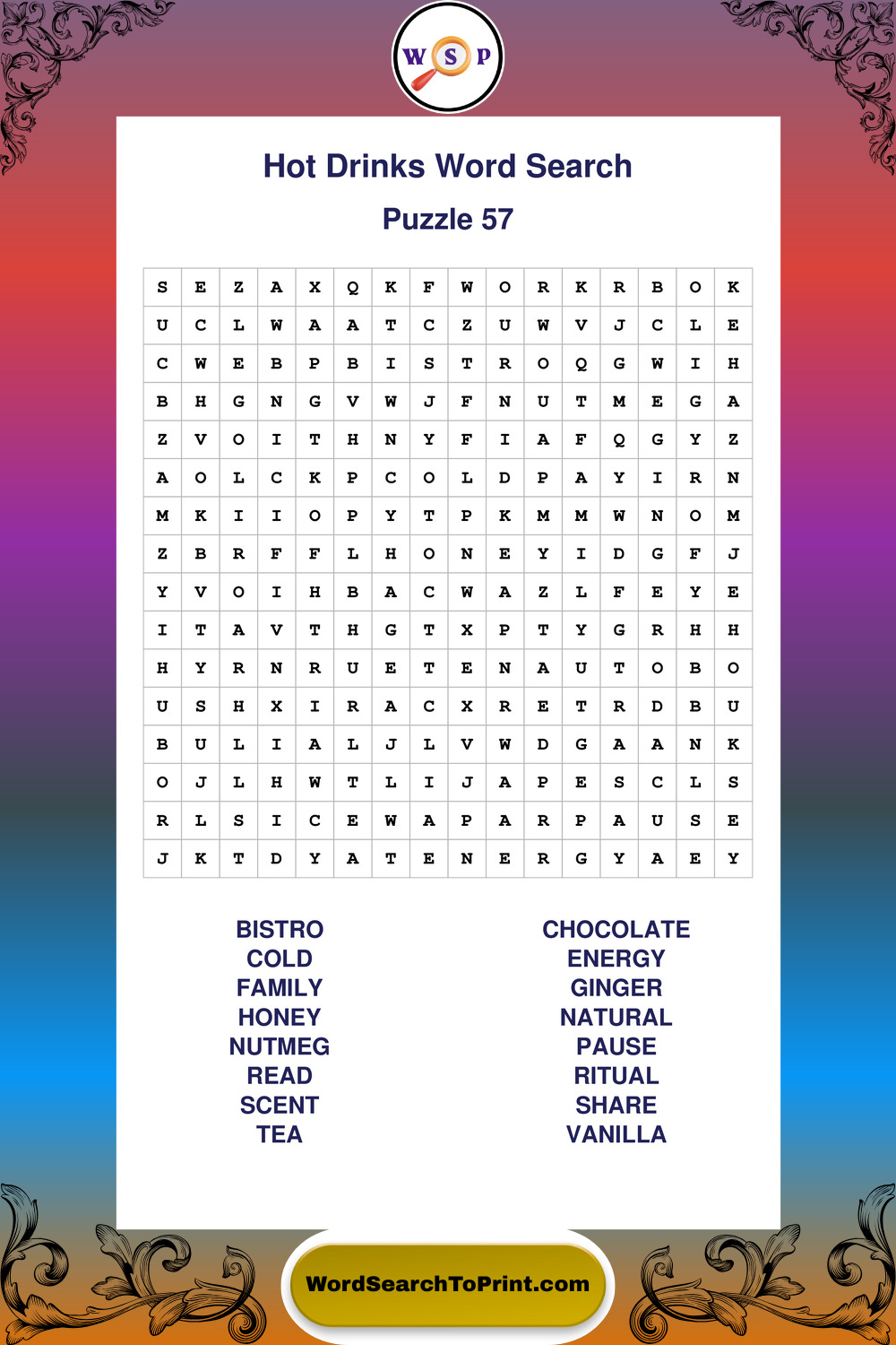 Enjoy large print Hot Drinks wordsearches that balance clarity, simplicity, and enjoyable mental activity.