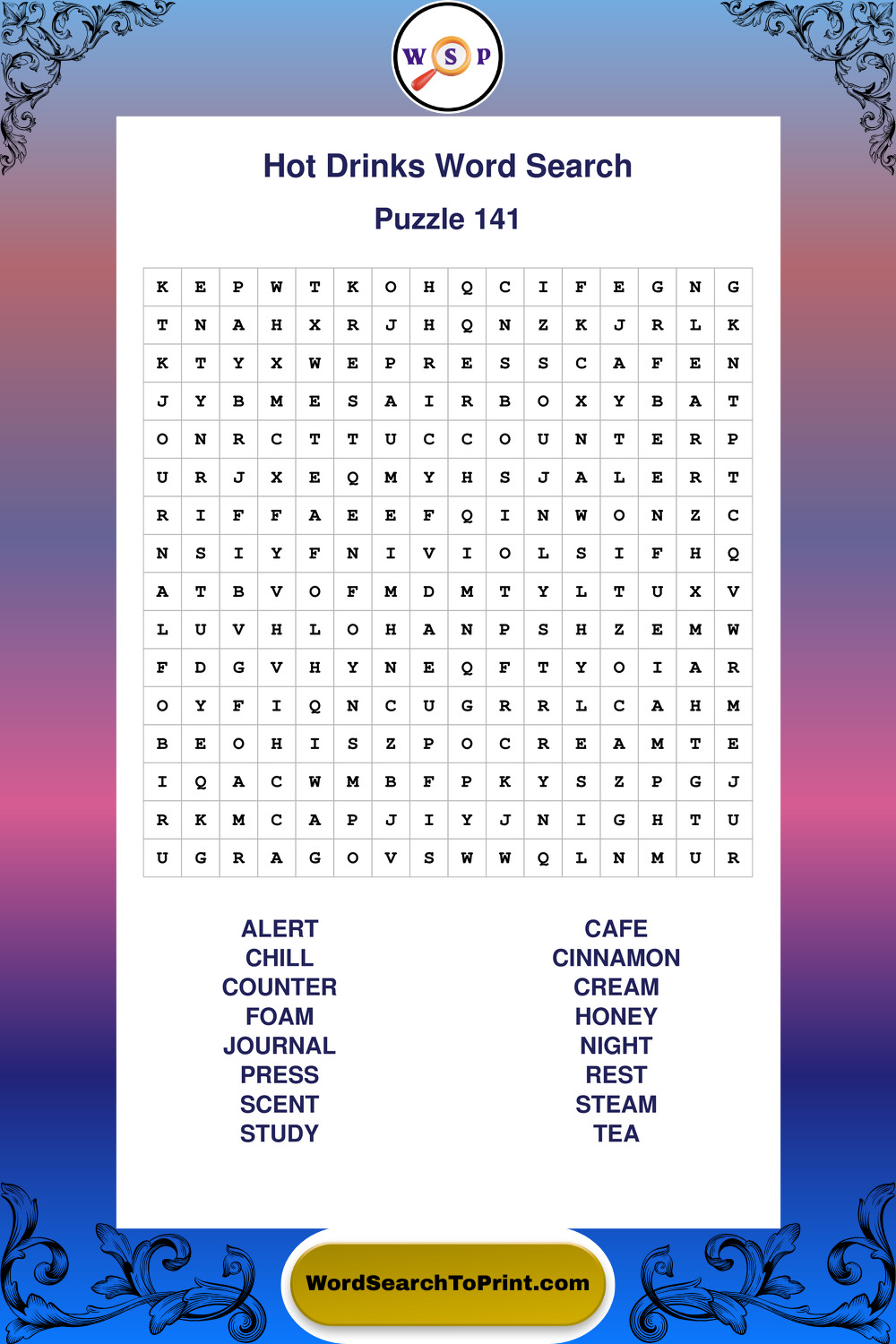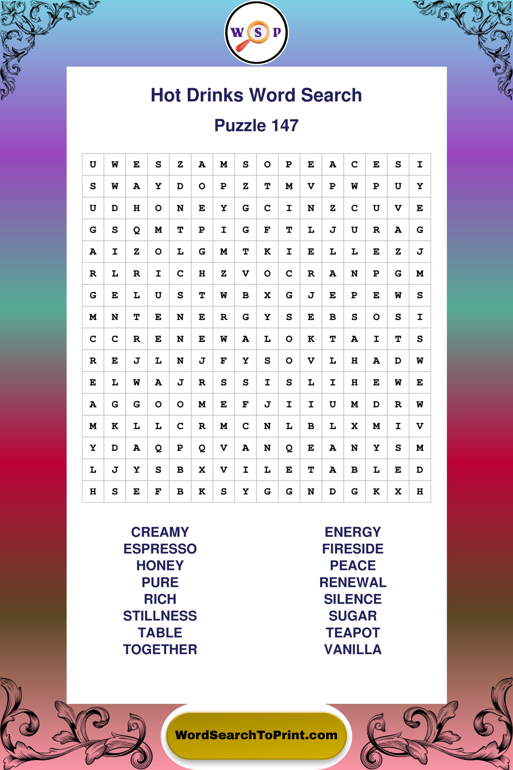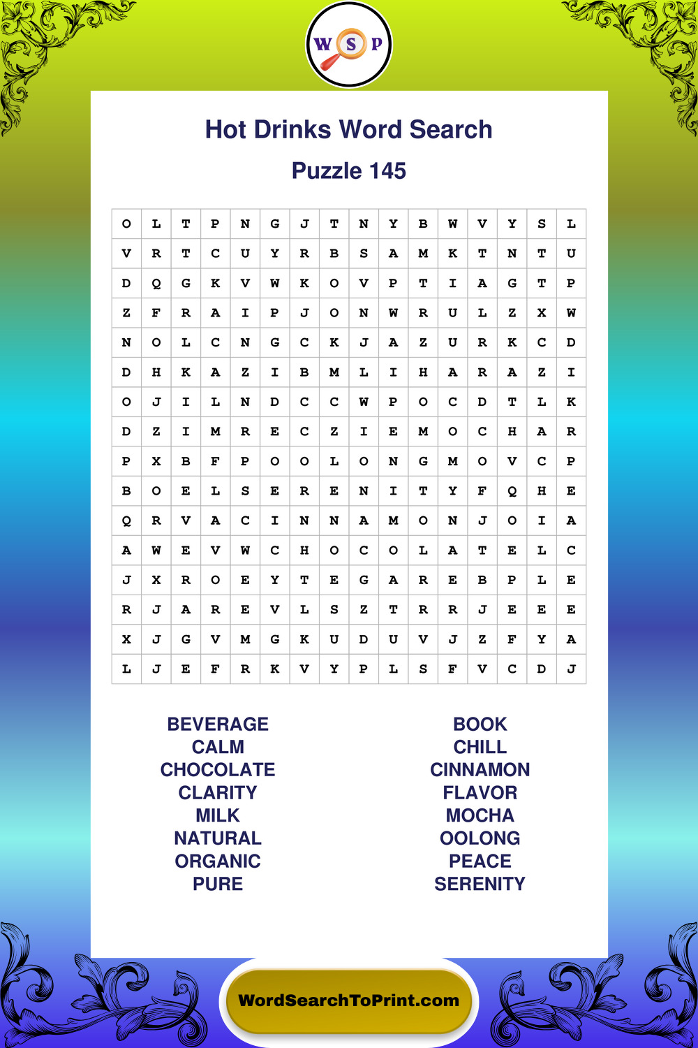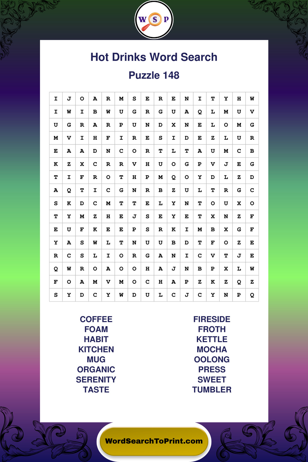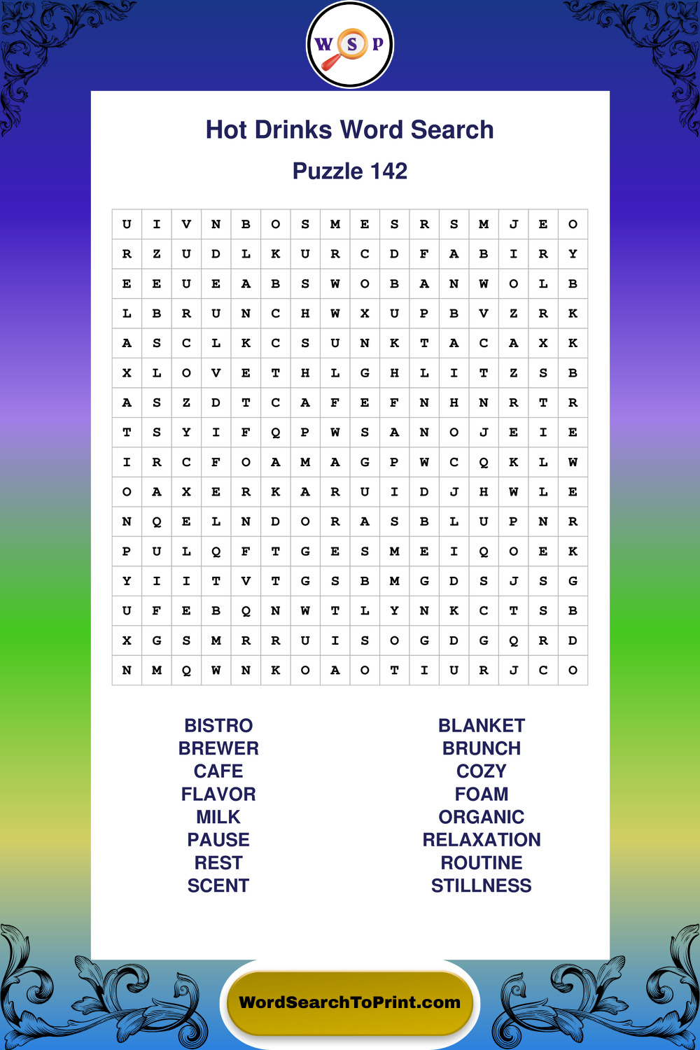 Enjoy large print Hot Drinks wordsearches that balance clarity, simplicity, and enjoyable mental activity.