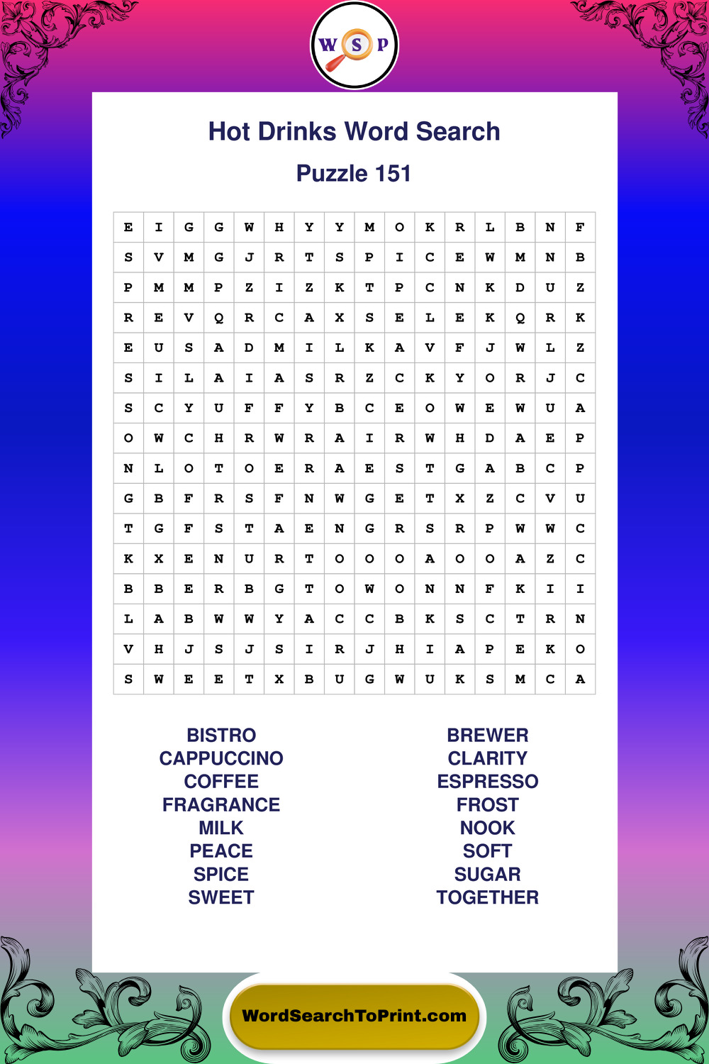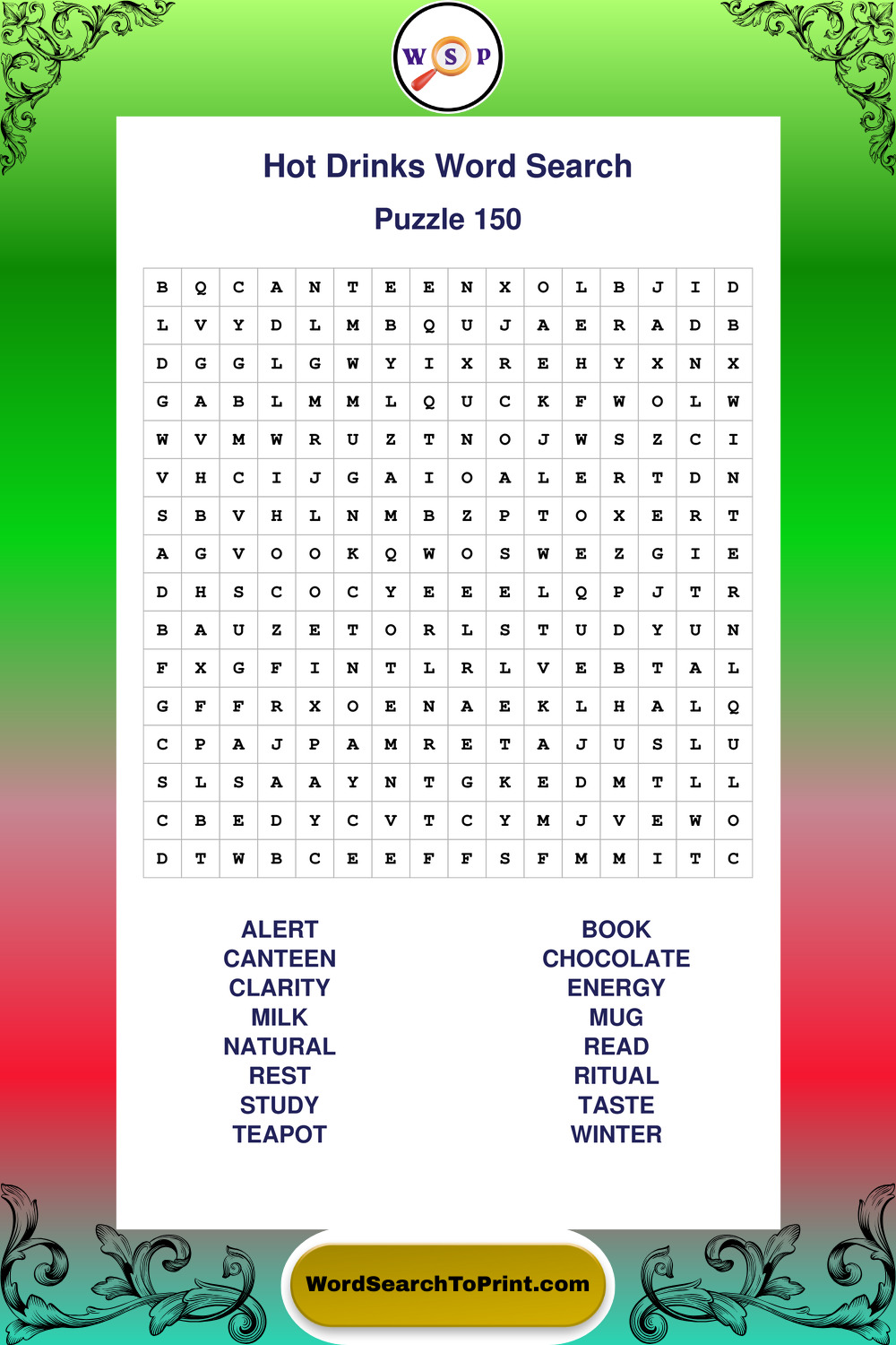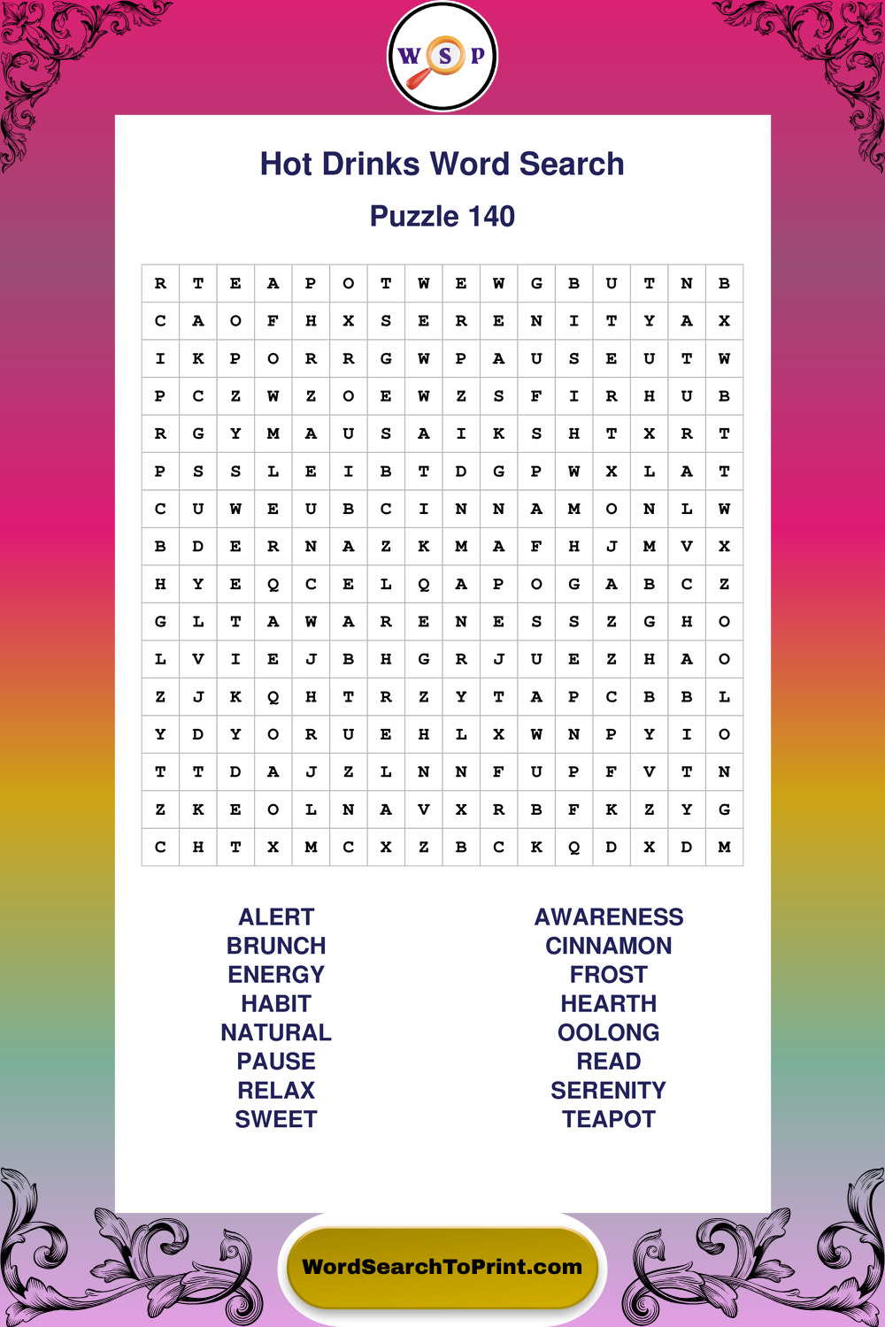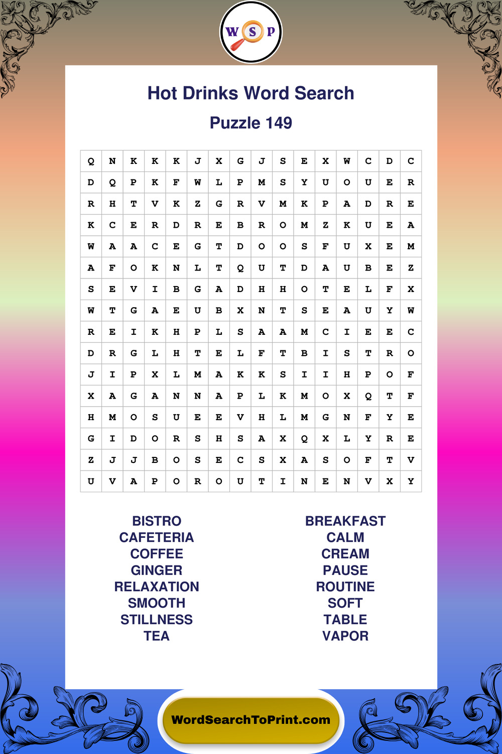Enjoy large print Hot Drinks wordsearches that balance clarity, simplicity, and enjoyable mental activity.