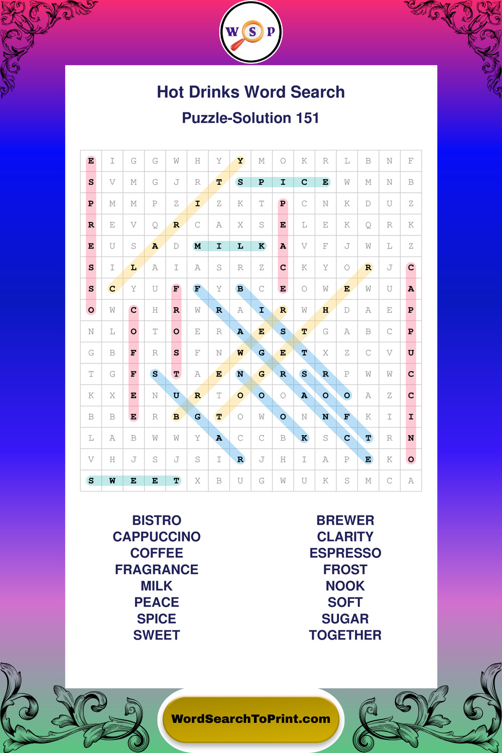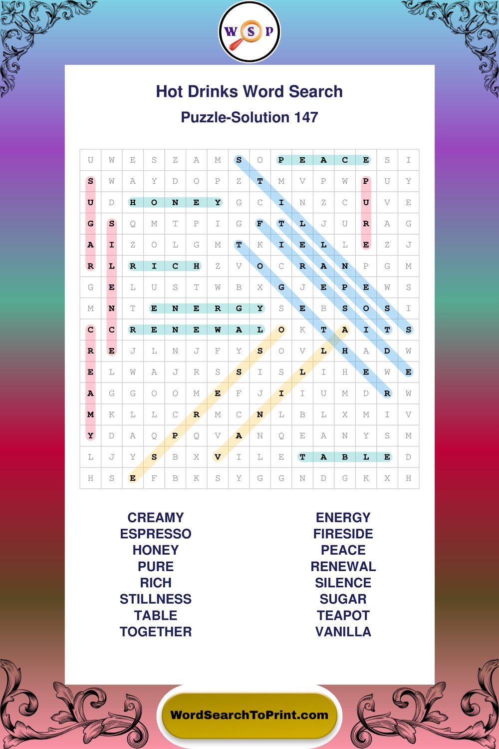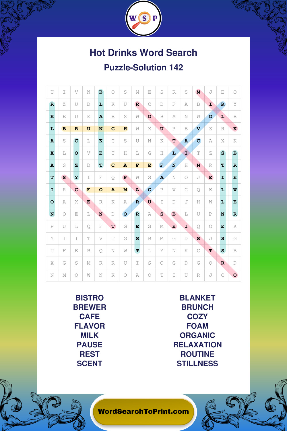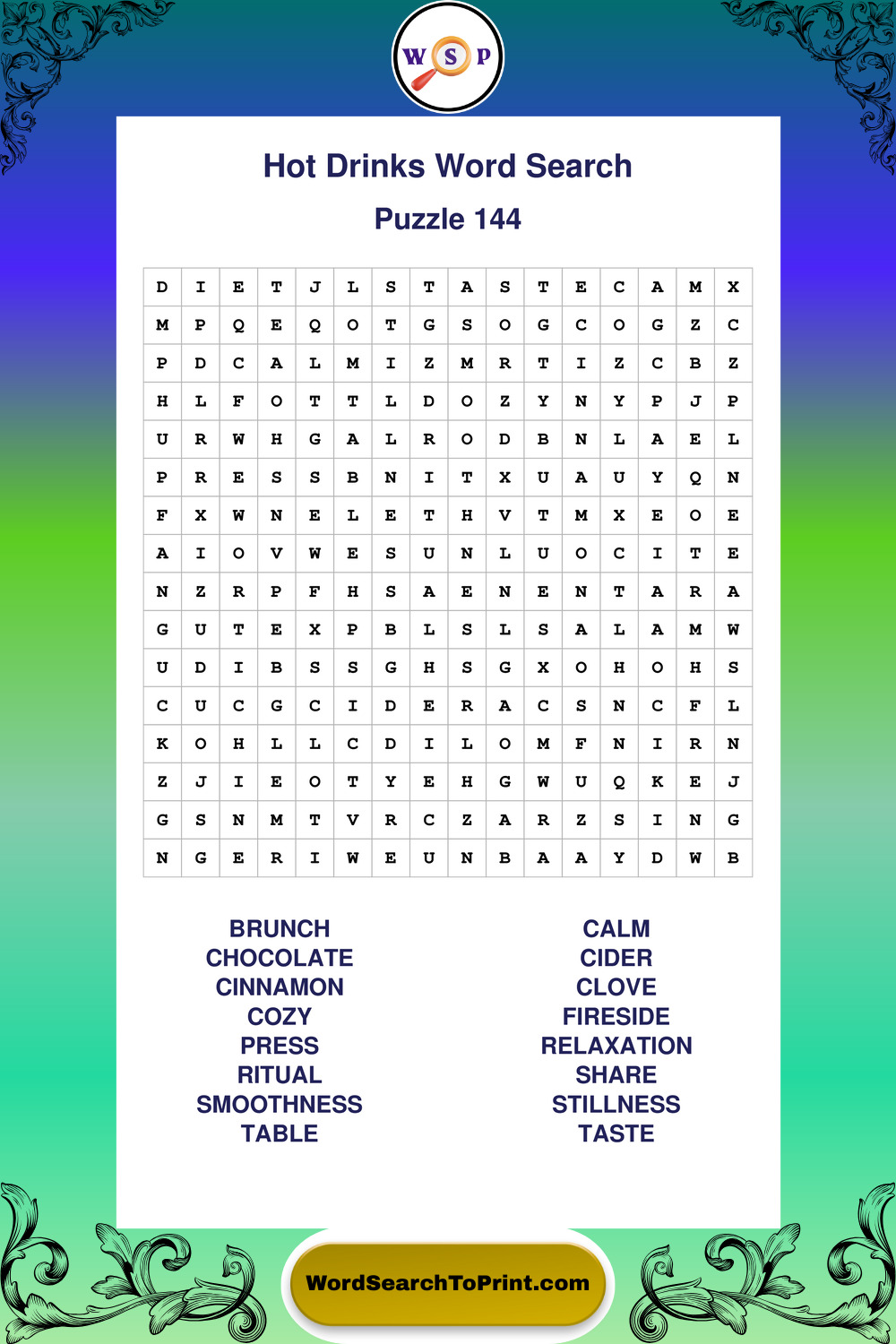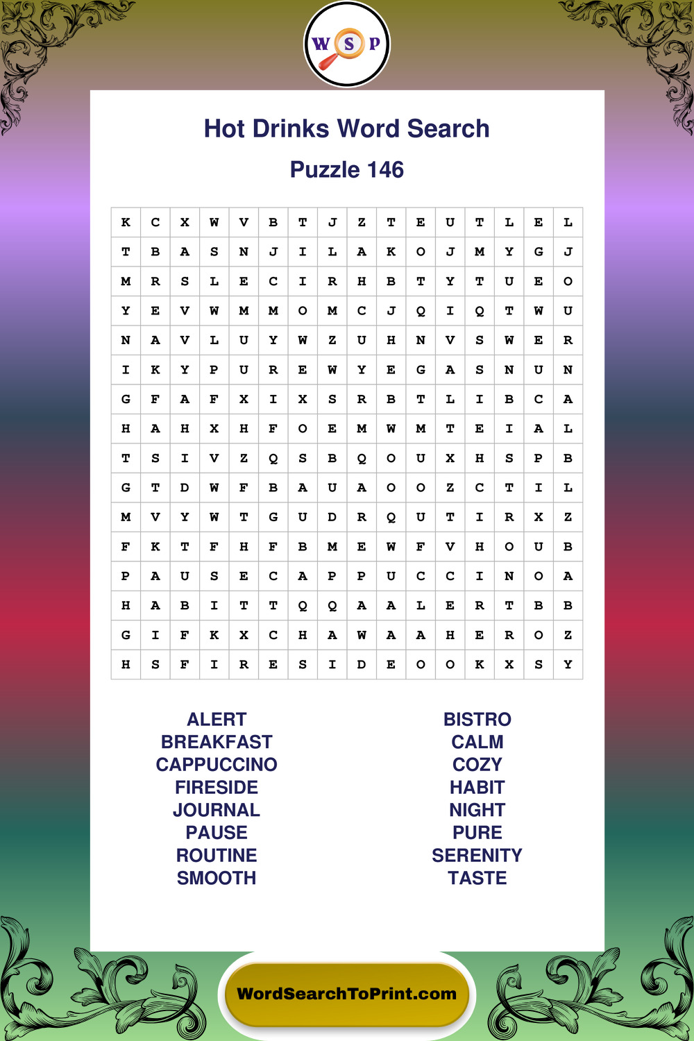 Enjoy large print Hot Drinks wordsearches that balance clarity, simplicity, and enjoyable mental activity.