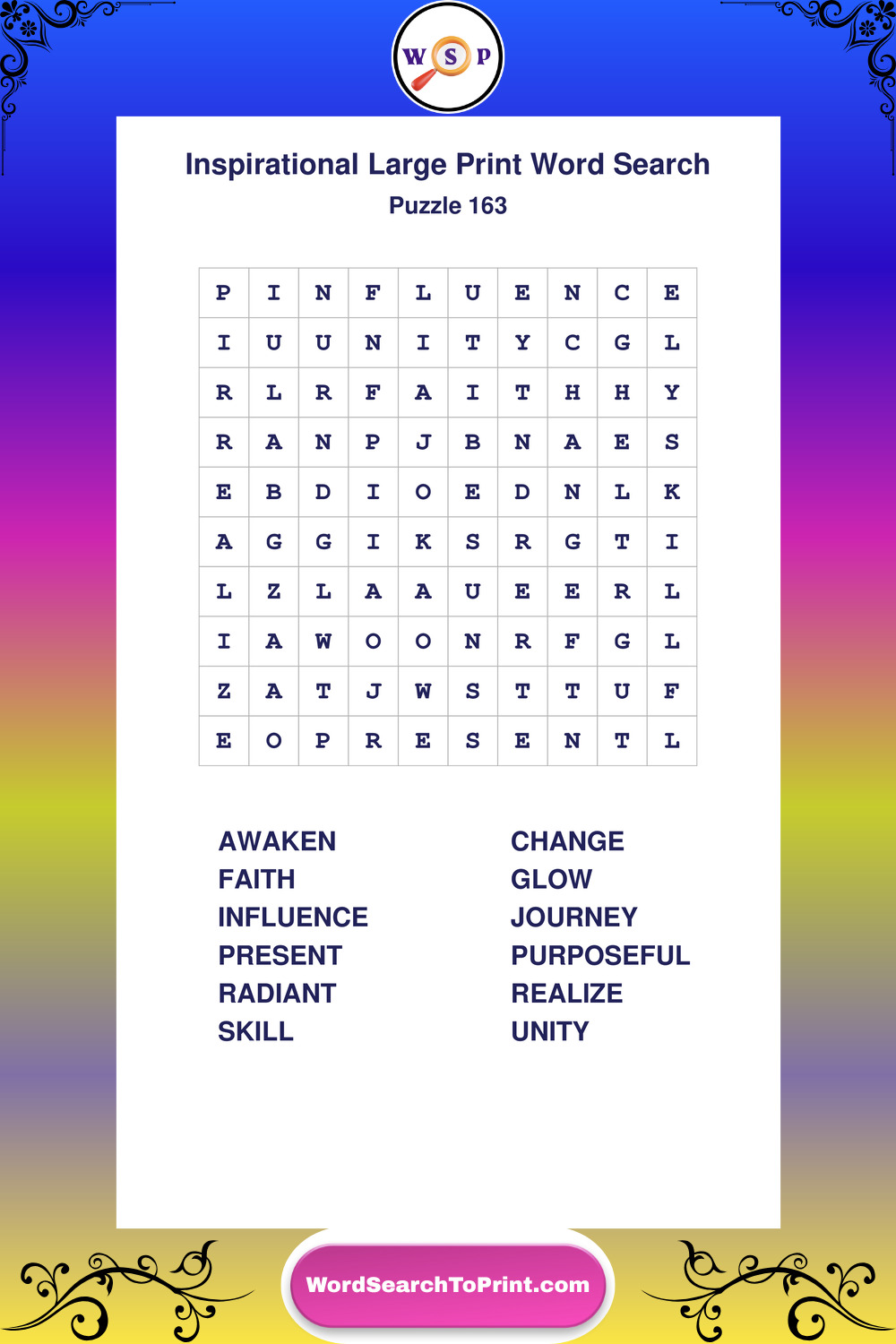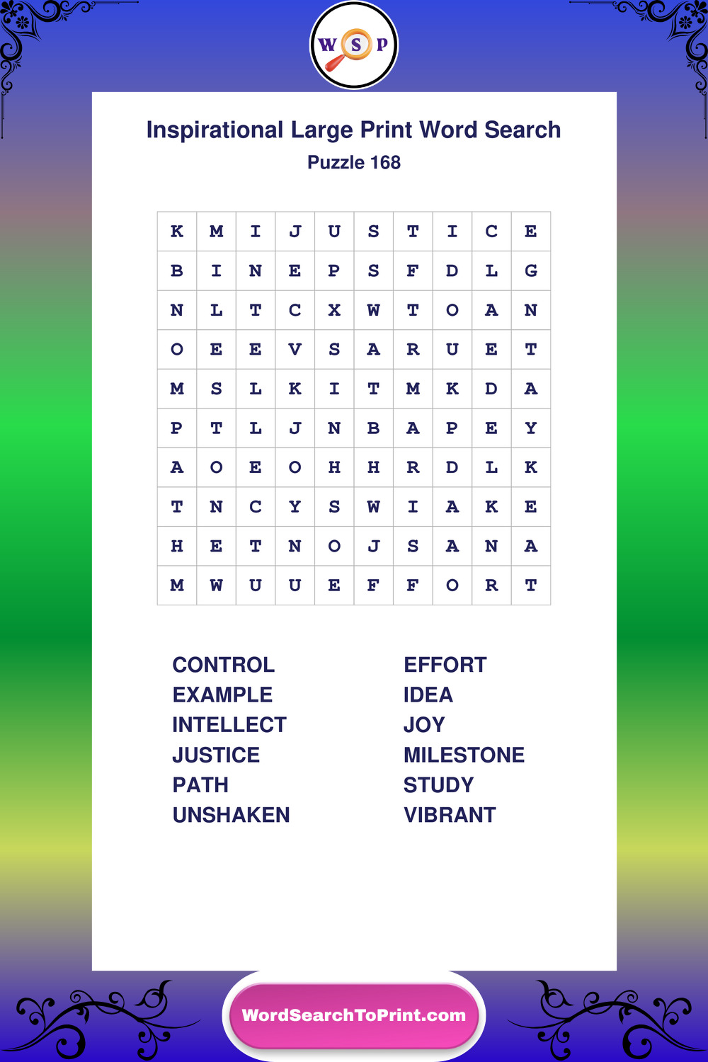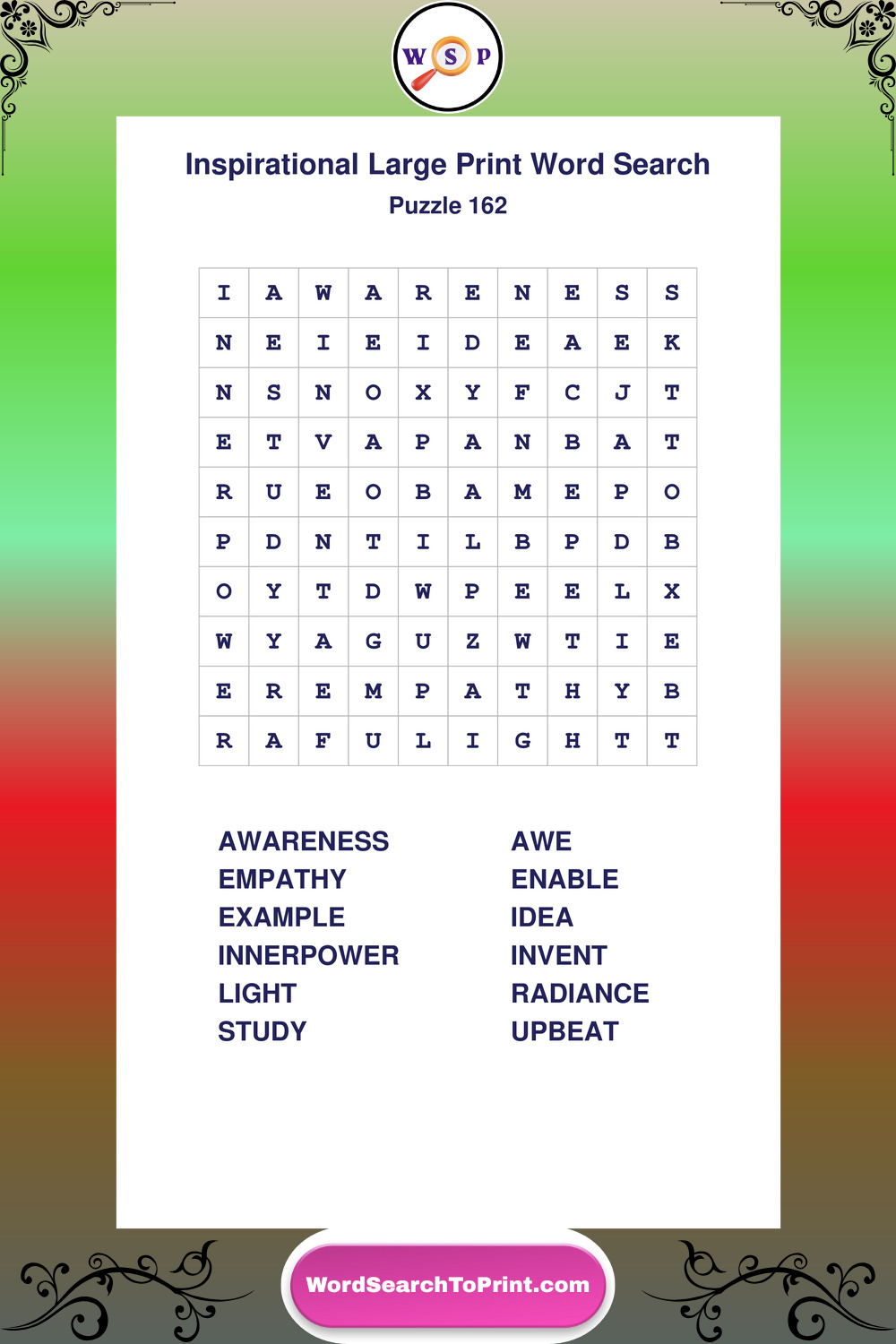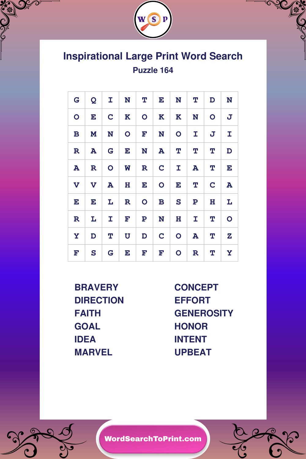 Discover free printable Large Print Inspirational wordsearches β€” a fun way to boost positivity and motivation. Click any puzzle below to print or download instantly.