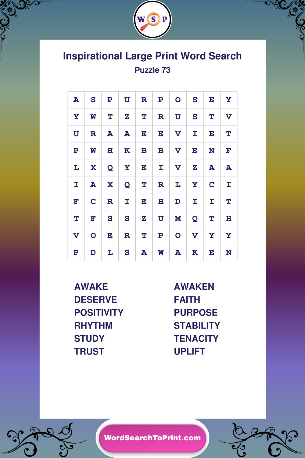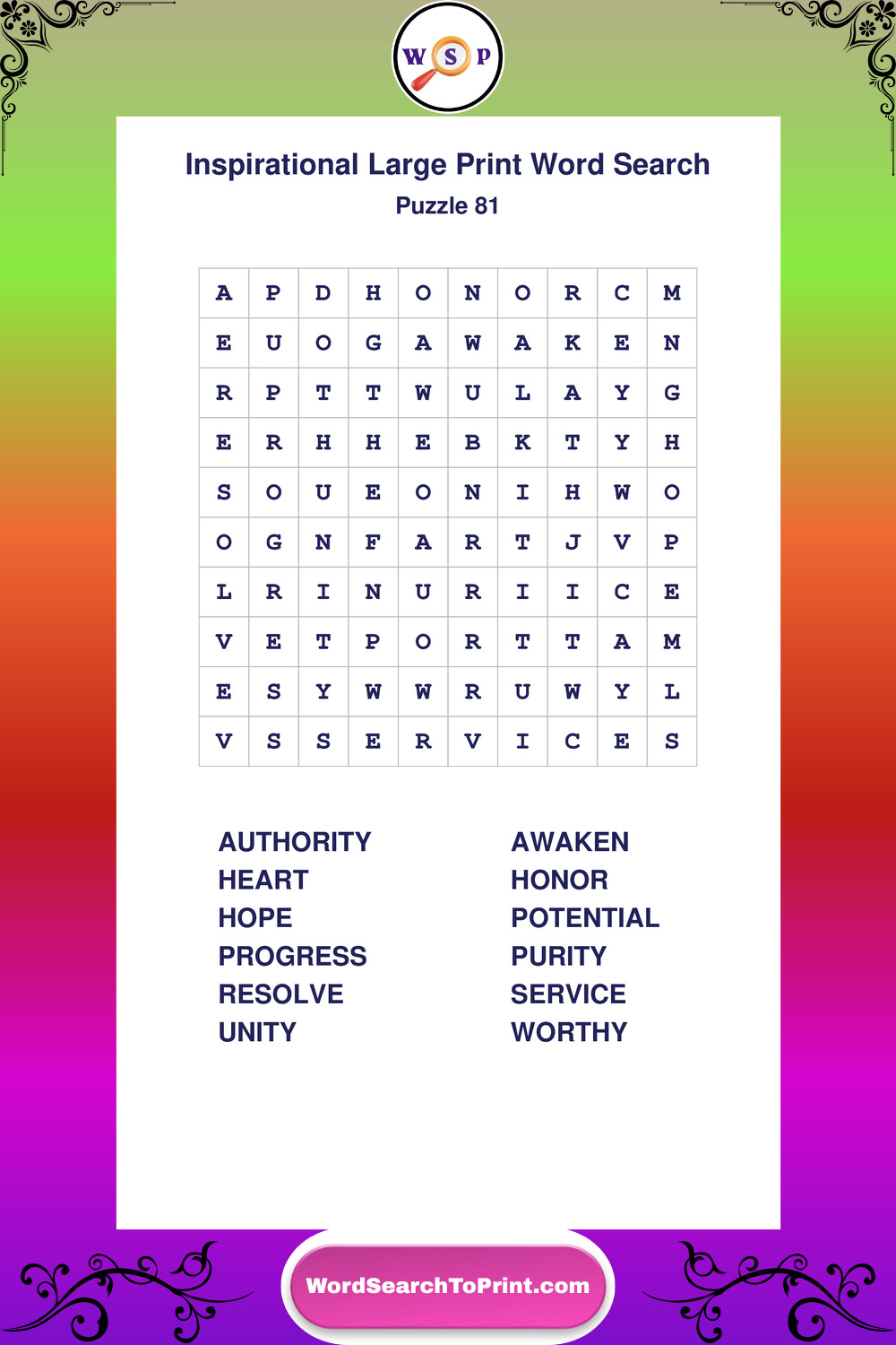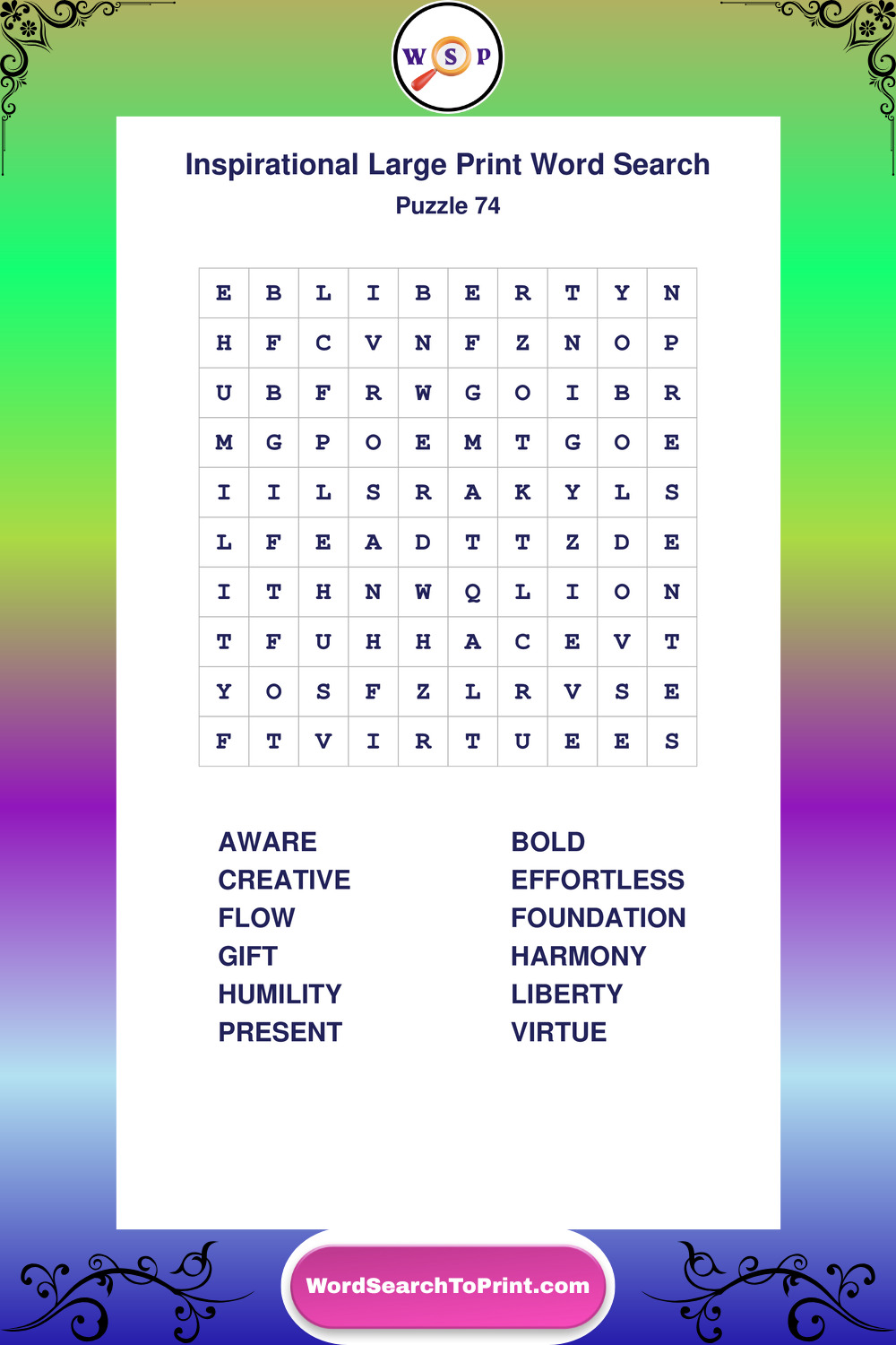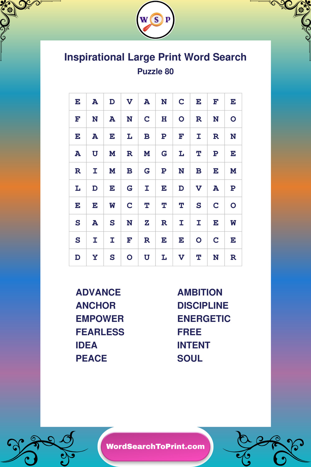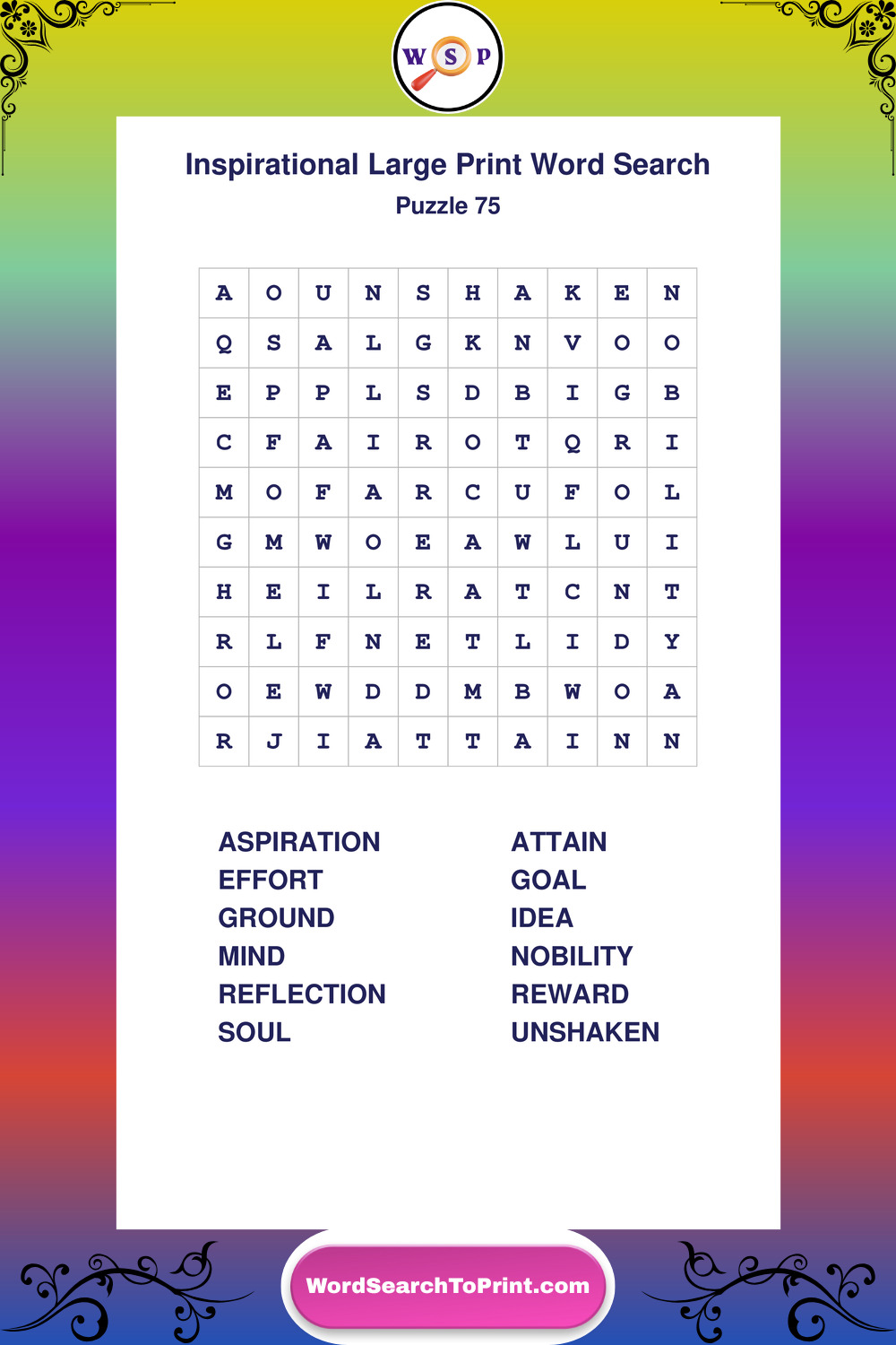 Discover free printable Large Print Inspirational wordsearches β€” a fun way to boost positivity and motivation. Click any puzzle below to print or download instantly.