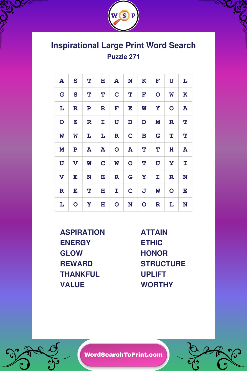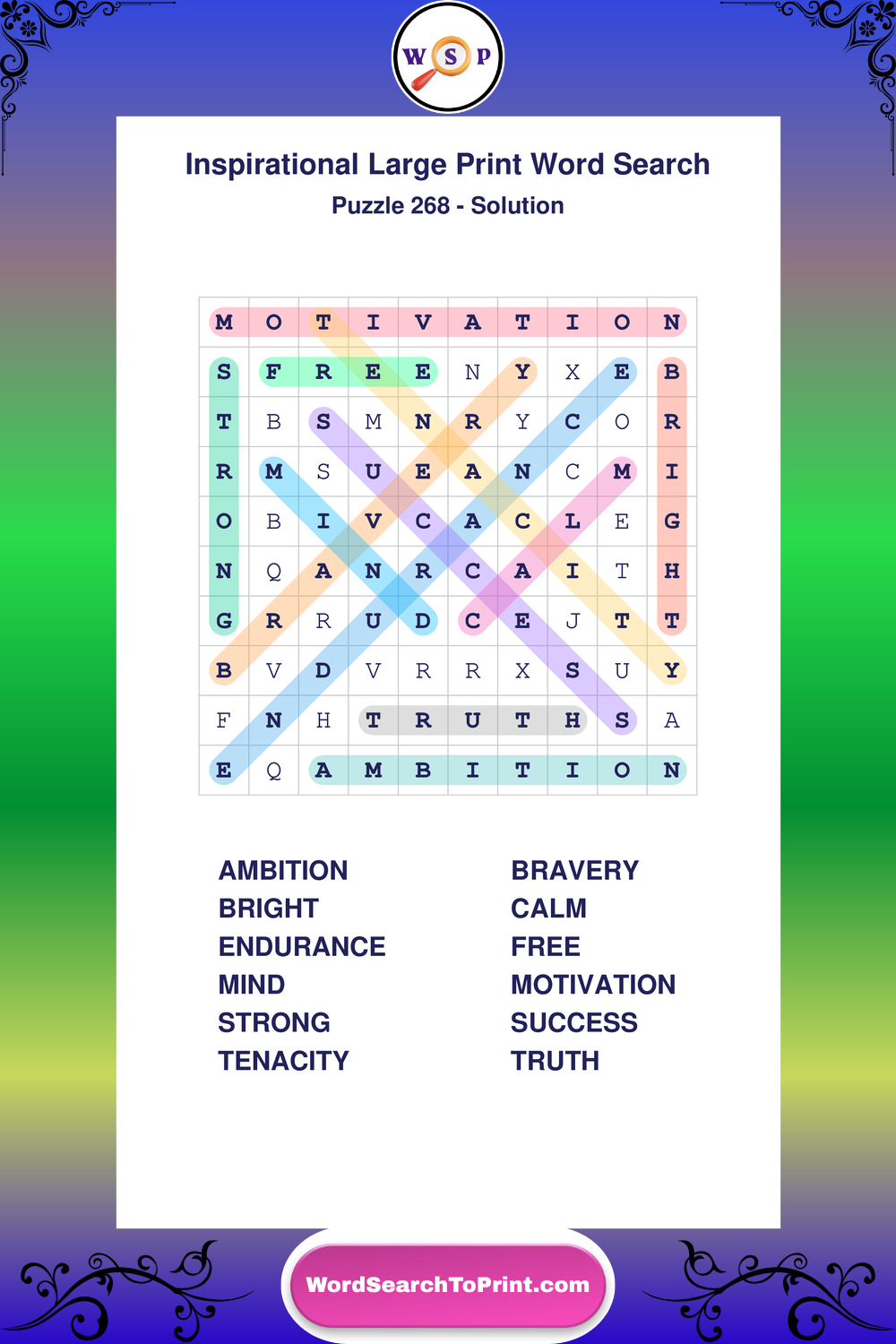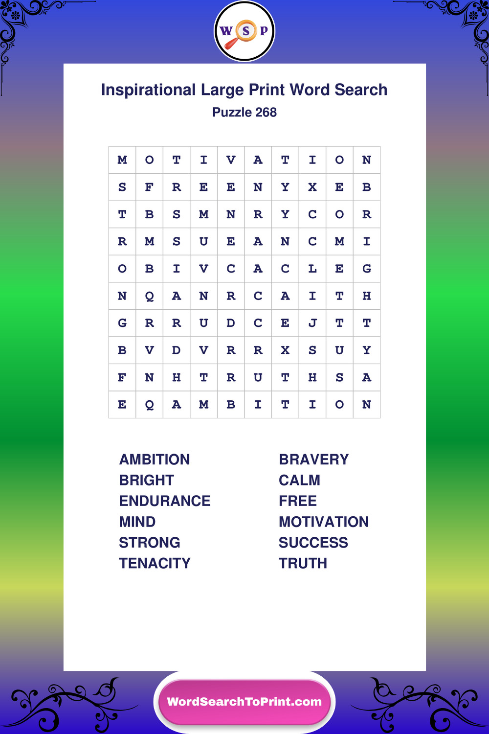 Discover free printable Large Print Inspirational wordsearches β€” a fun way to boost positivity and motivation. Click any puzzle below to print or download instantly.