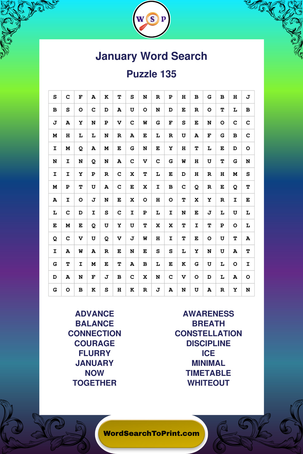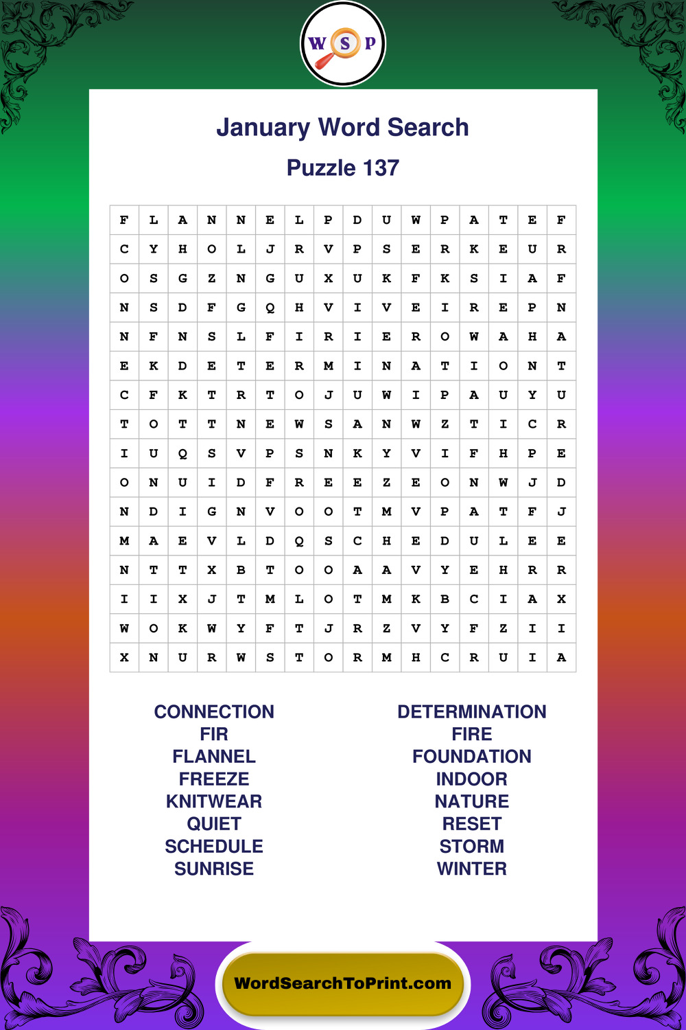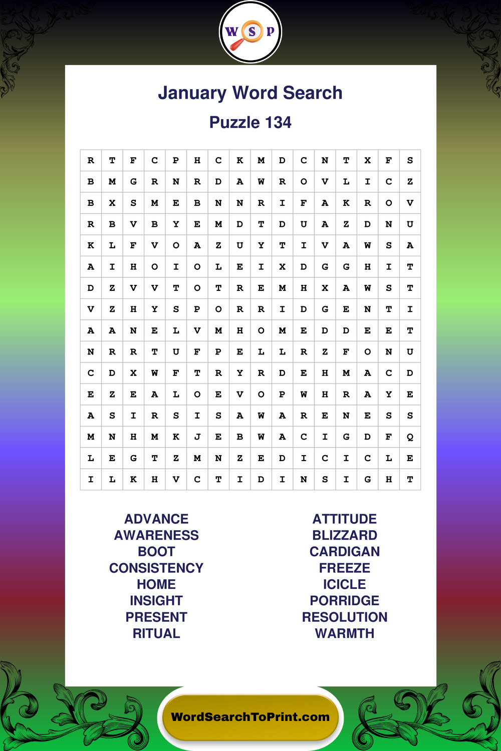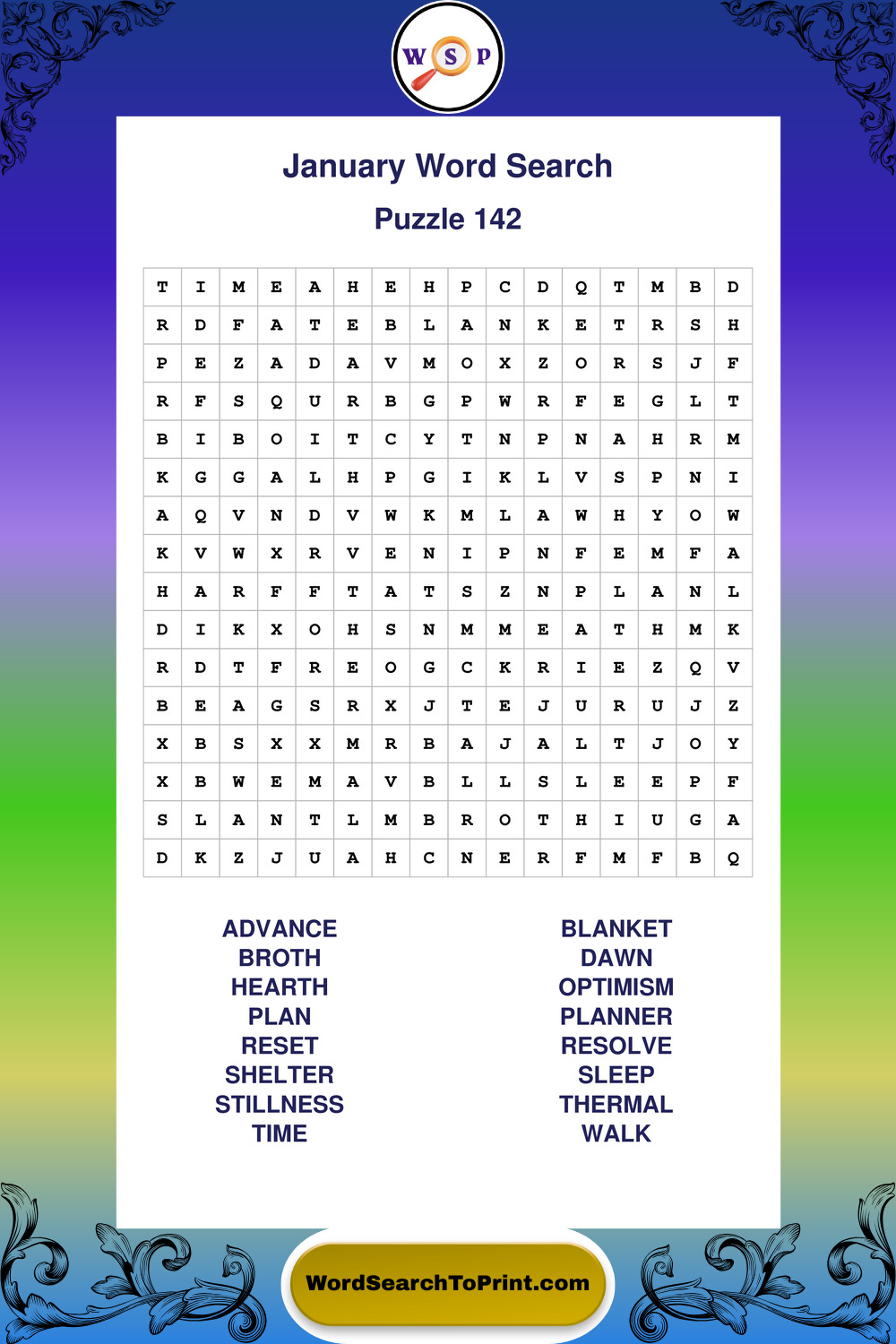 This collection of large print January wordsearches is designed for smooth reading, gentle focus, and enjoyable puzzle time.