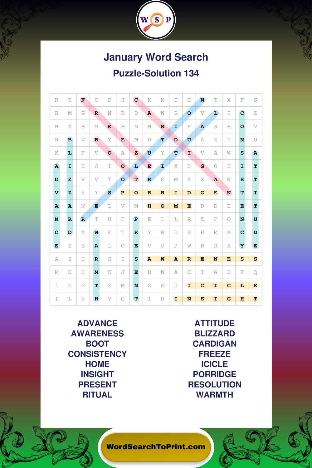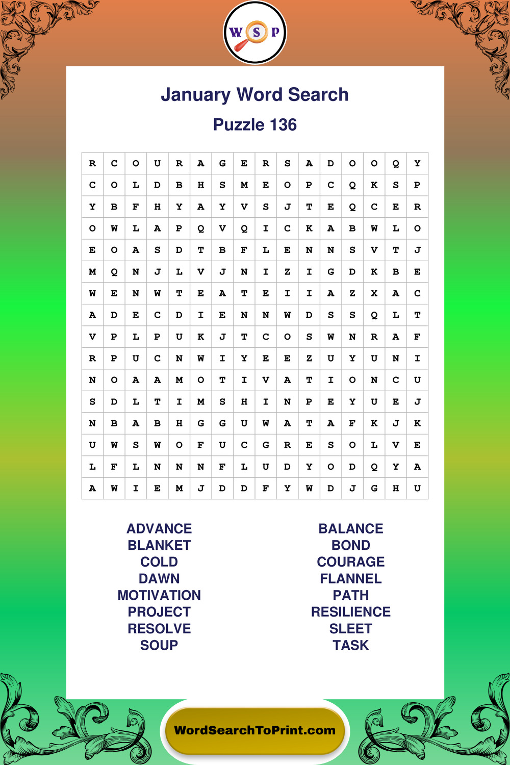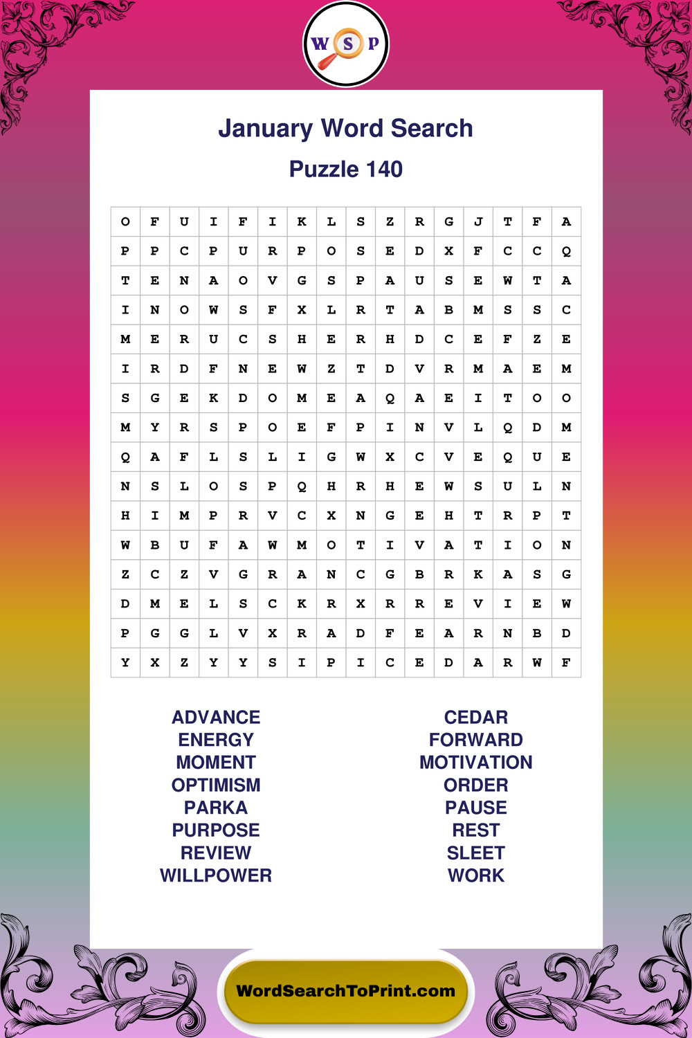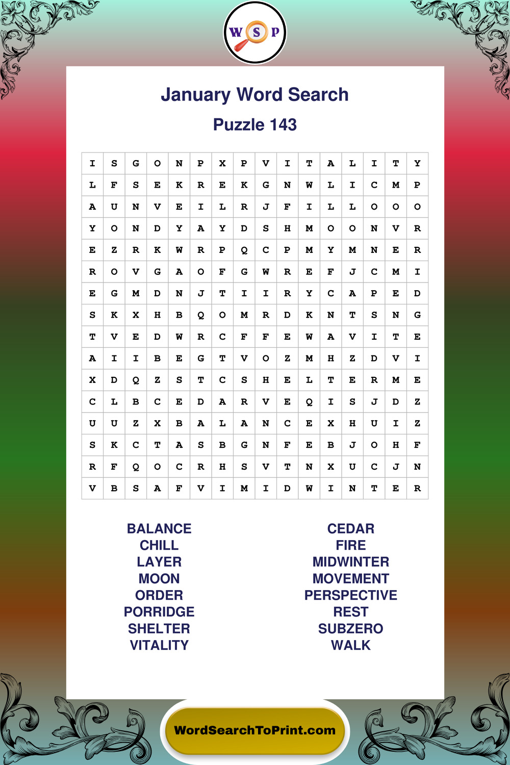 This collection of large print January wordsearches is designed for smooth reading, gentle focus, and enjoyable puzzle time.