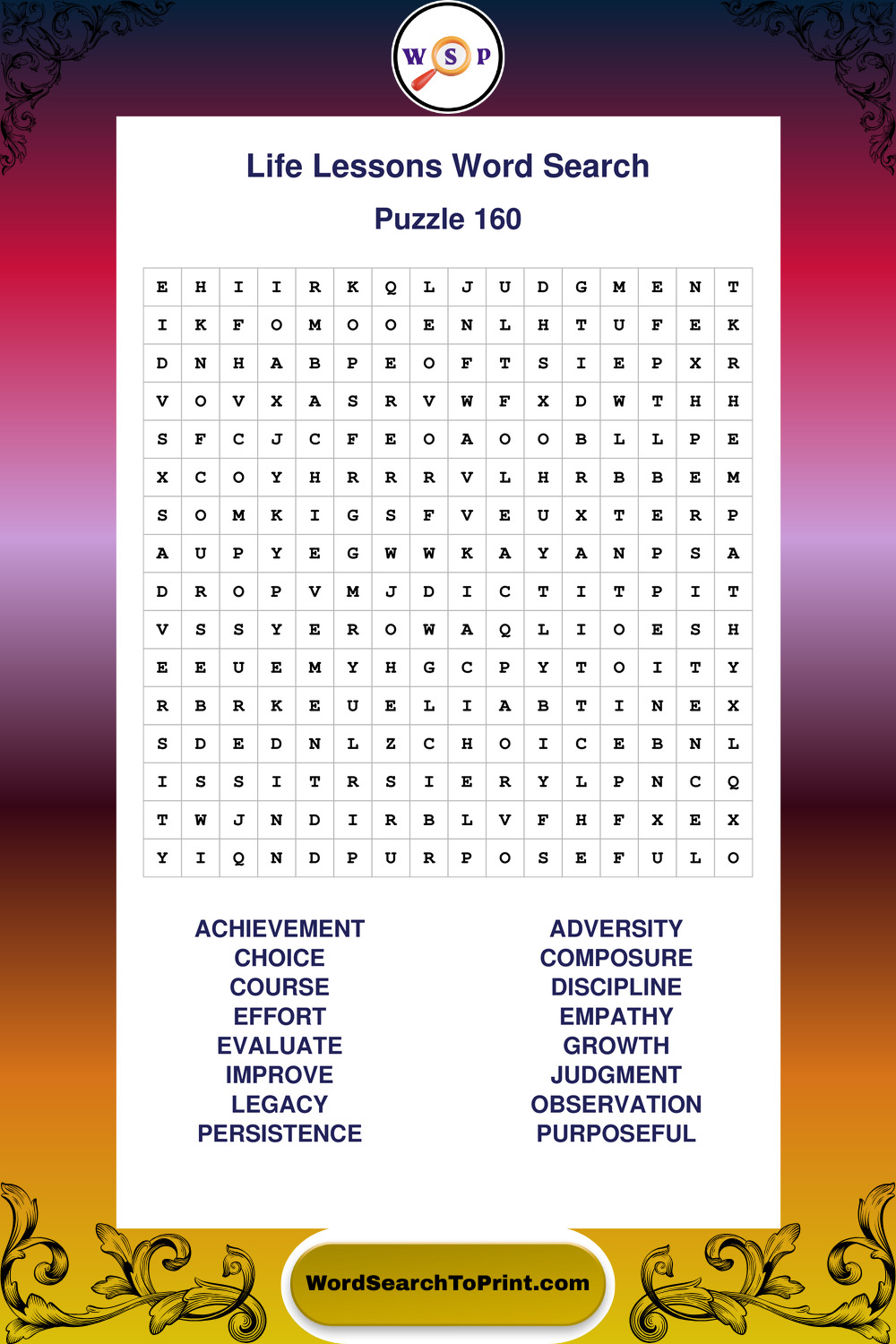 These puzzles focus on motivation, goal setting, life lessons, inspiration, and personal development concepts. These puzzles make it enjoyable to explore this theme while improving focus and reinforcing key terms. You may also enjoy our Wisdom word search puzzles and Inspiration word search puzzles.