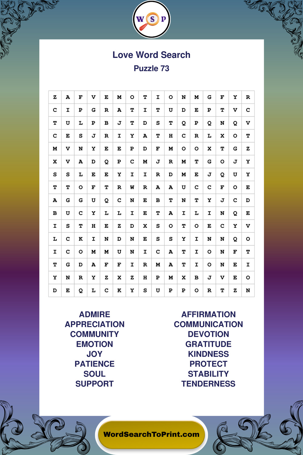 These puzzles focus on family, friendship, affection, kindness, and meaningful personal connections. They provide a relaxing and effective way to connect with this subject while supporting memory and language skills. You may also enjoy our Friendship word search puzzles and Family word search puzzles.