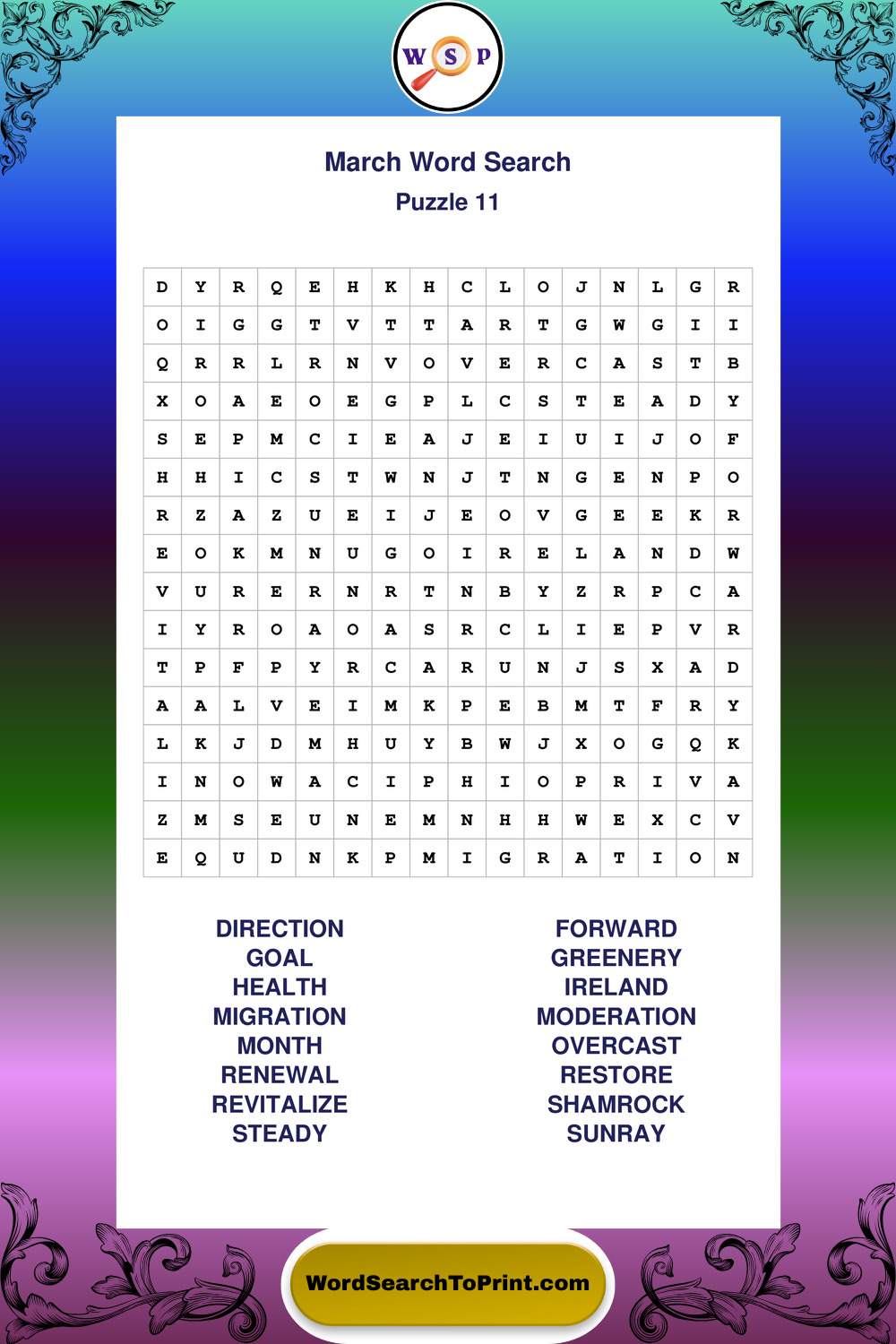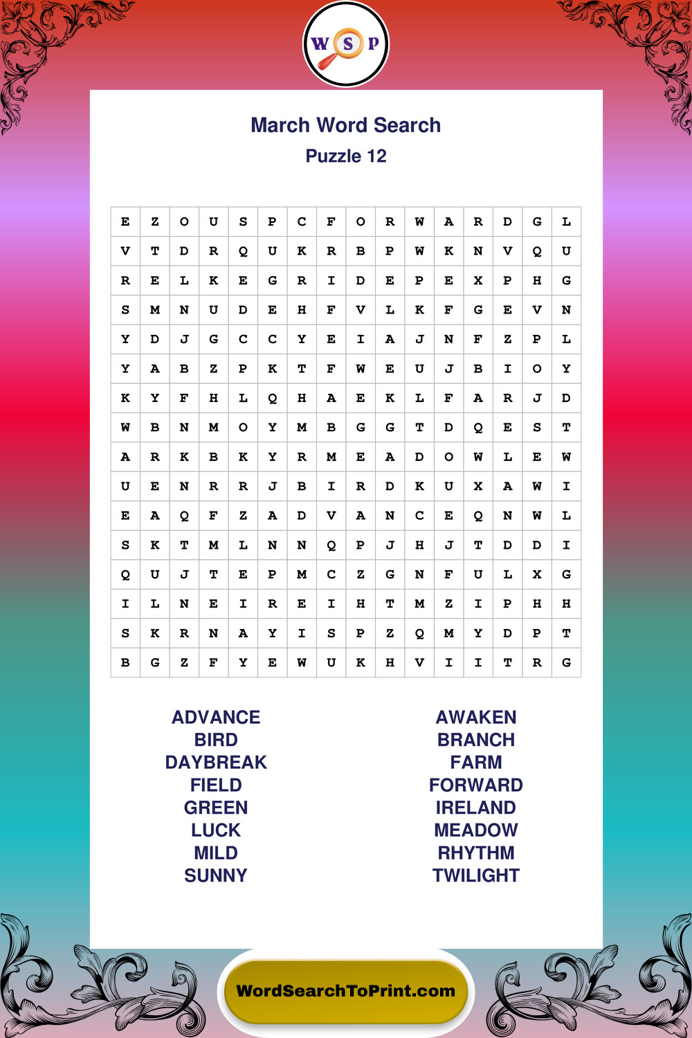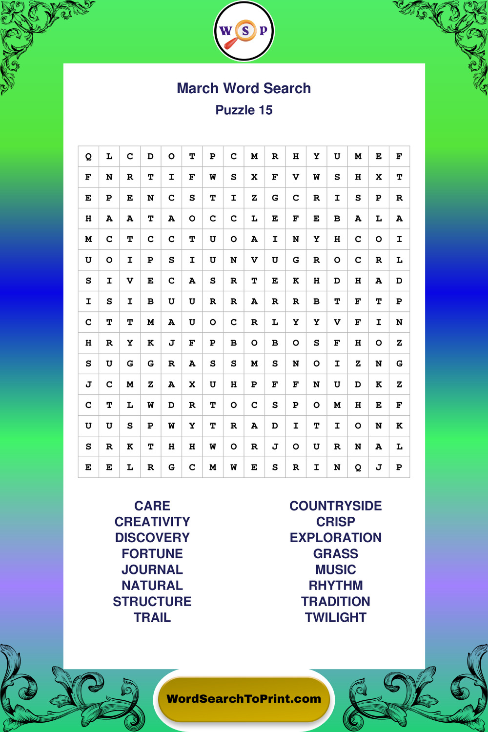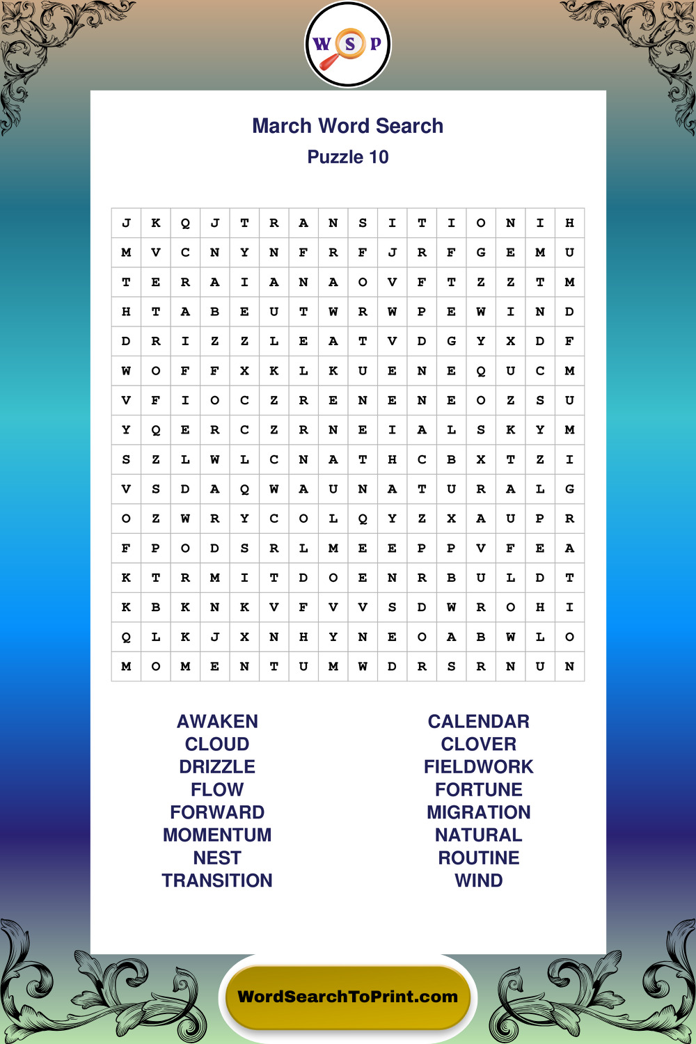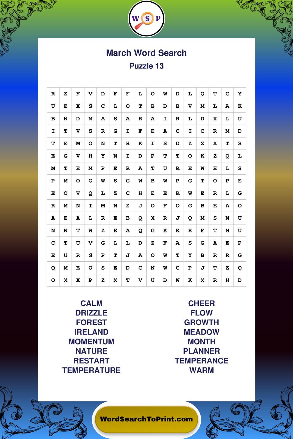 A relaxing collection of large print March wordsearches designed for comfortable solving and steady focus.