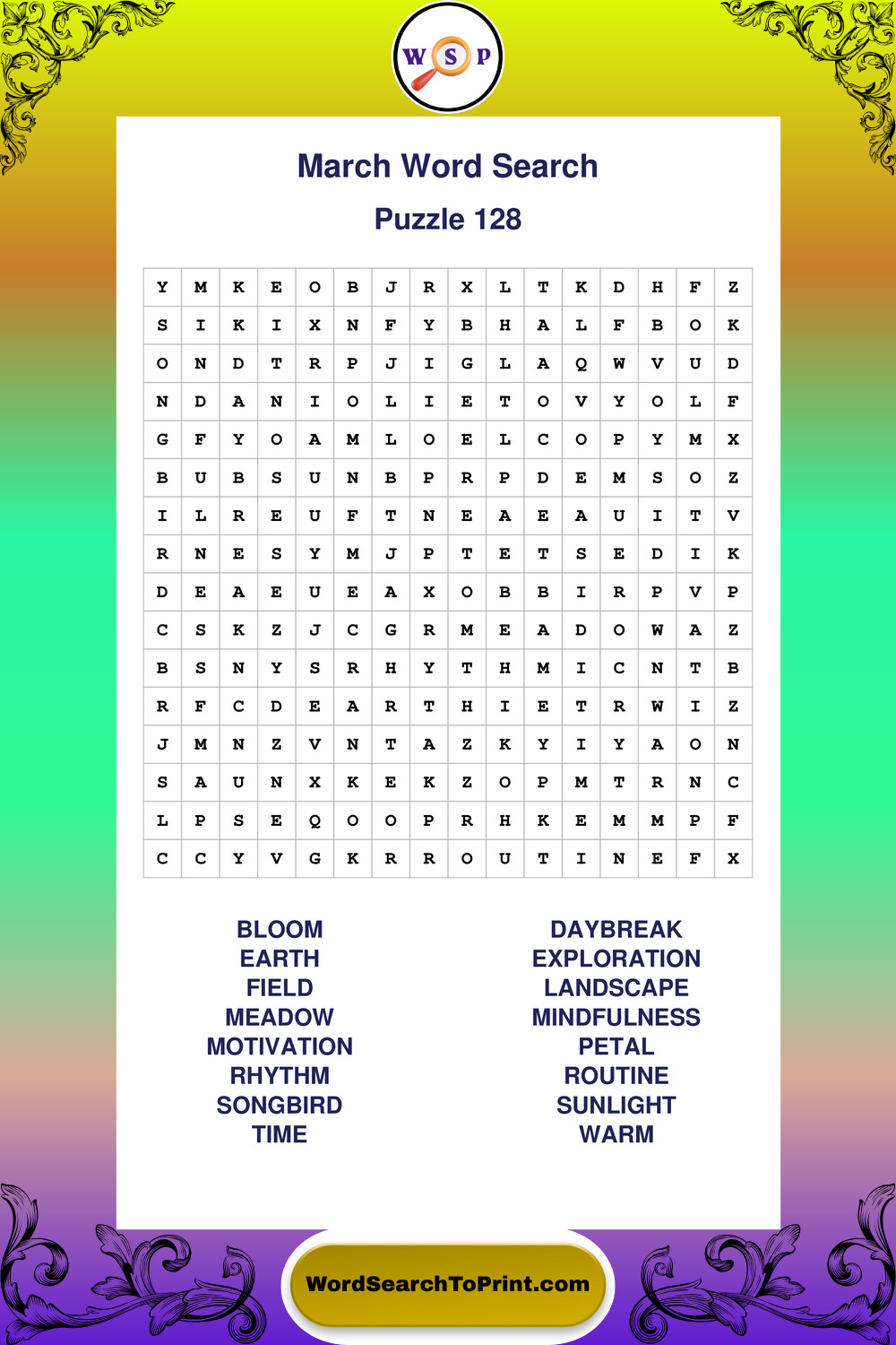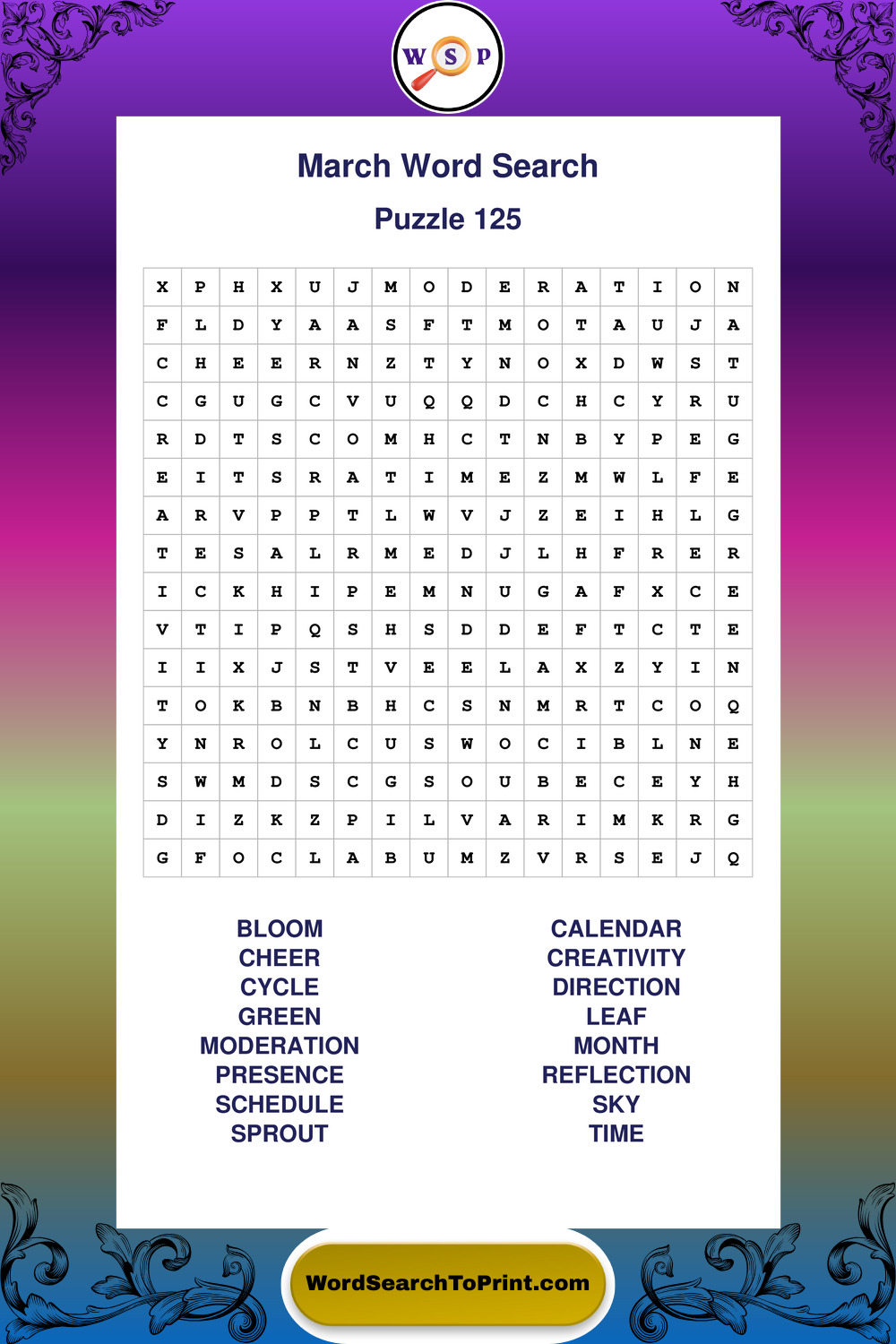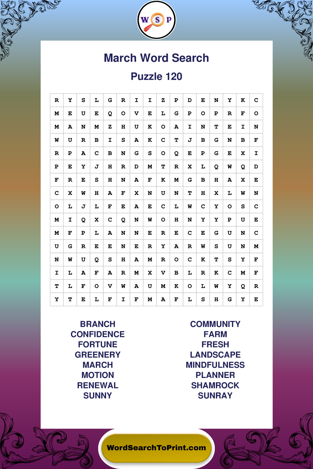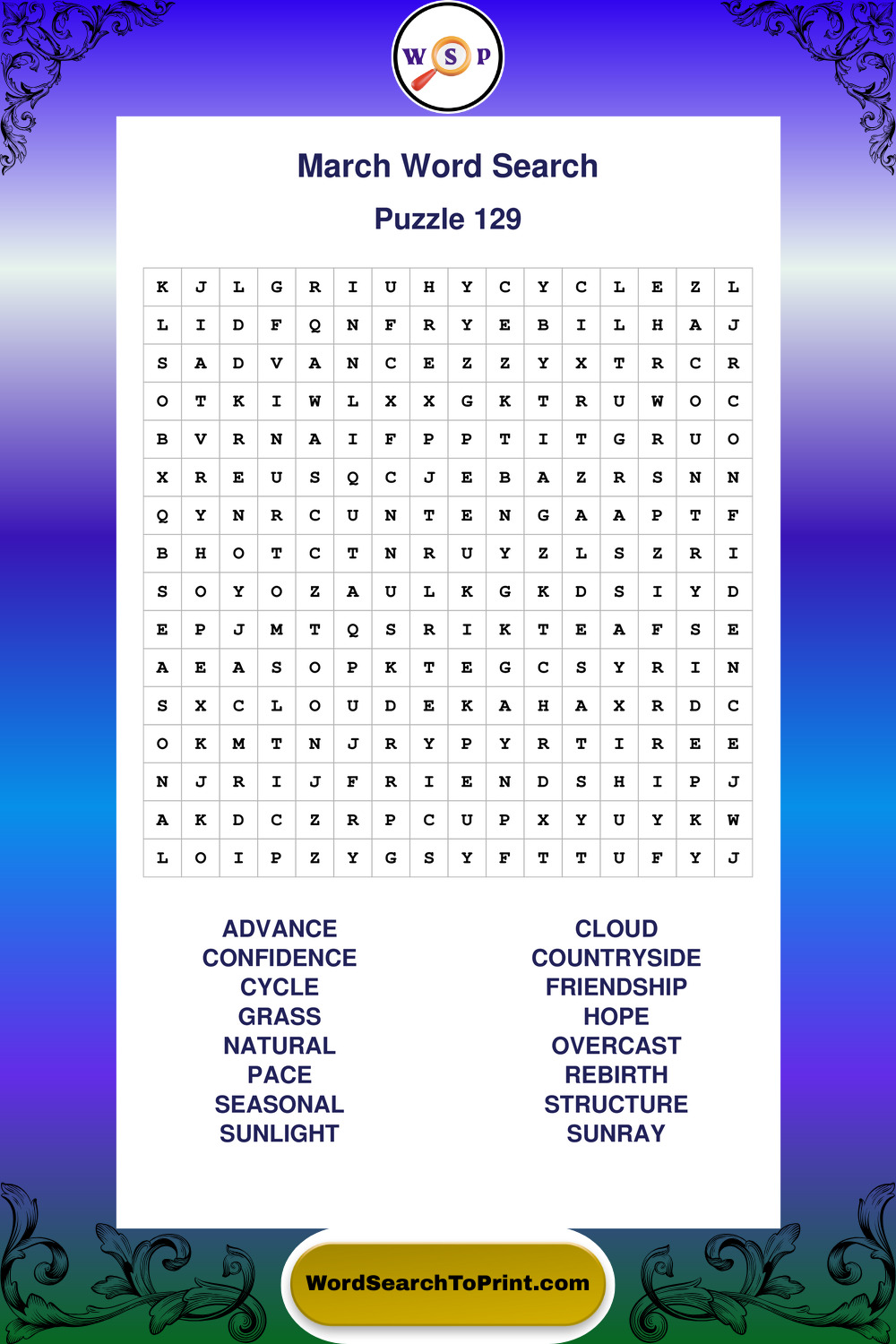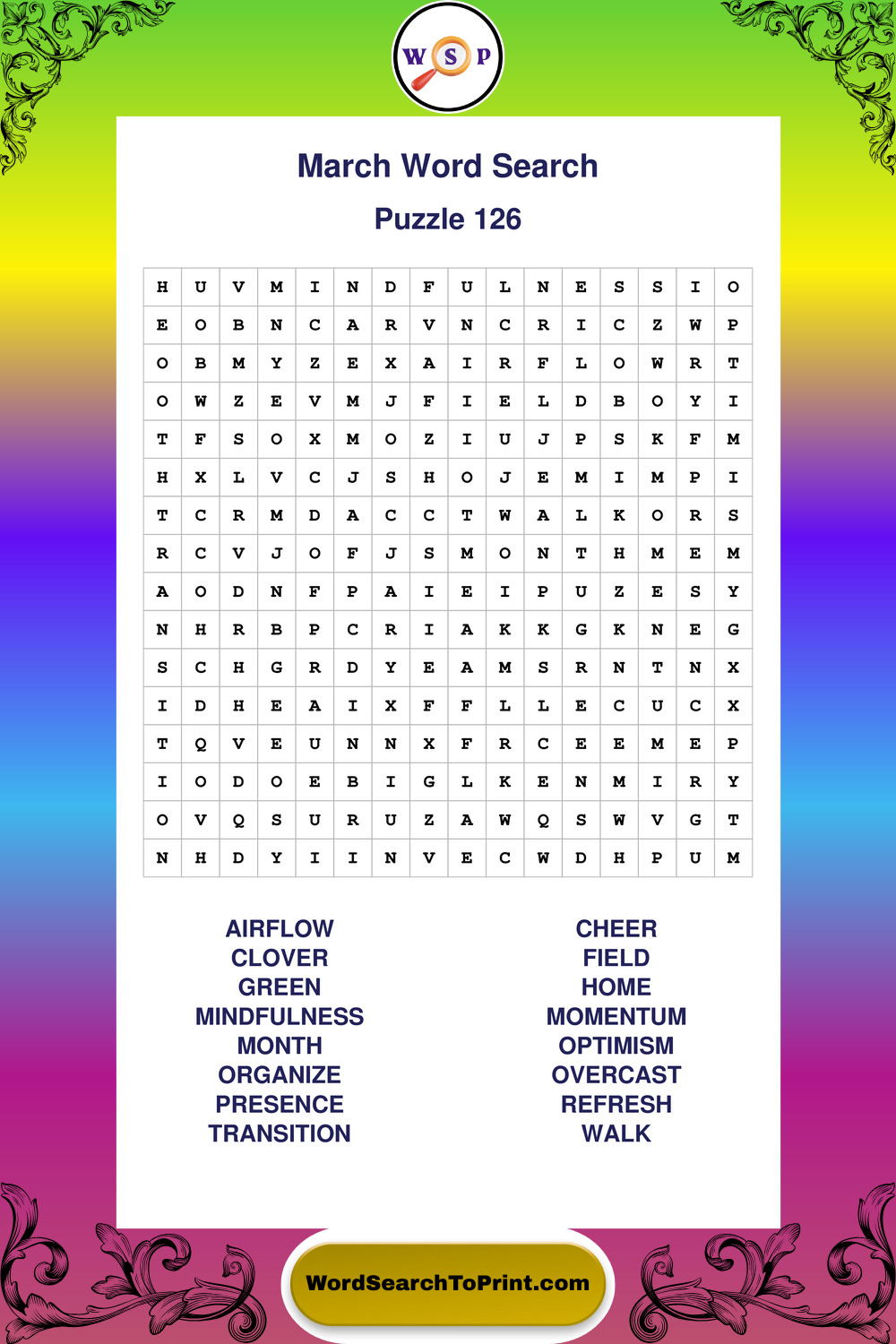 A relaxing collection of large print March wordsearches designed for comfortable solving and steady focus.