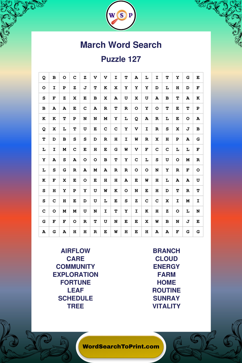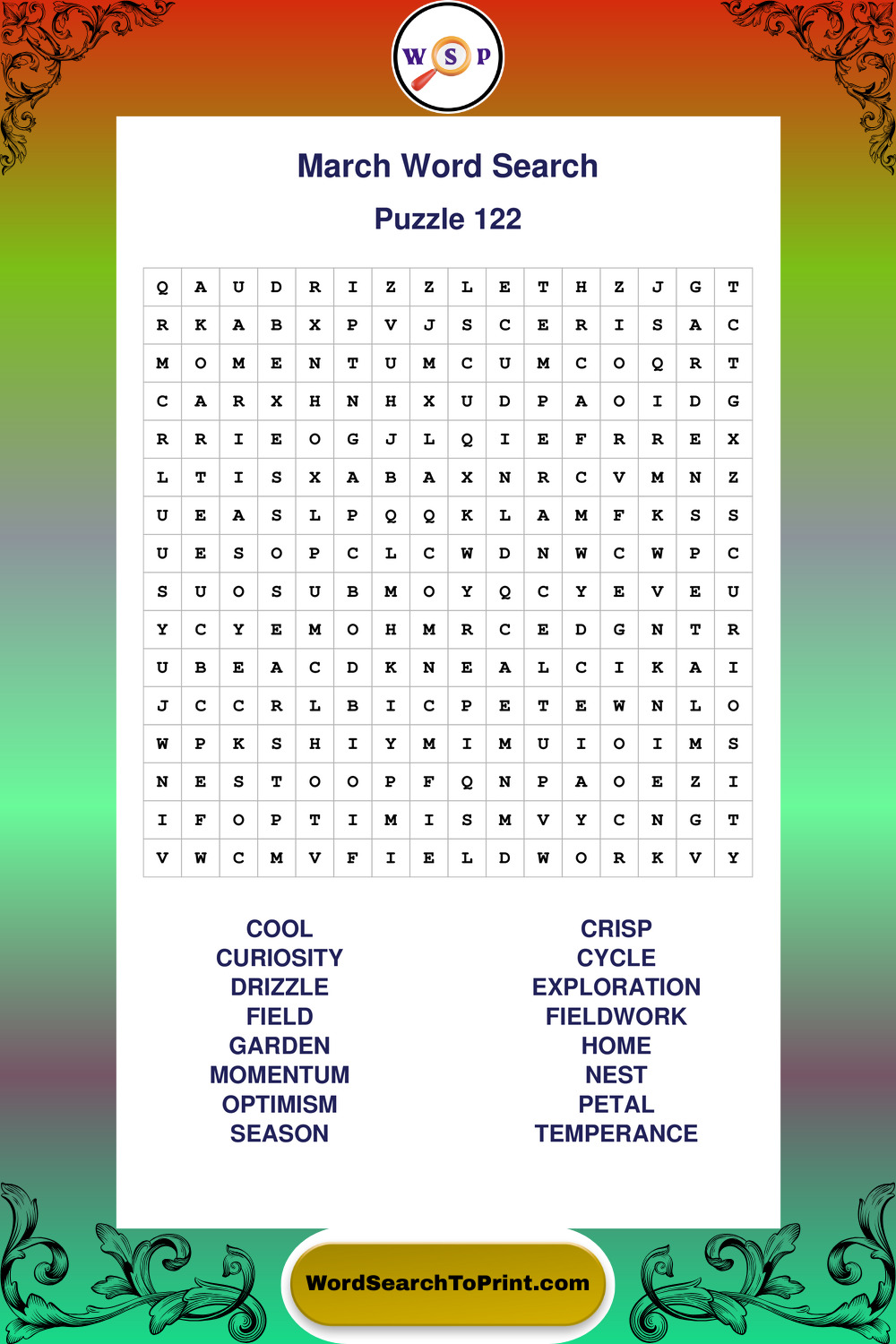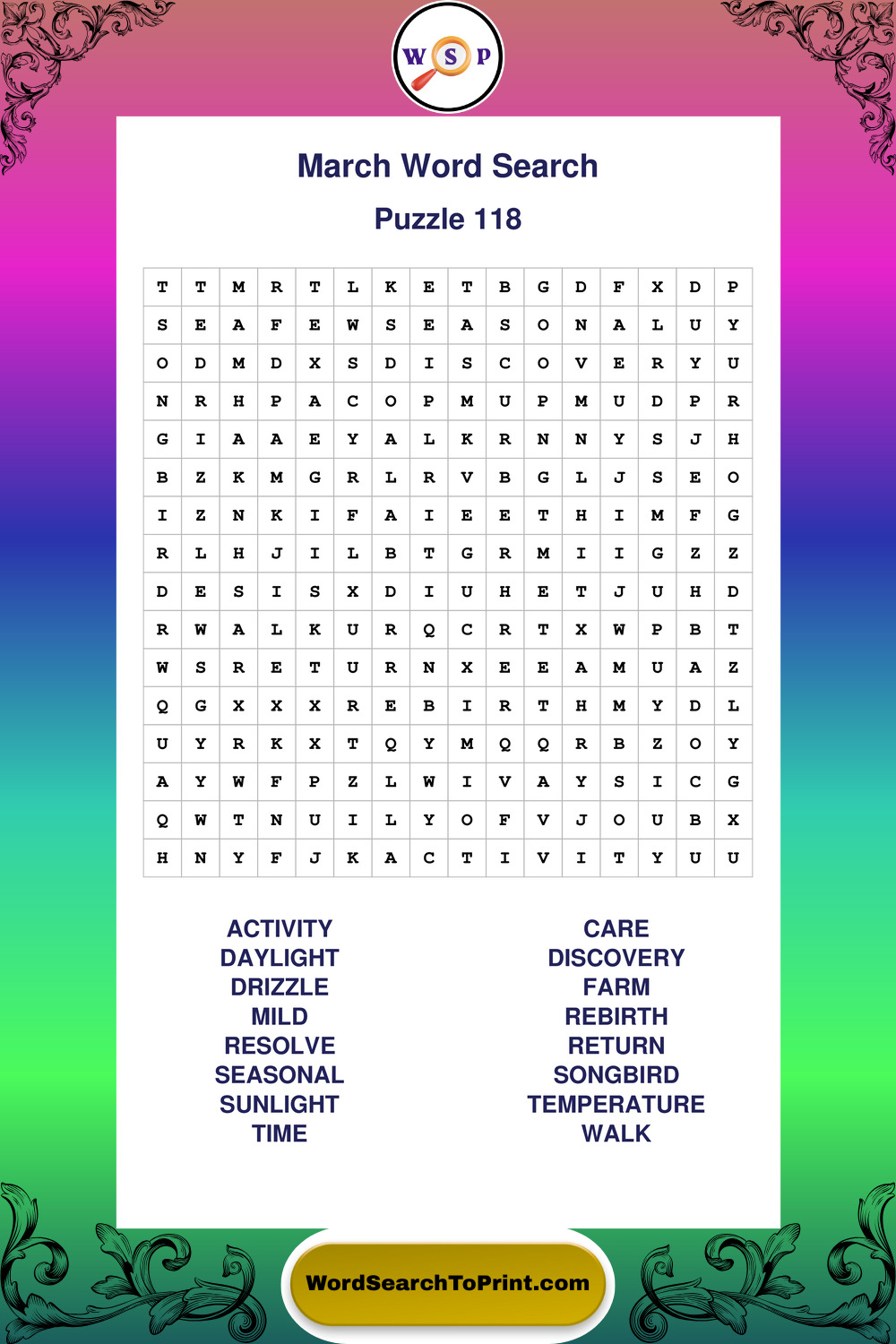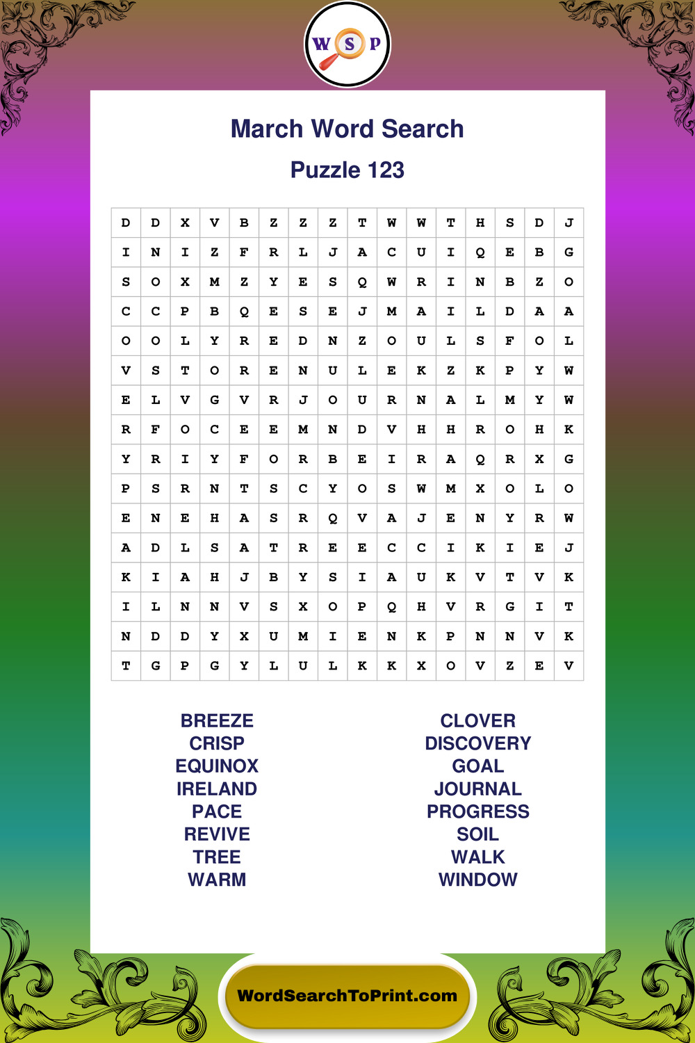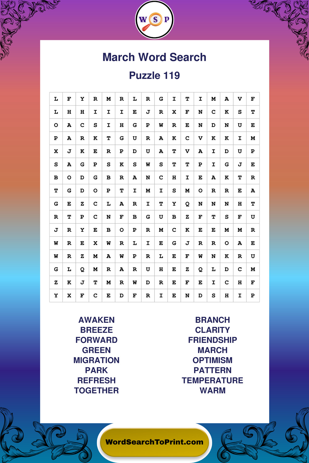 A relaxing collection of large print March wordsearches designed for comfortable solving and steady focus.