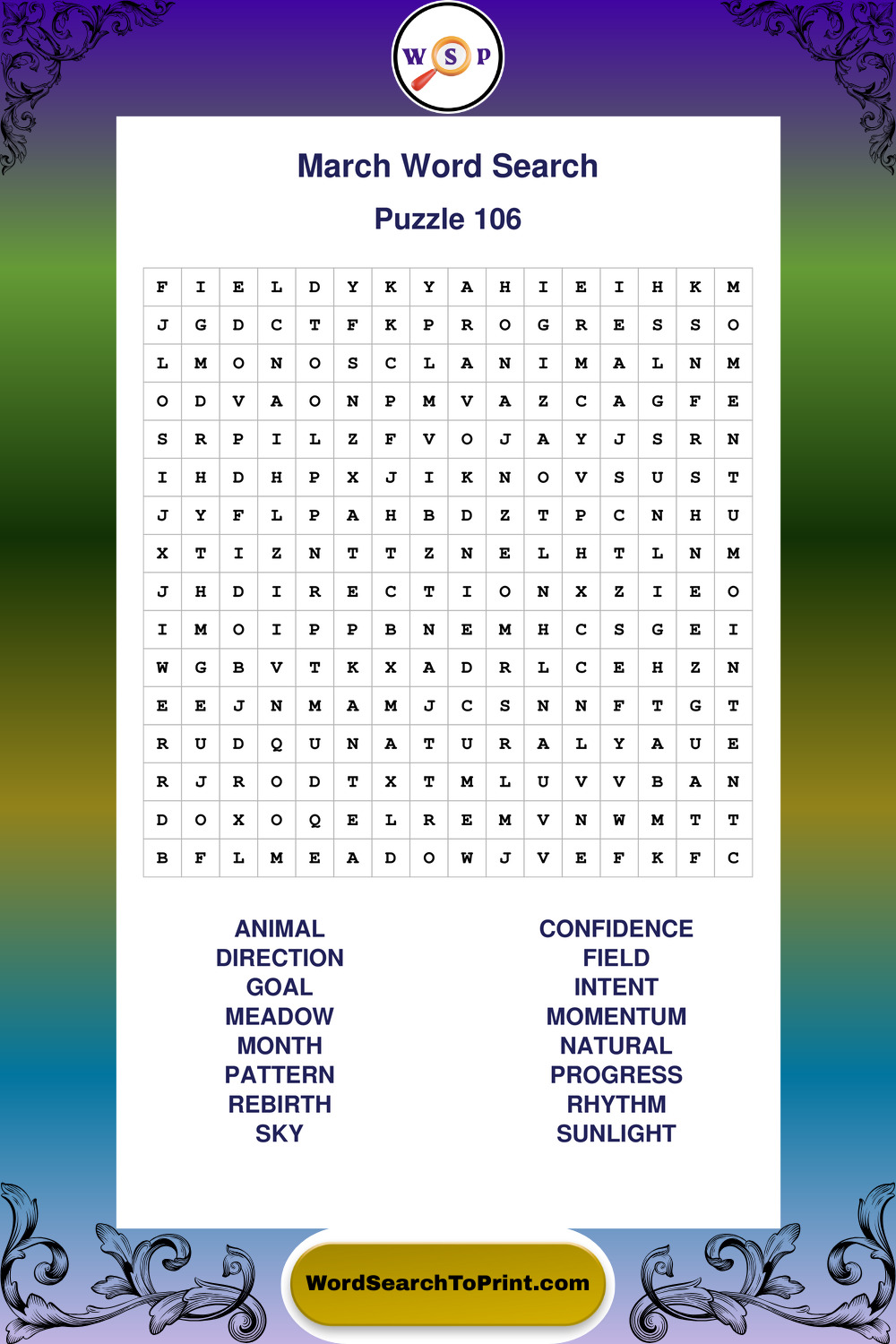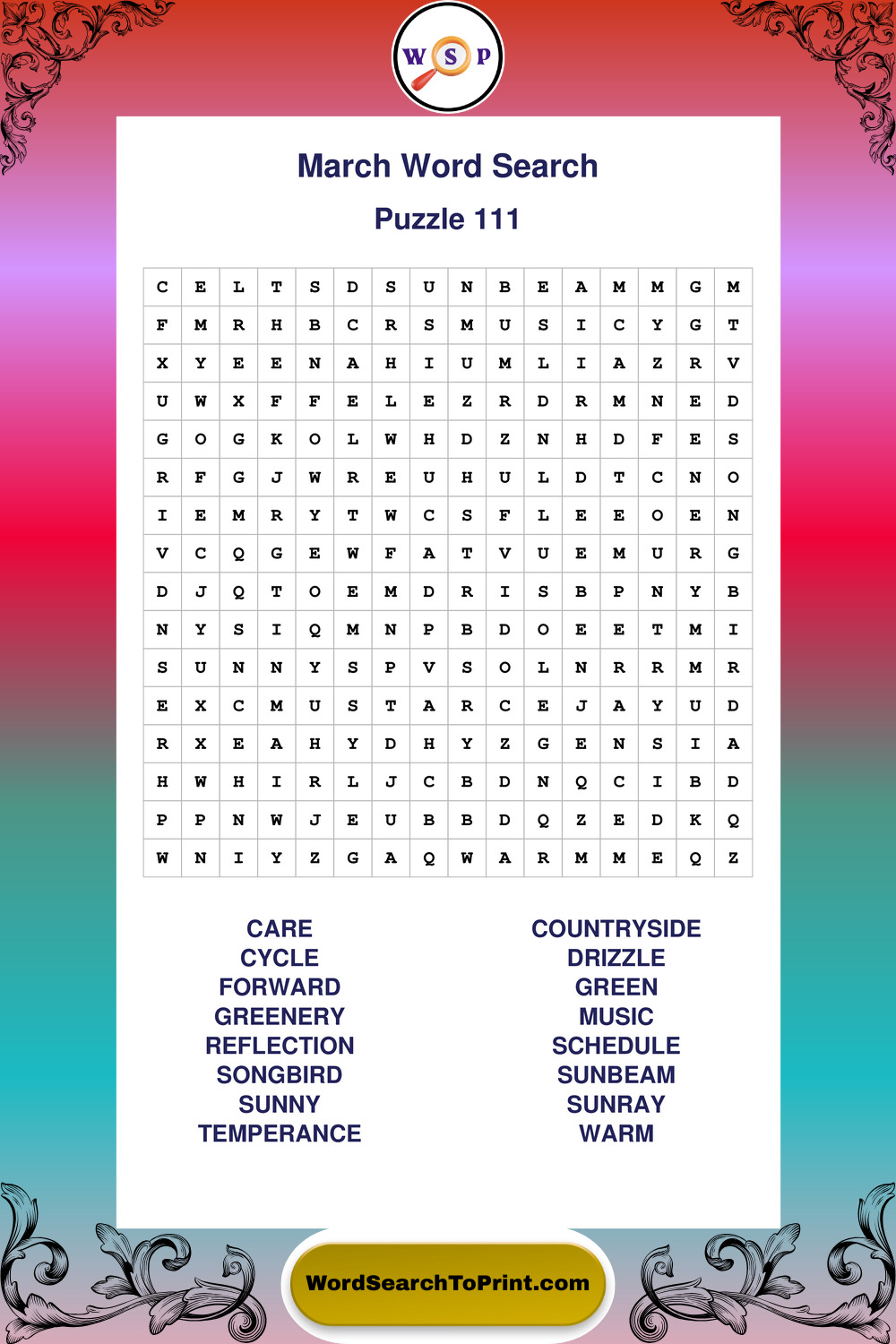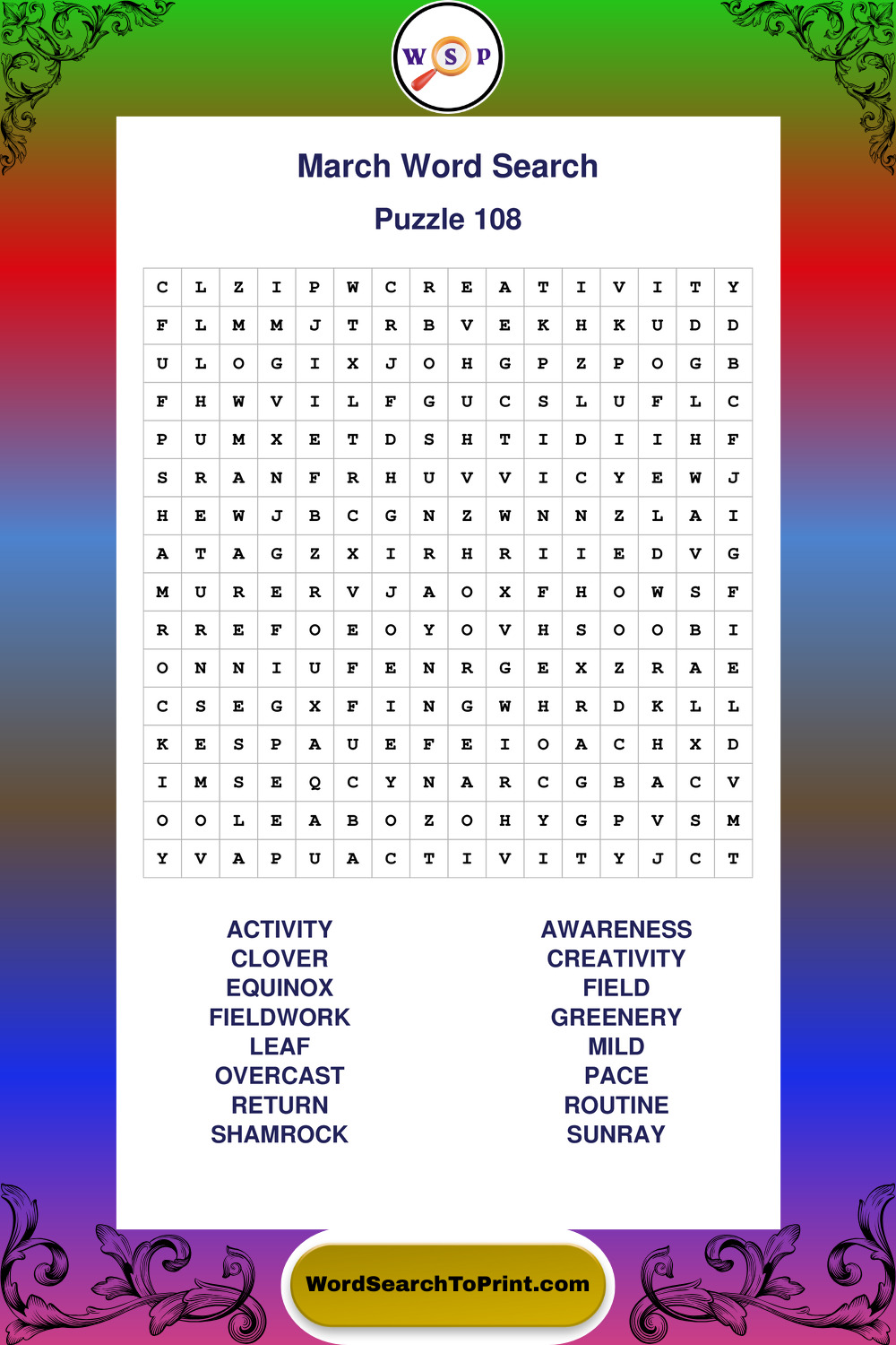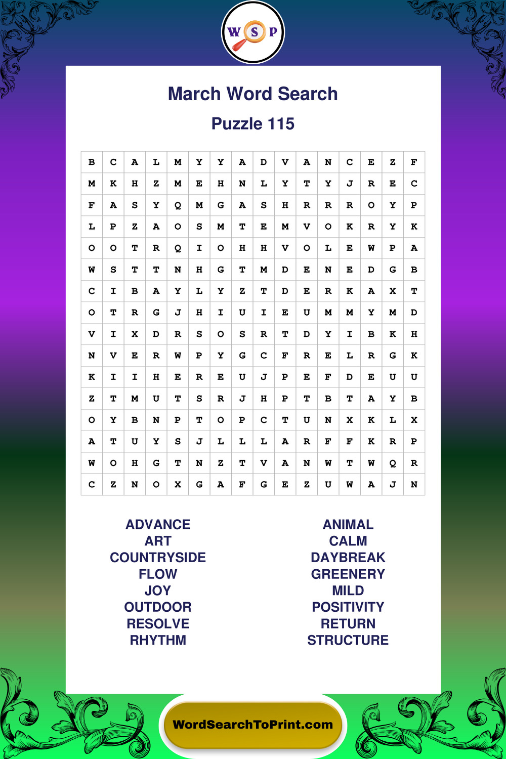 A relaxing collection of large print March wordsearches designed for comfortable solving and steady focus.