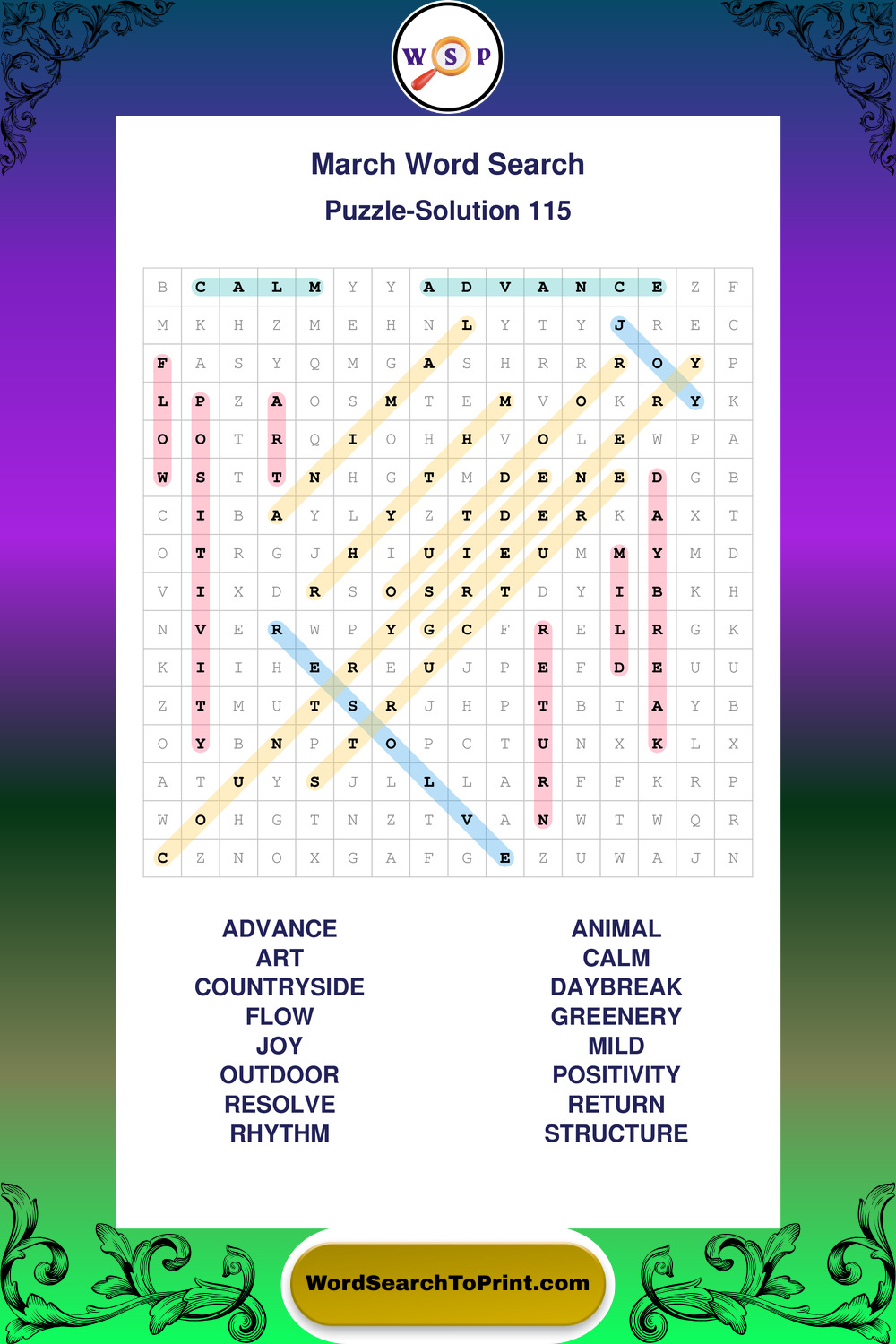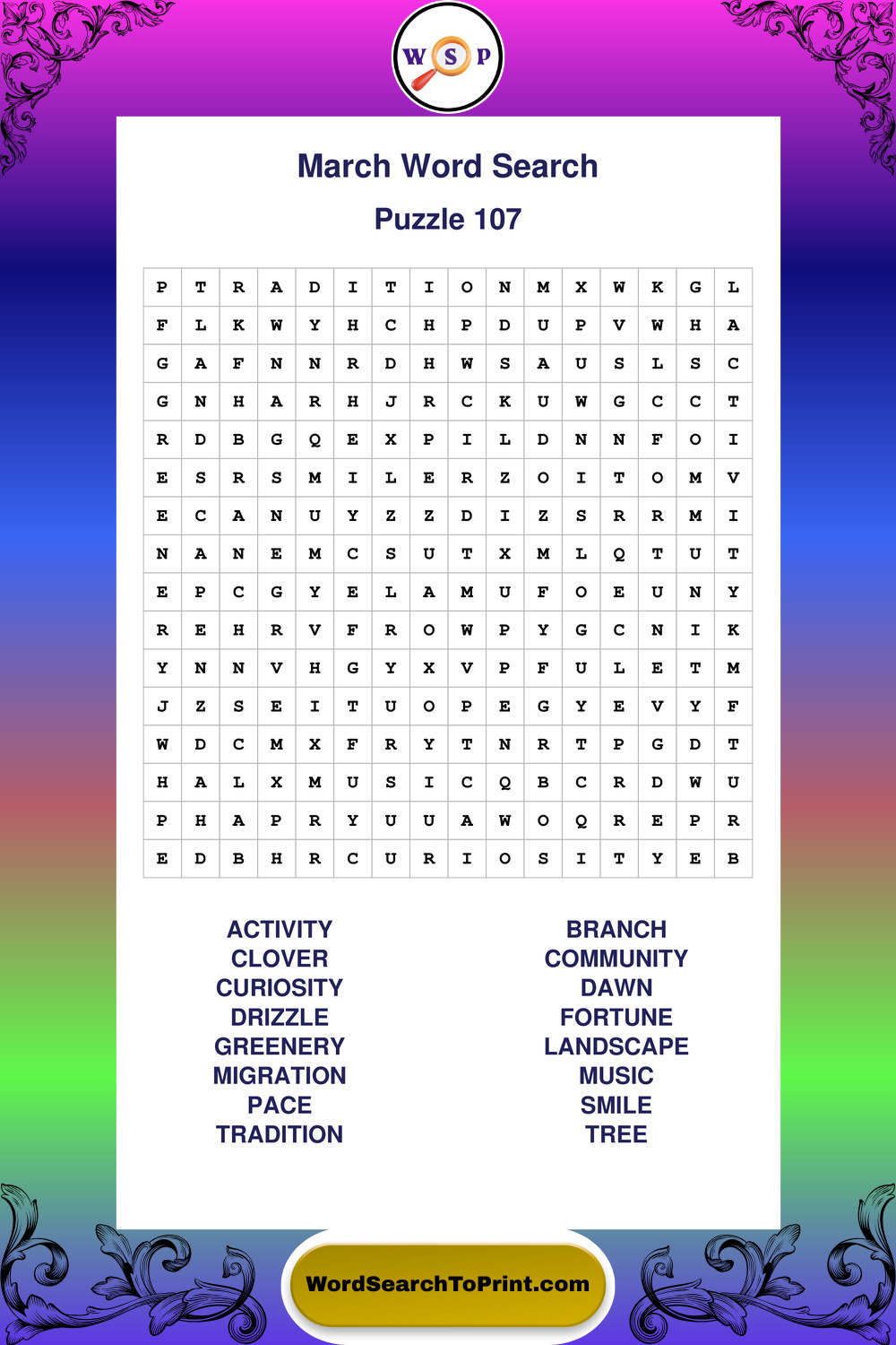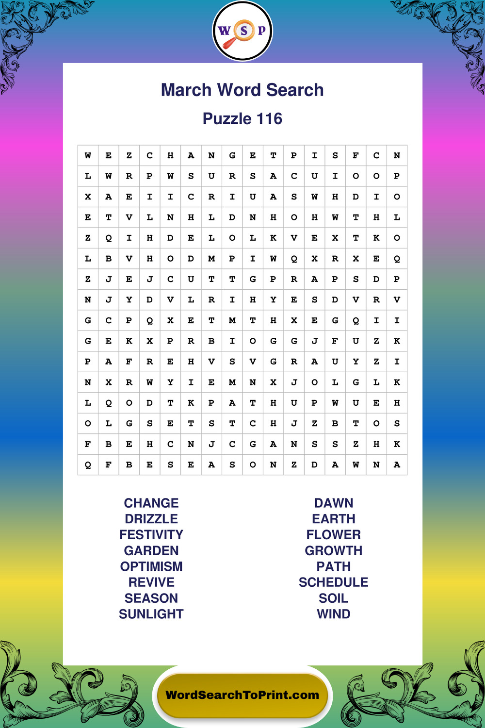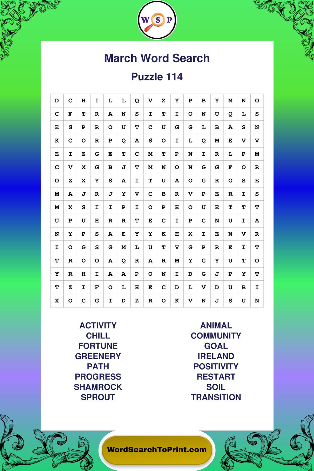 A relaxing collection of large print March wordsearches designed for comfortable solving and steady focus.