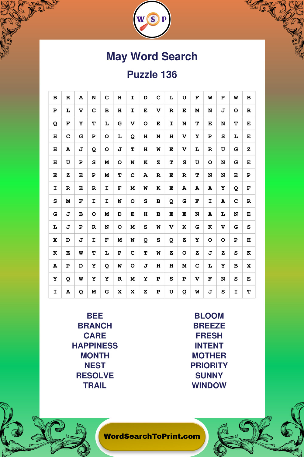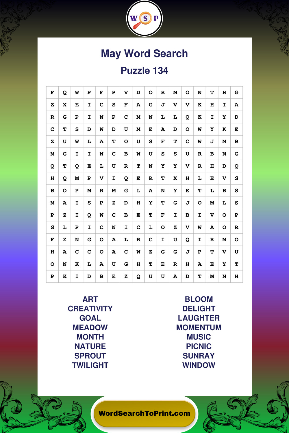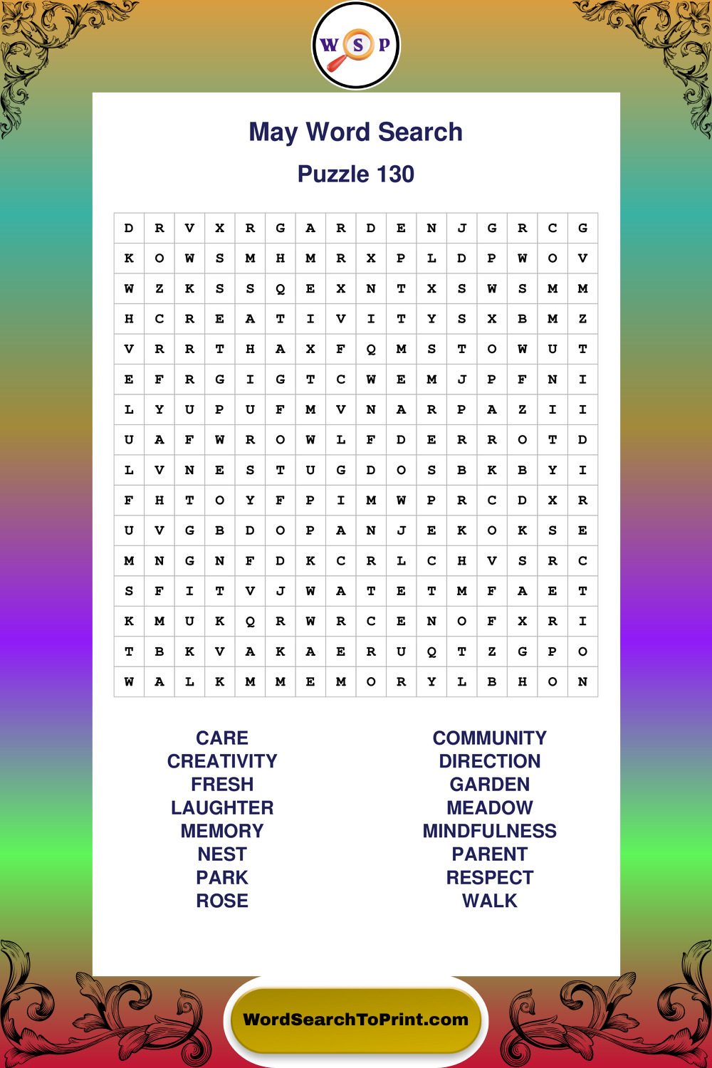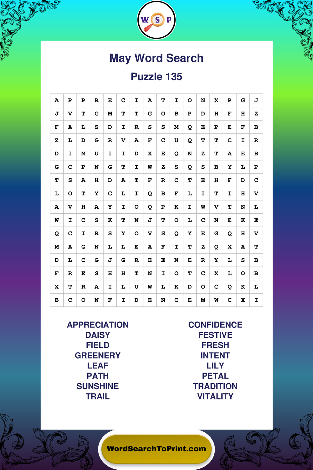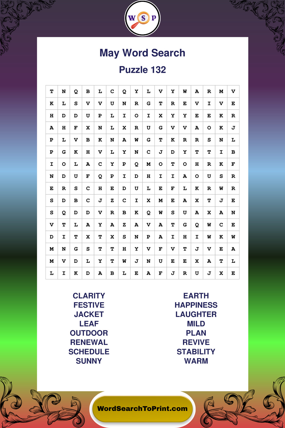 Discover large print May wordsearches designed to support relaxed thinking and comfortable reading.