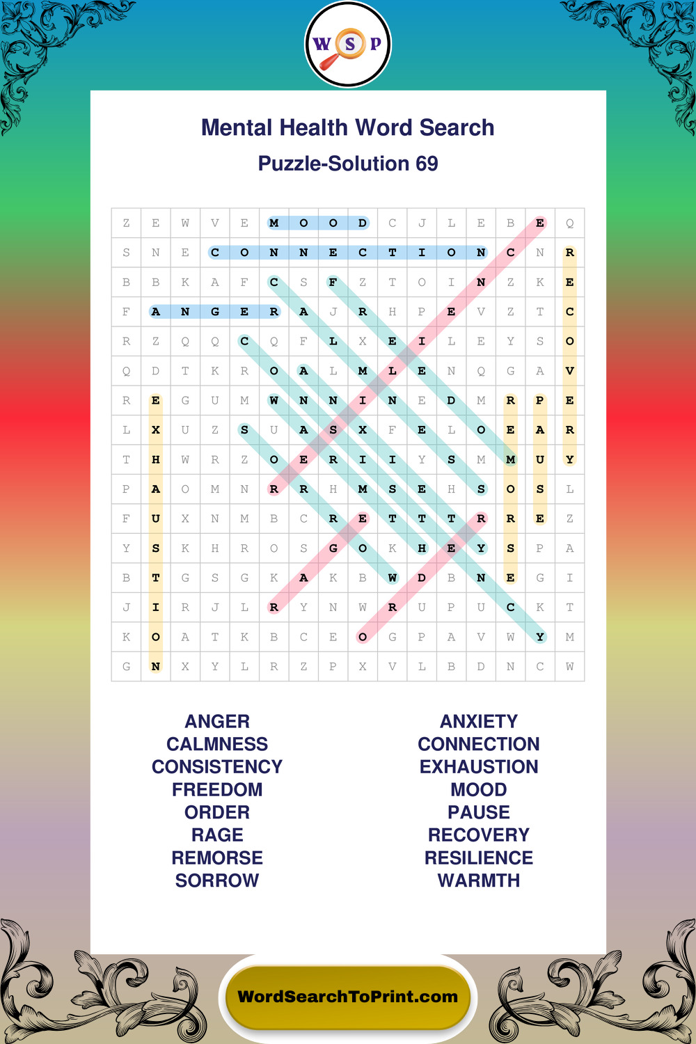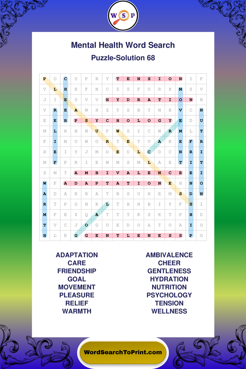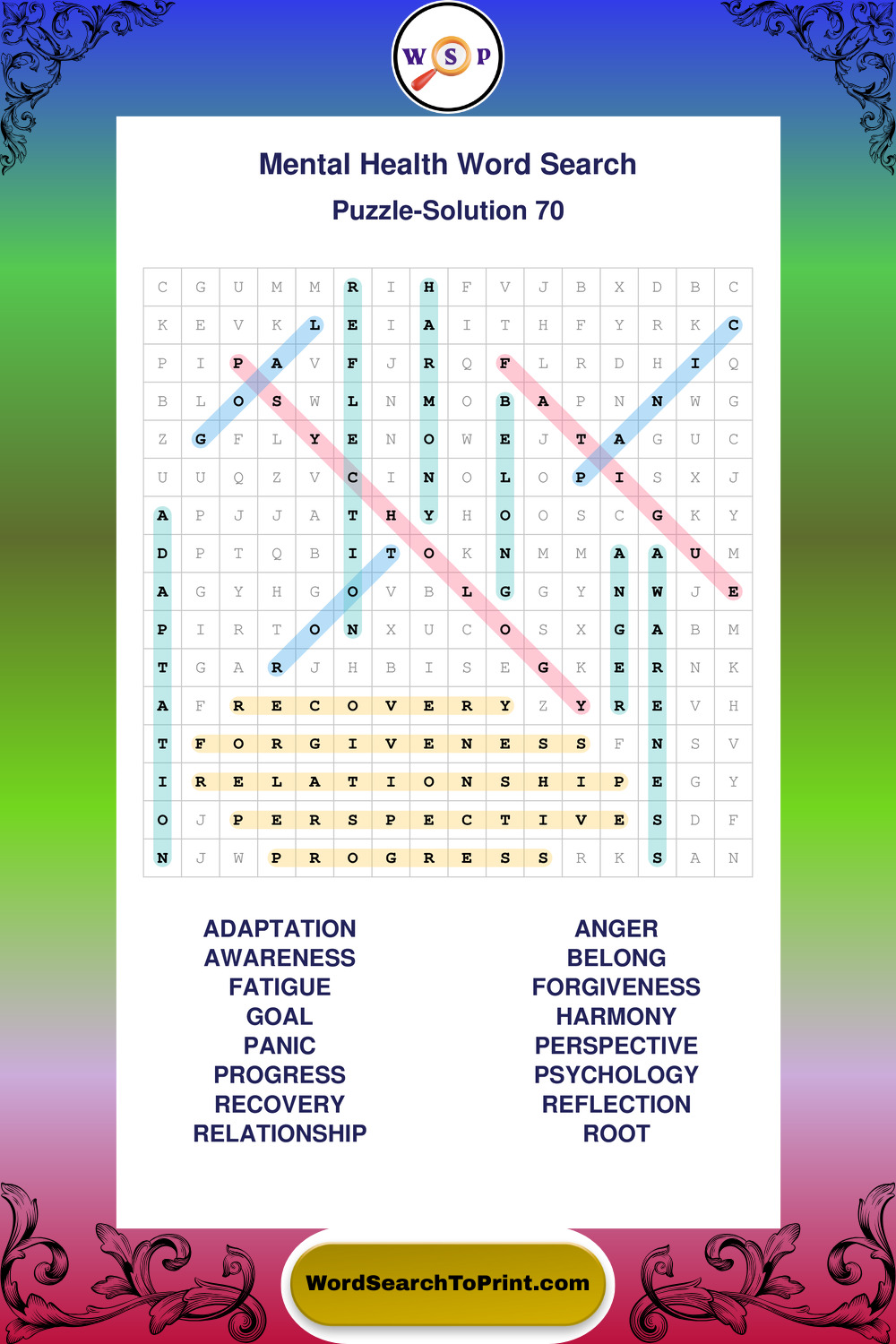 Explore printable large print Mental Health wordsearches created for users who prefer clarity, space, and calm focus.