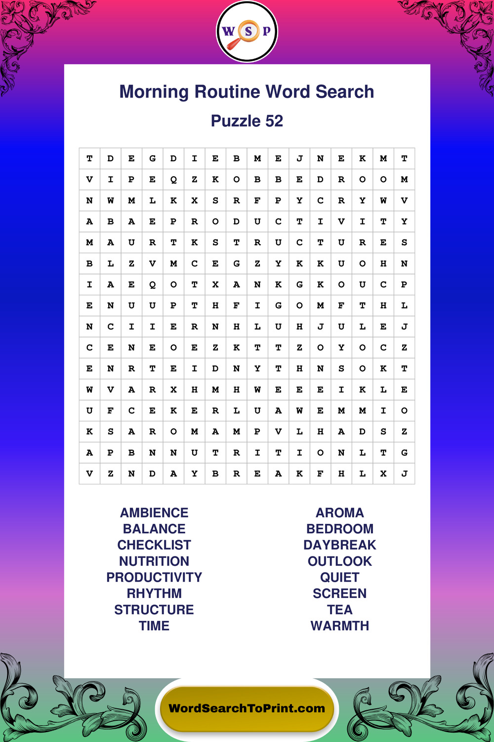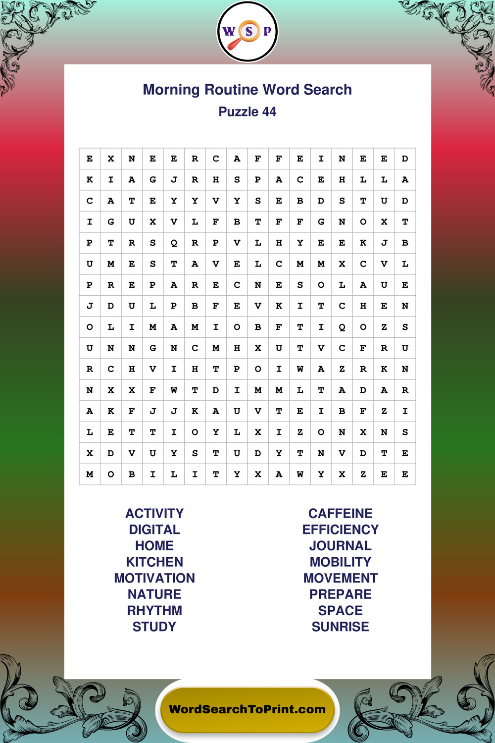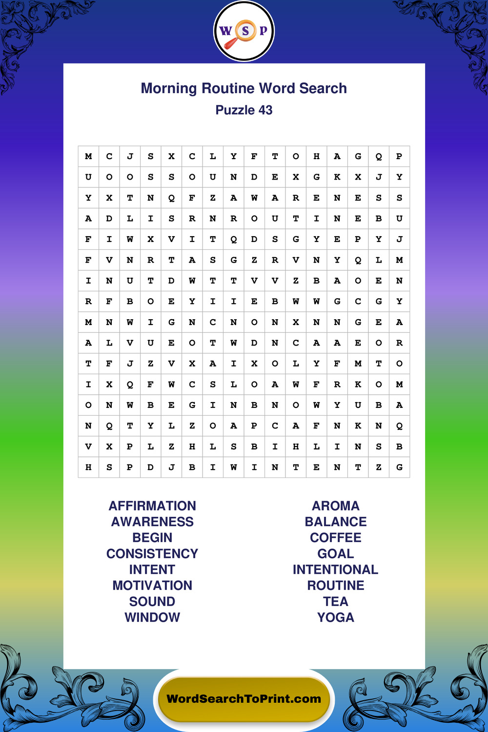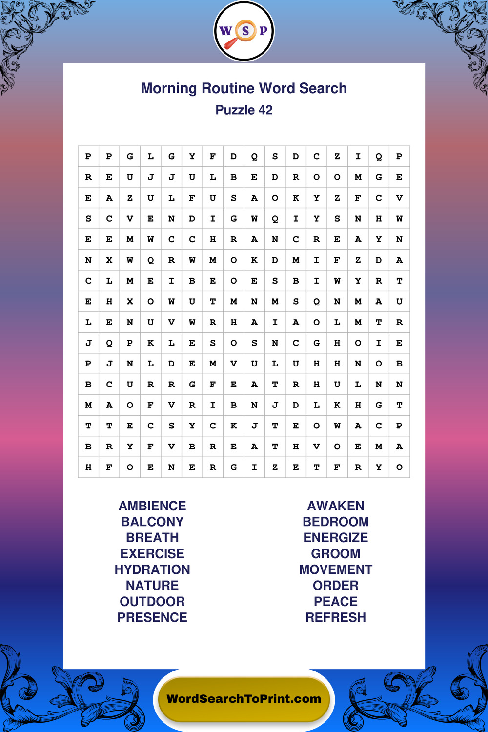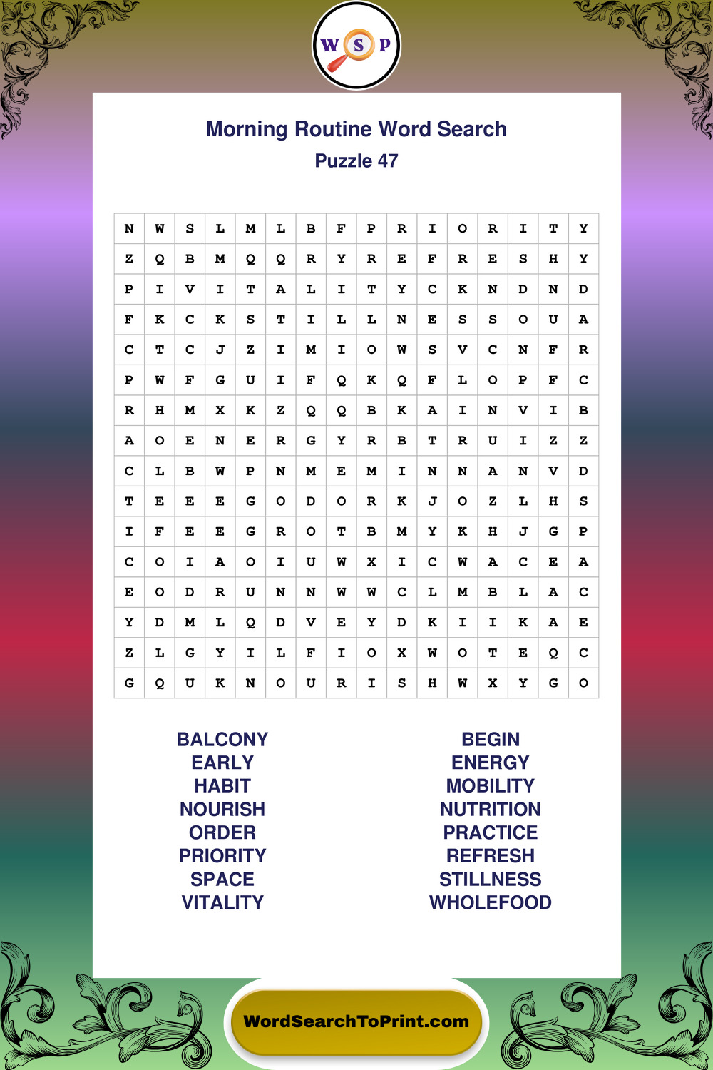 A relaxing collection of large print Morning Routine wordsearches designed for comfortable solving and steady focus.