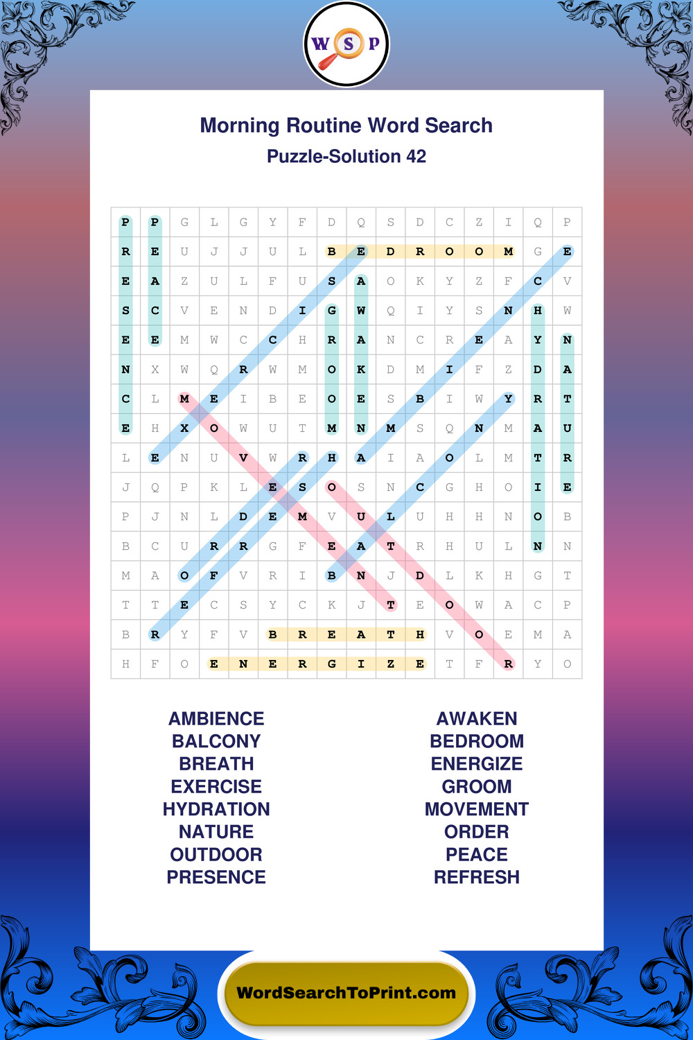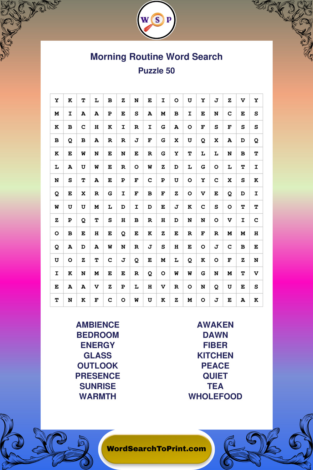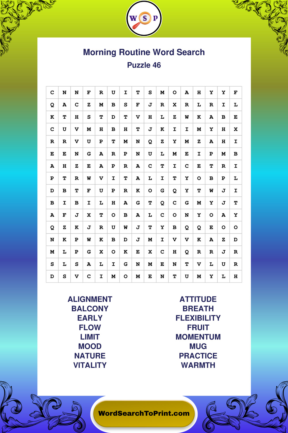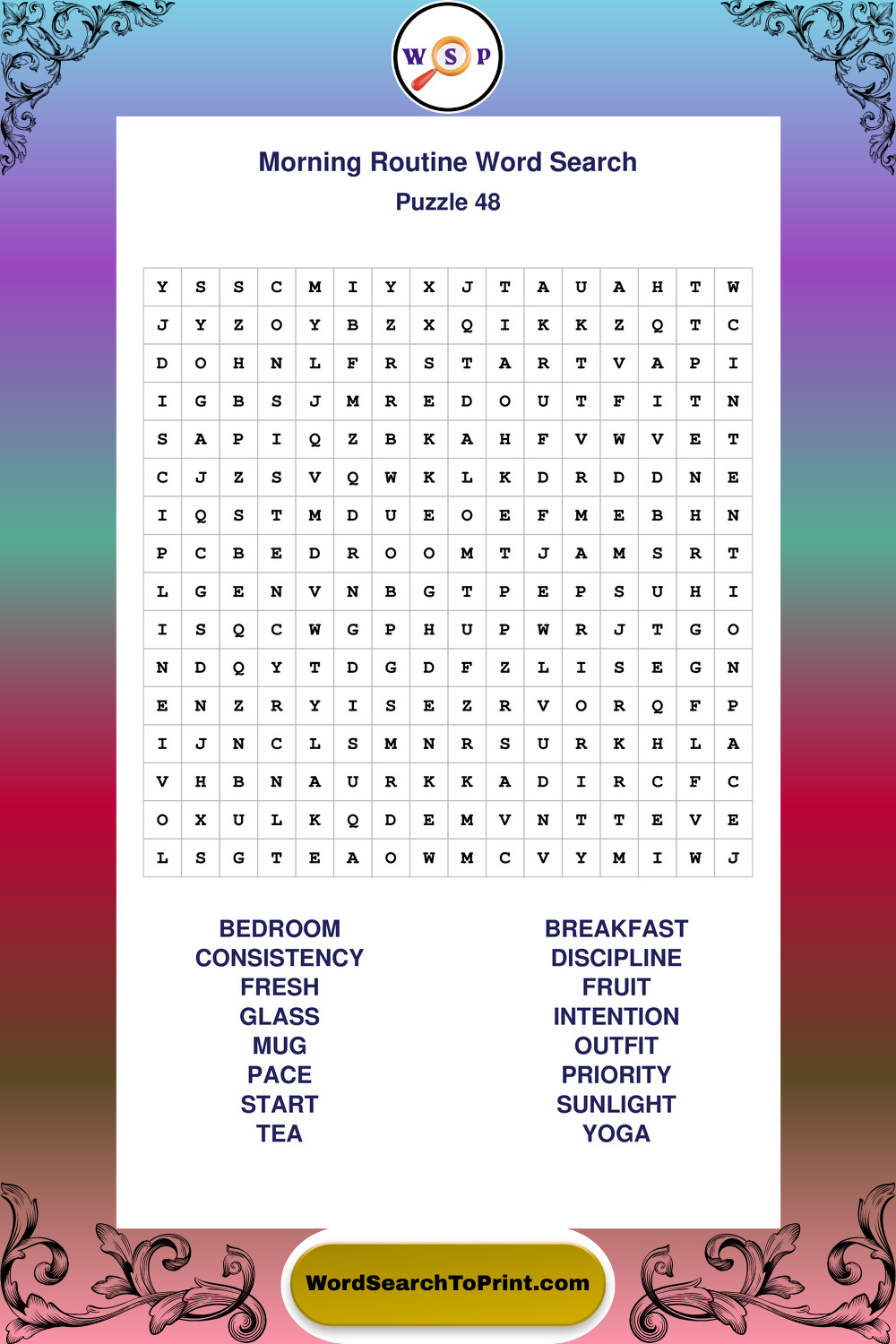 A relaxing collection of large print Morning Routine wordsearches designed for comfortable solving and steady focus.