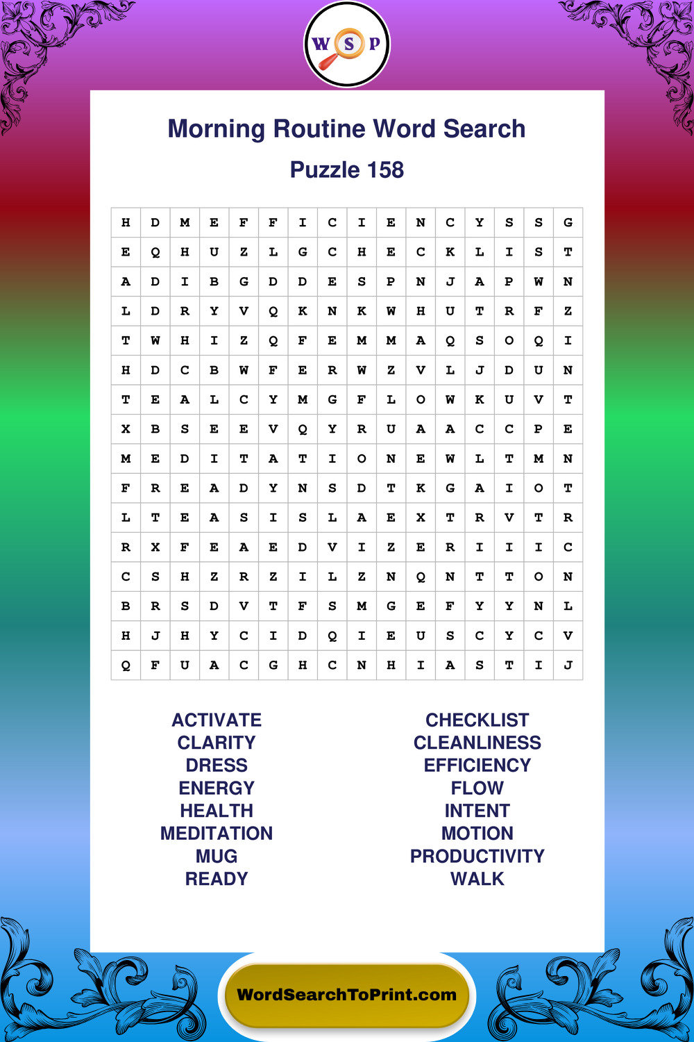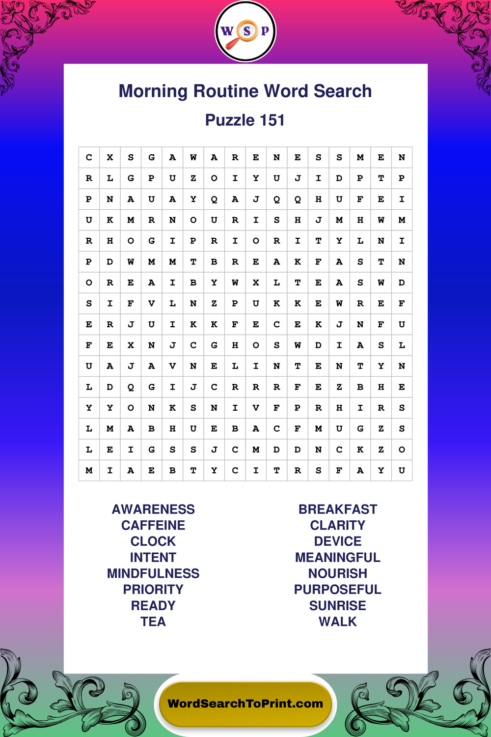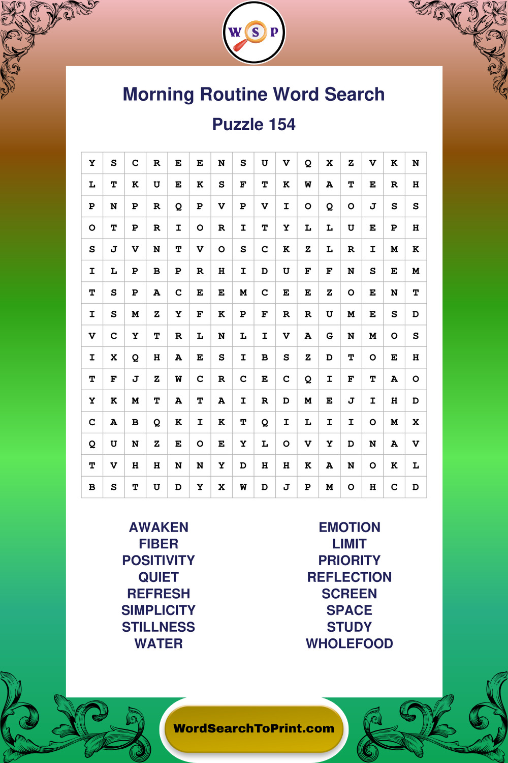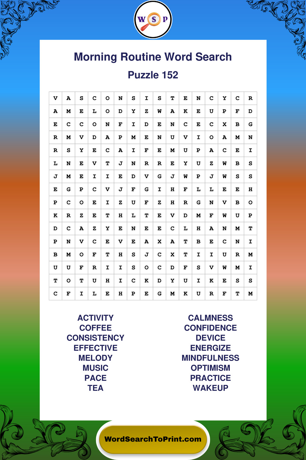A relaxing collection of large print Morning Routine wordsearches designed for comfortable solving and steady focus.