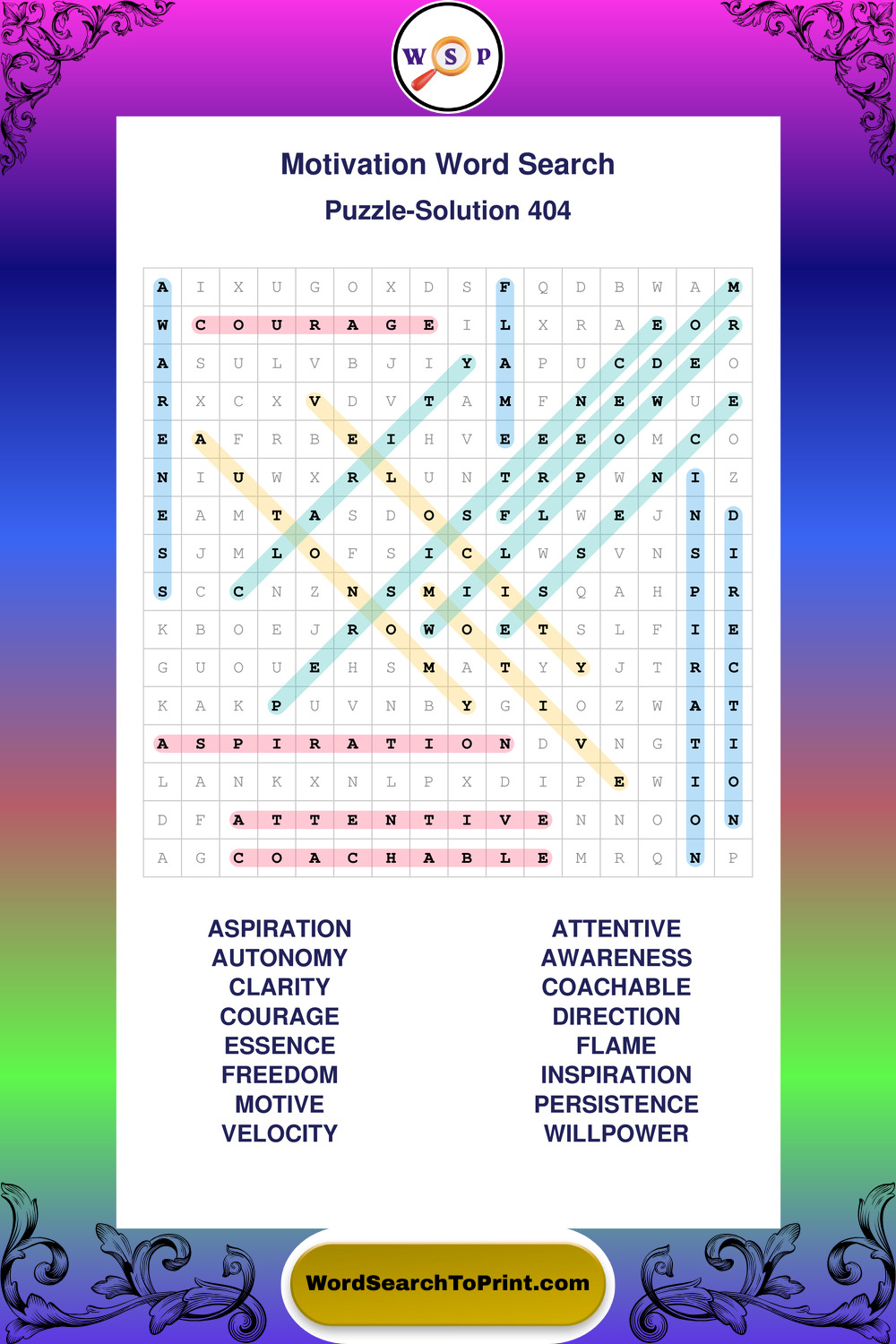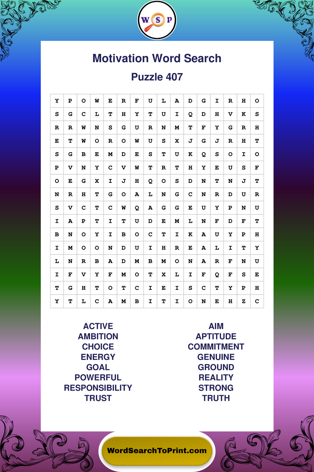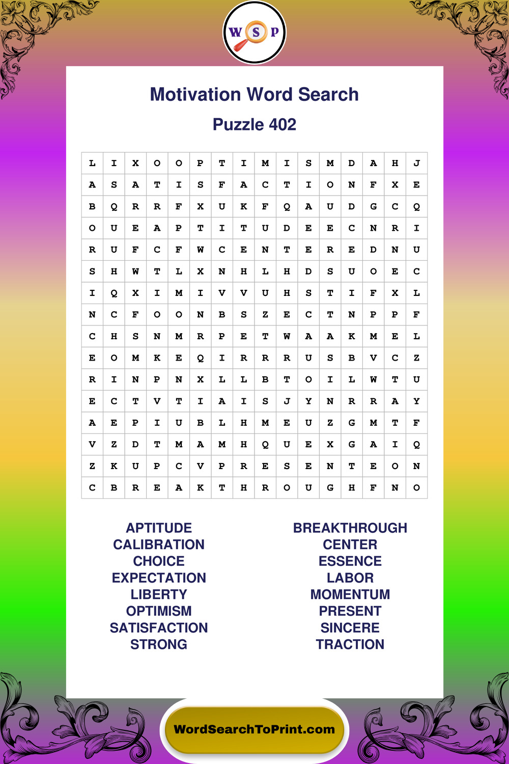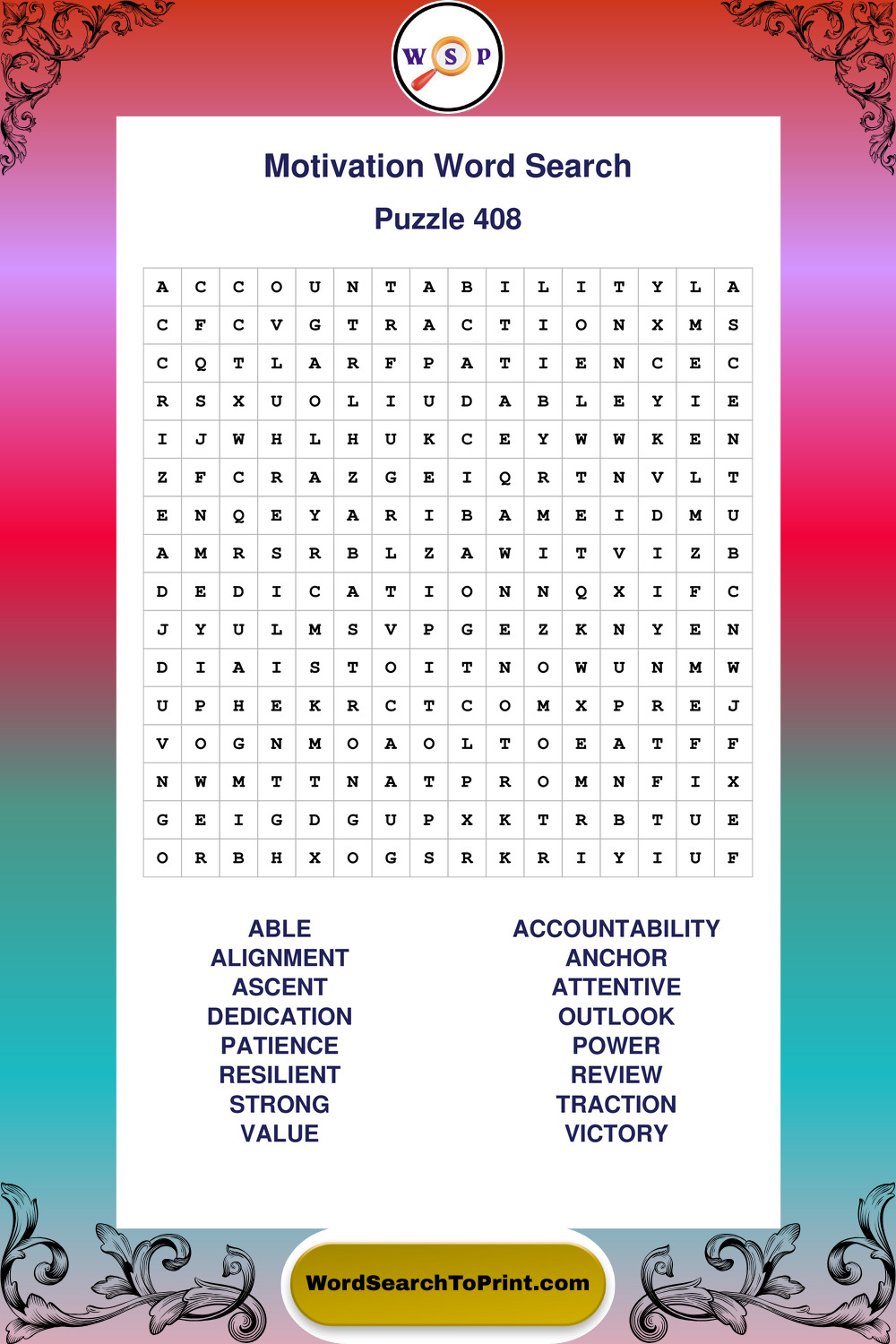 These puzzles focus on motivation, goal setting, life lessons, inspiration, and personal development concepts. They offer a structured and engaging way to explore this topic while strengthening concentration and vocabulary recognition. You may also enjoy our Inspiration word search puzzles and Wisdom word search puzzles.