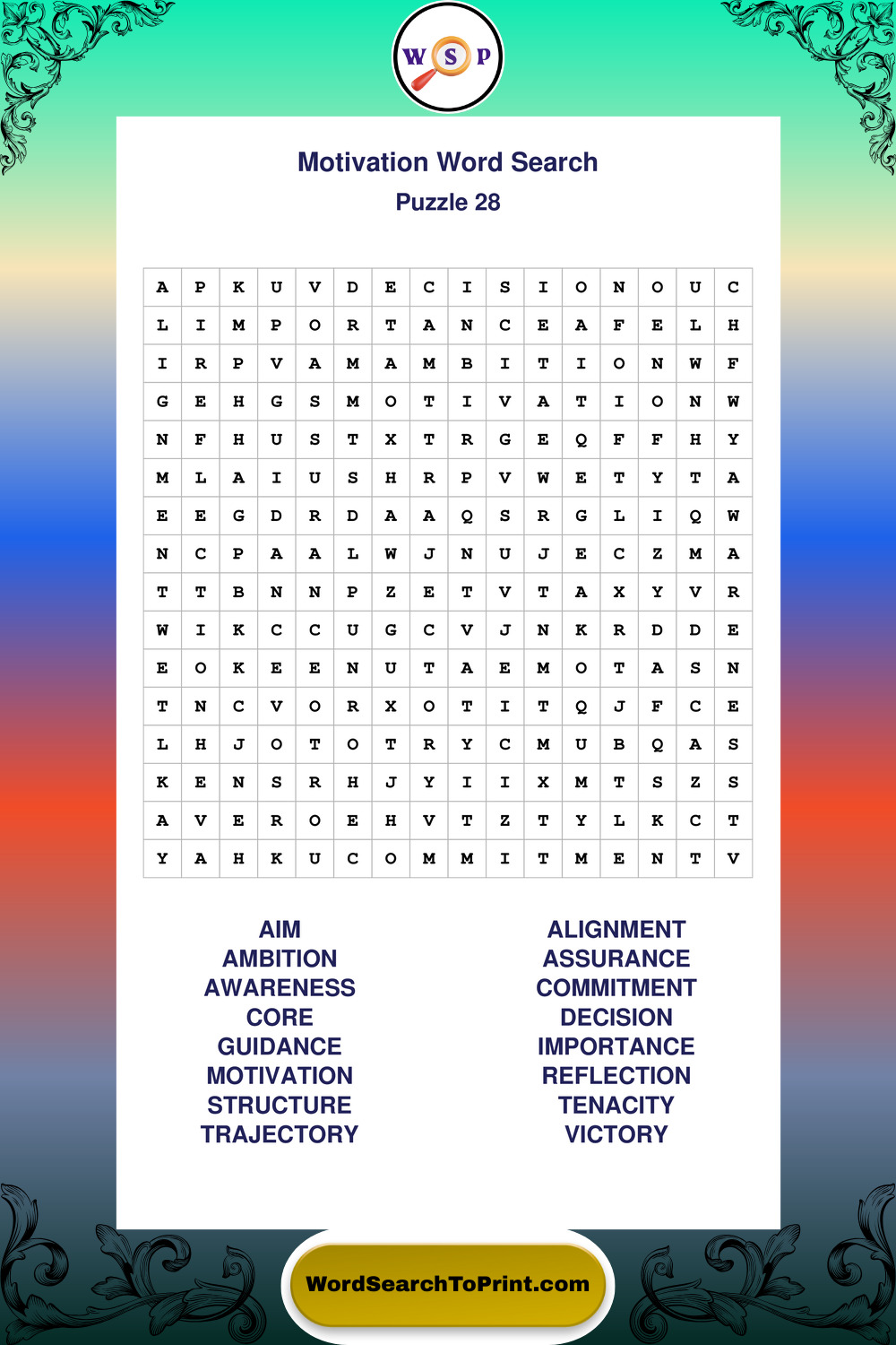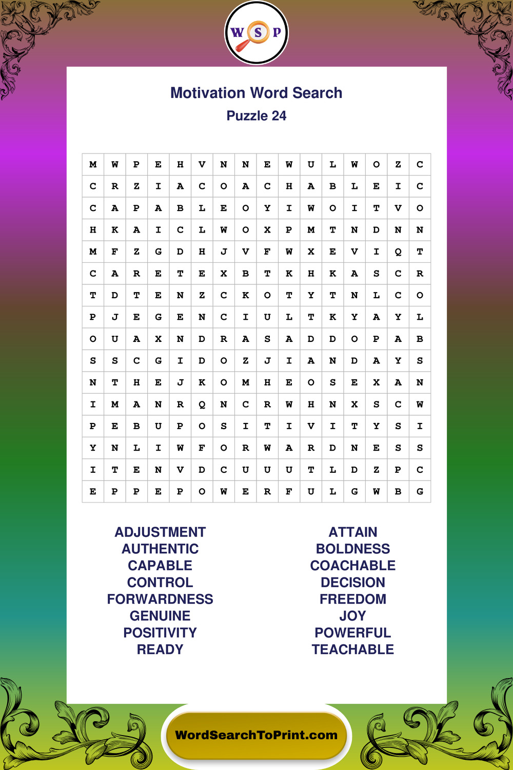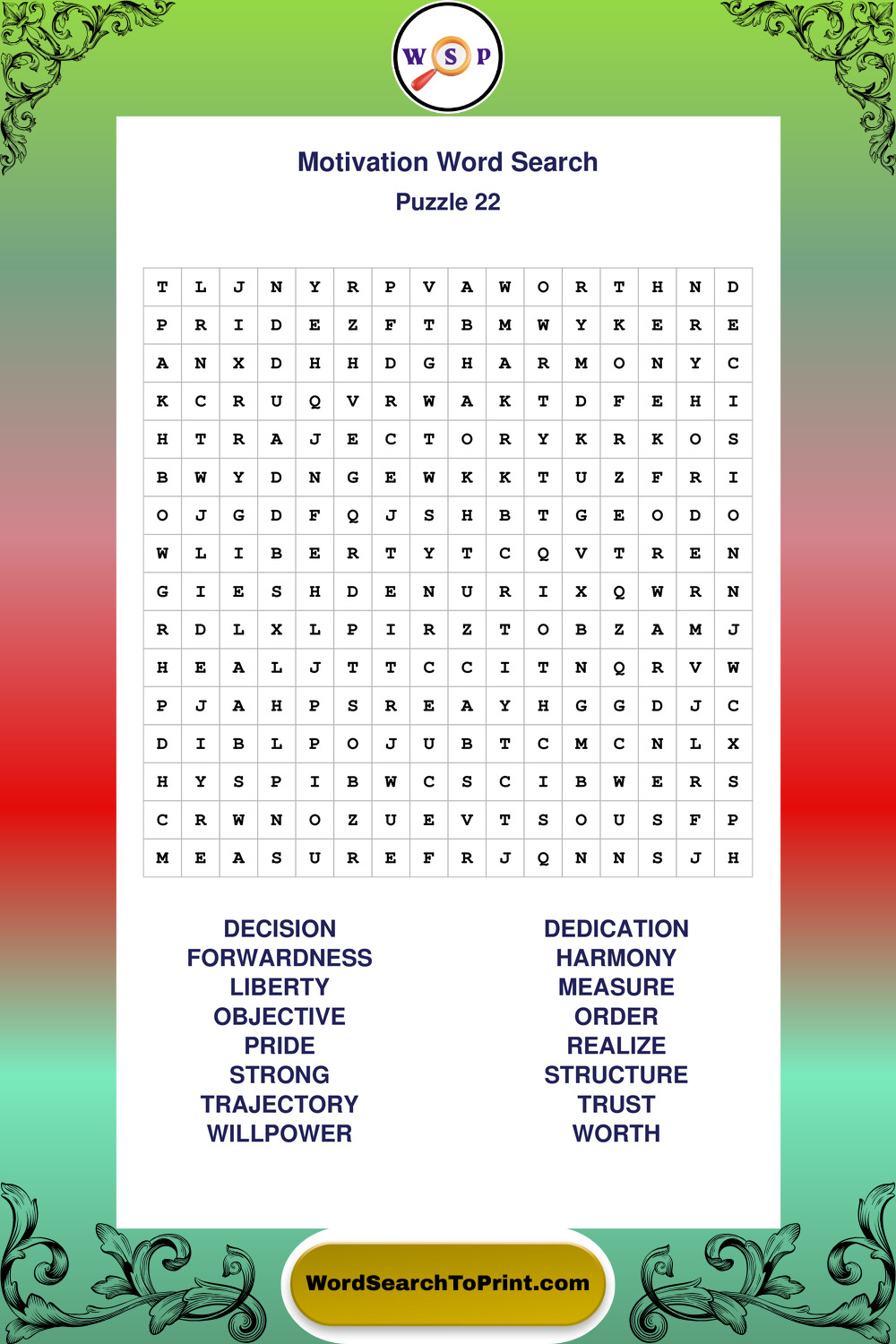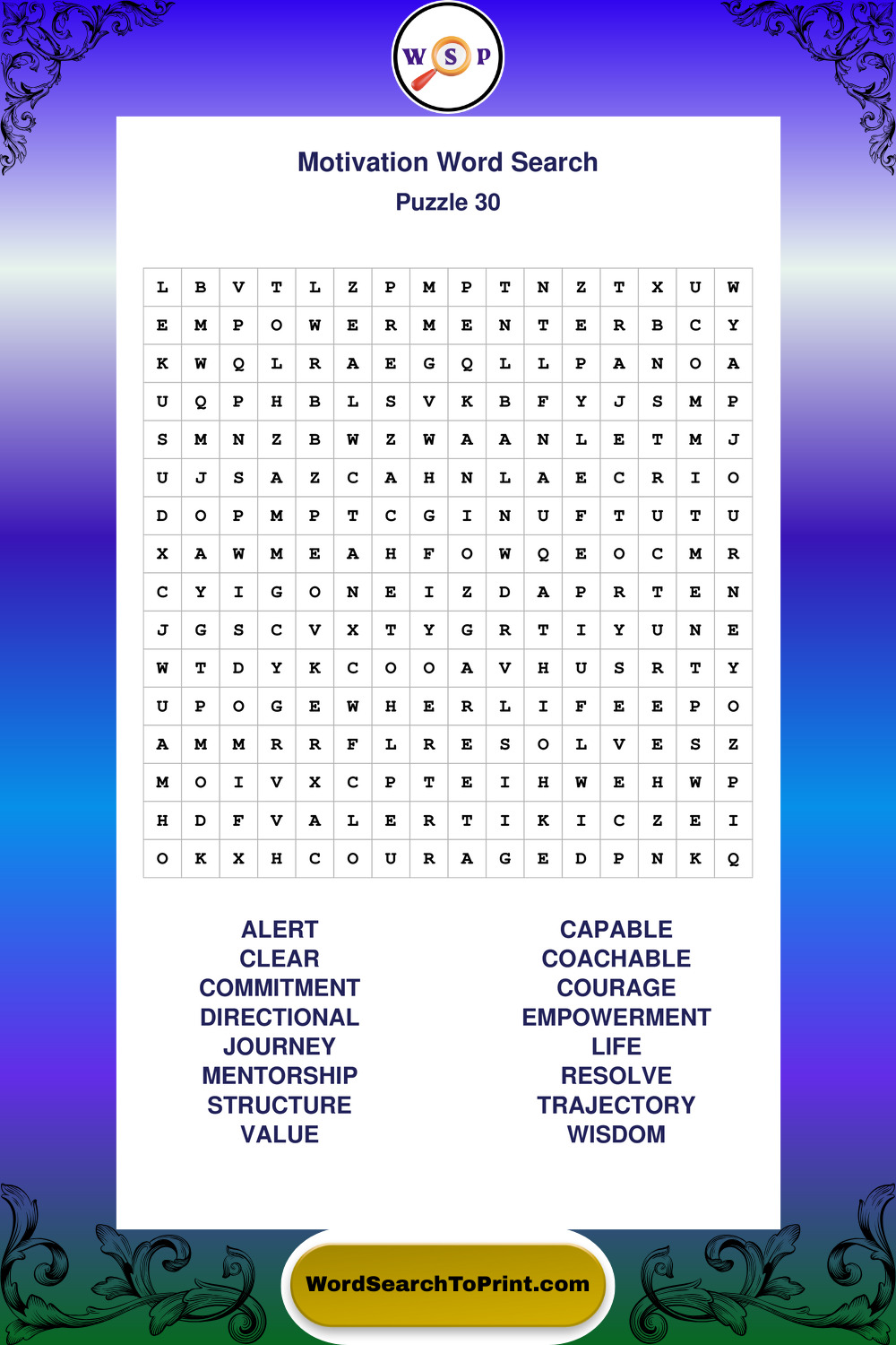 These puzzles focus on motivation, goal setting, life lessons, inspiration, and personal development concepts. They offer a structured and engaging way to explore this topic while strengthening concentration and vocabulary recognition. You may also enjoy our Inspiration word search puzzles and Wisdom word search puzzles.