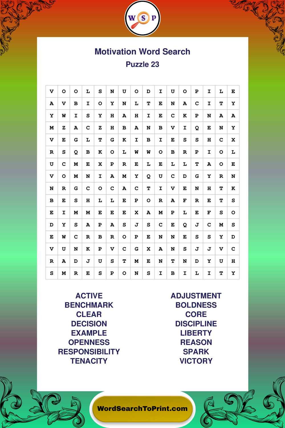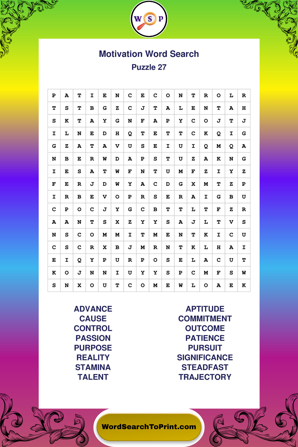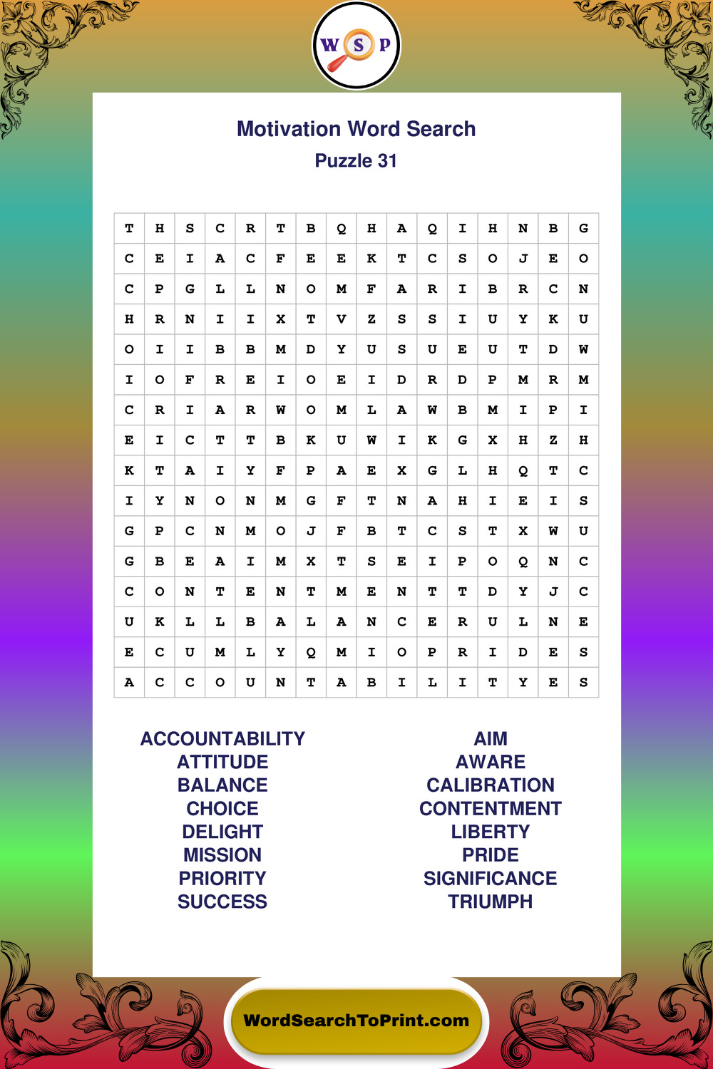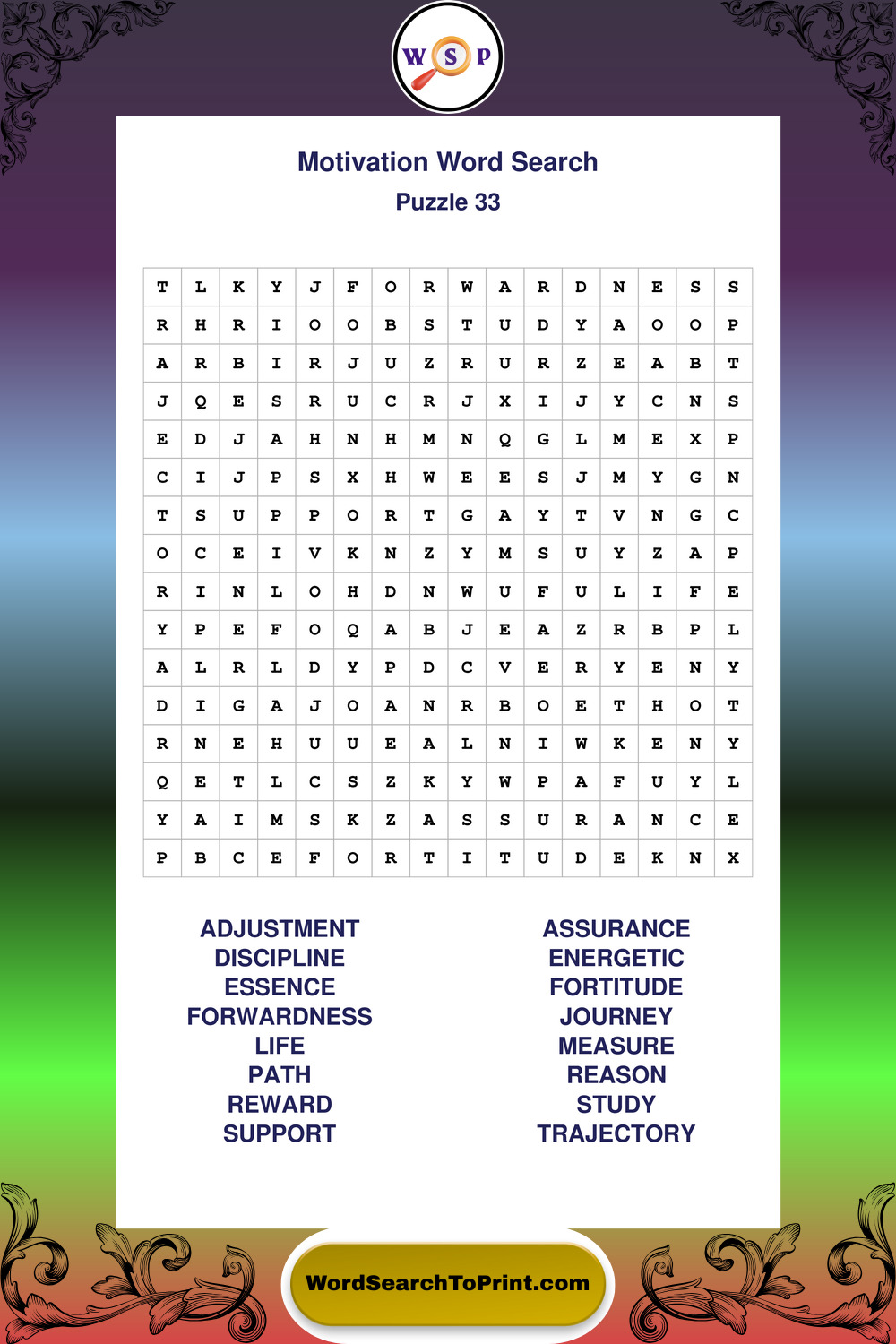 These puzzles focus on motivation, goal setting, life lessons, inspiration, and personal development concepts. They offer a structured and engaging way to explore this topic while strengthening concentration and vocabulary recognition. You may also enjoy our Inspiration word search puzzles and Wisdom word search puzzles.
