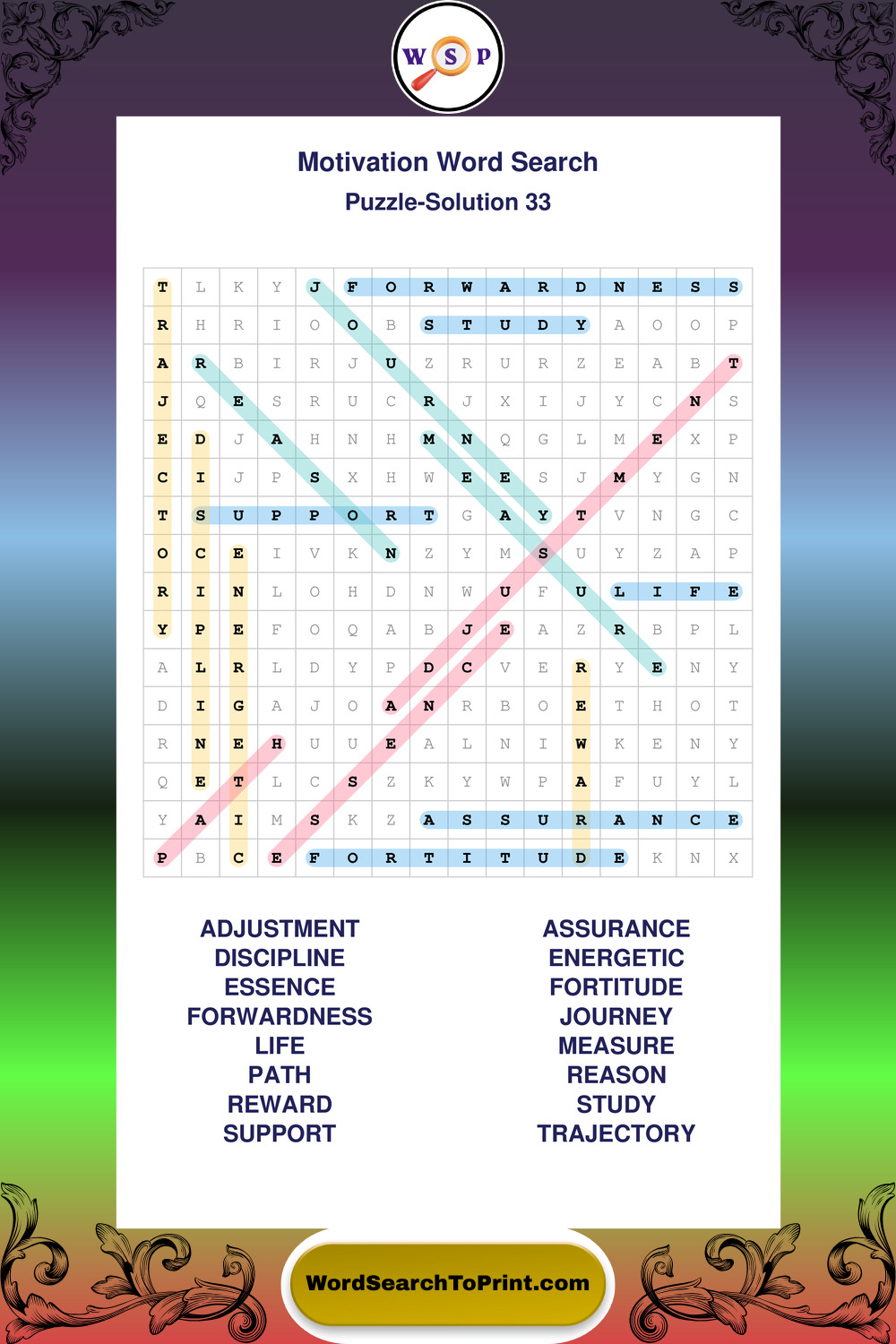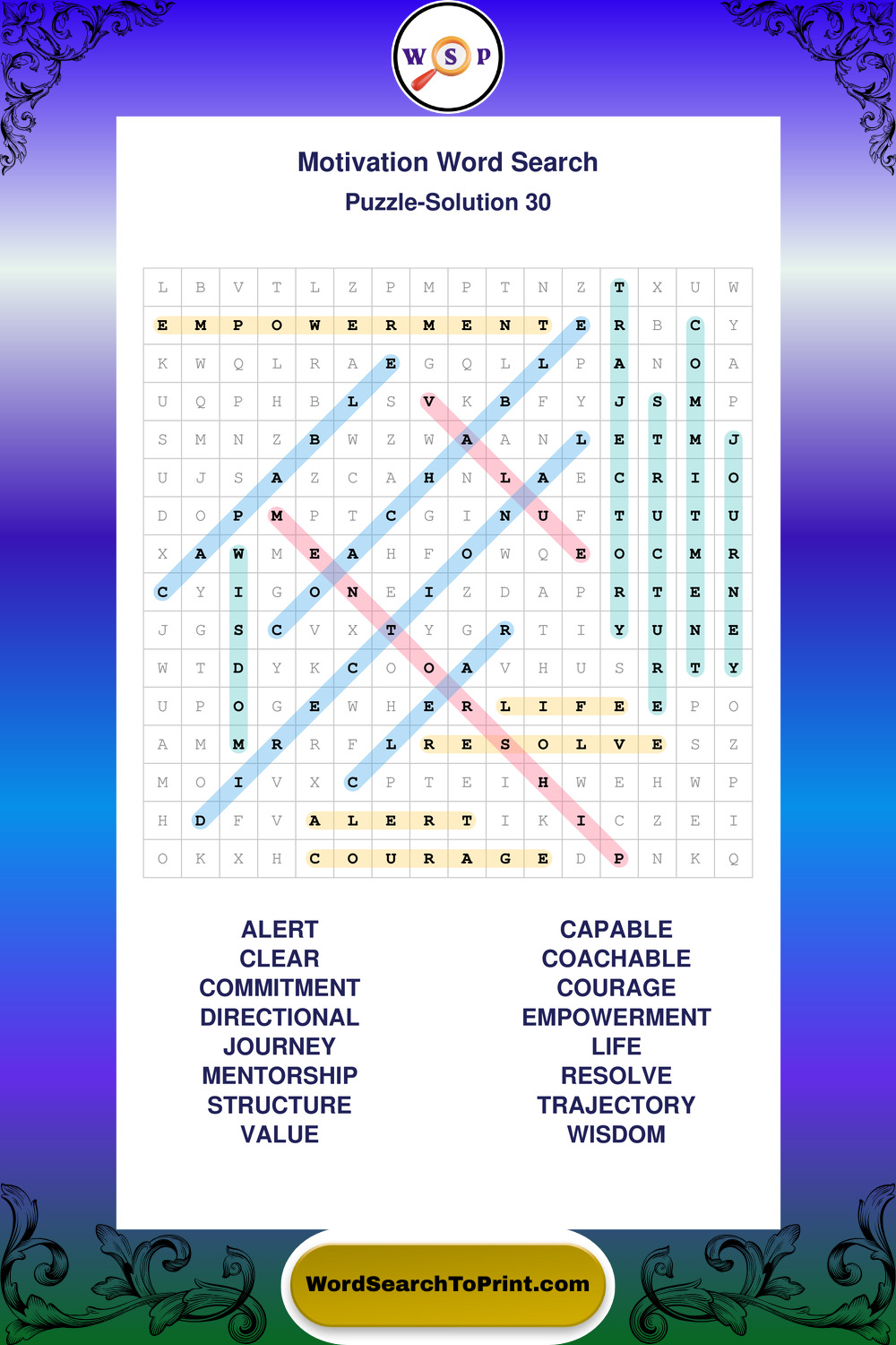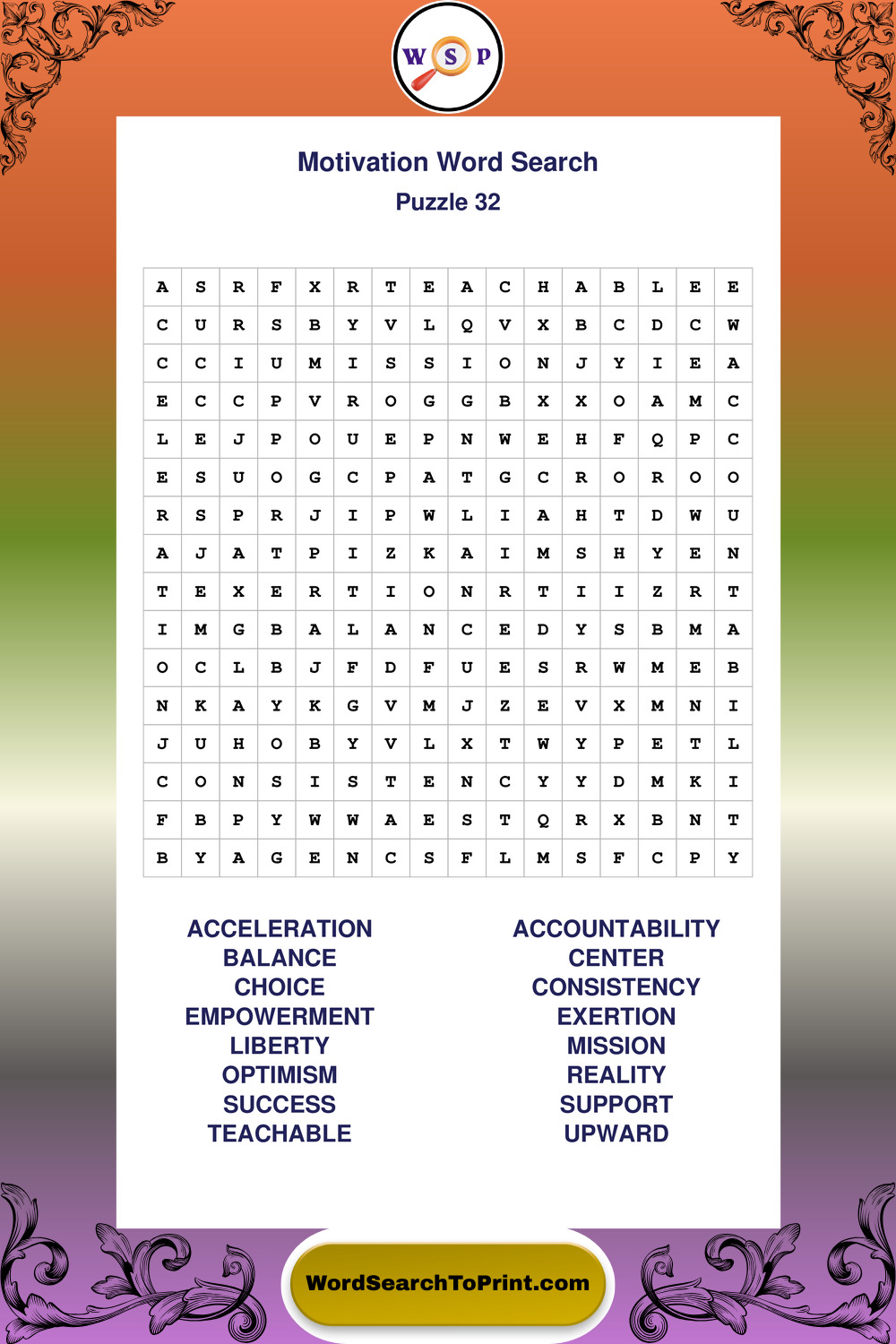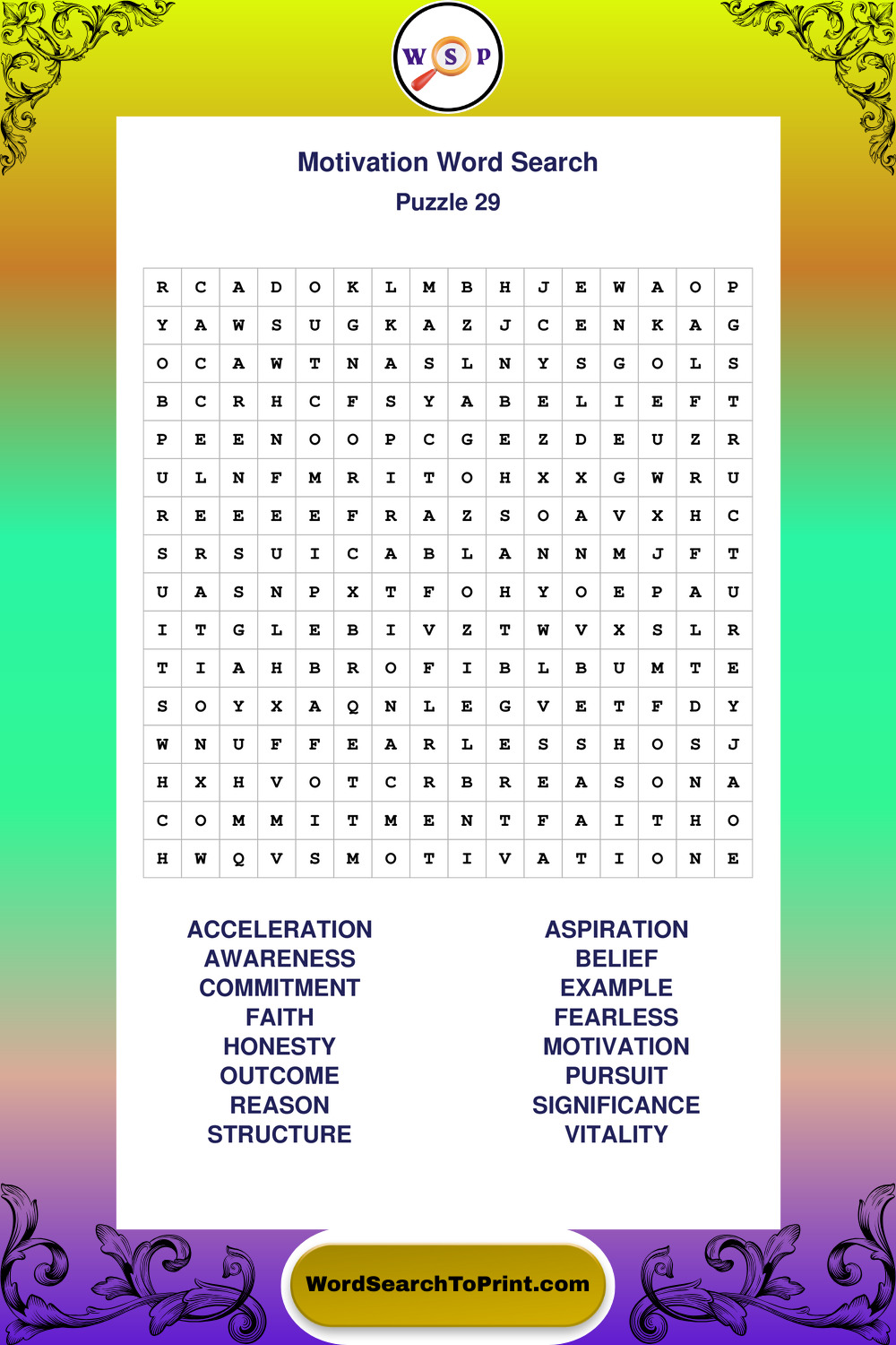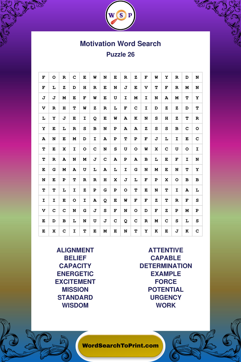 These puzzles focus on motivation, goal setting, life lessons, inspiration, and personal development concepts. They offer a structured and engaging way to explore this topic while strengthening concentration and vocabulary recognition. You may also enjoy our Inspiration word search puzzles and Wisdom word search puzzles.