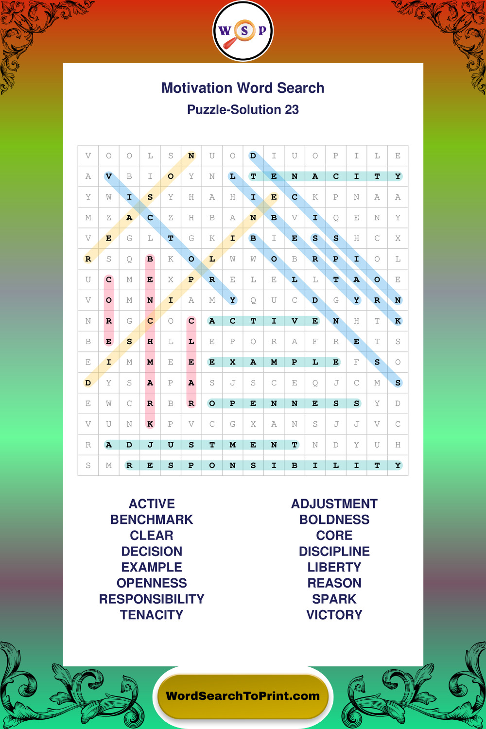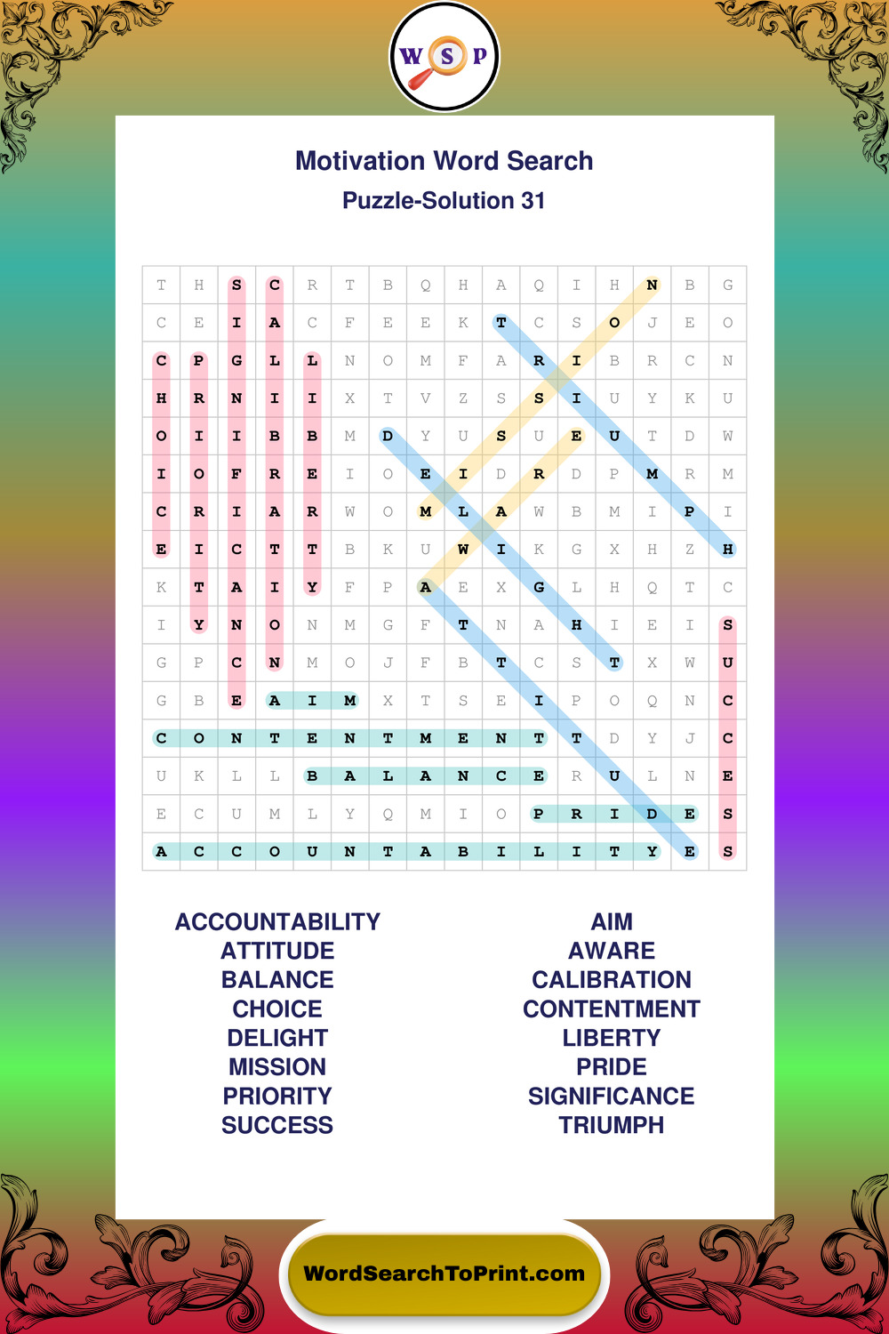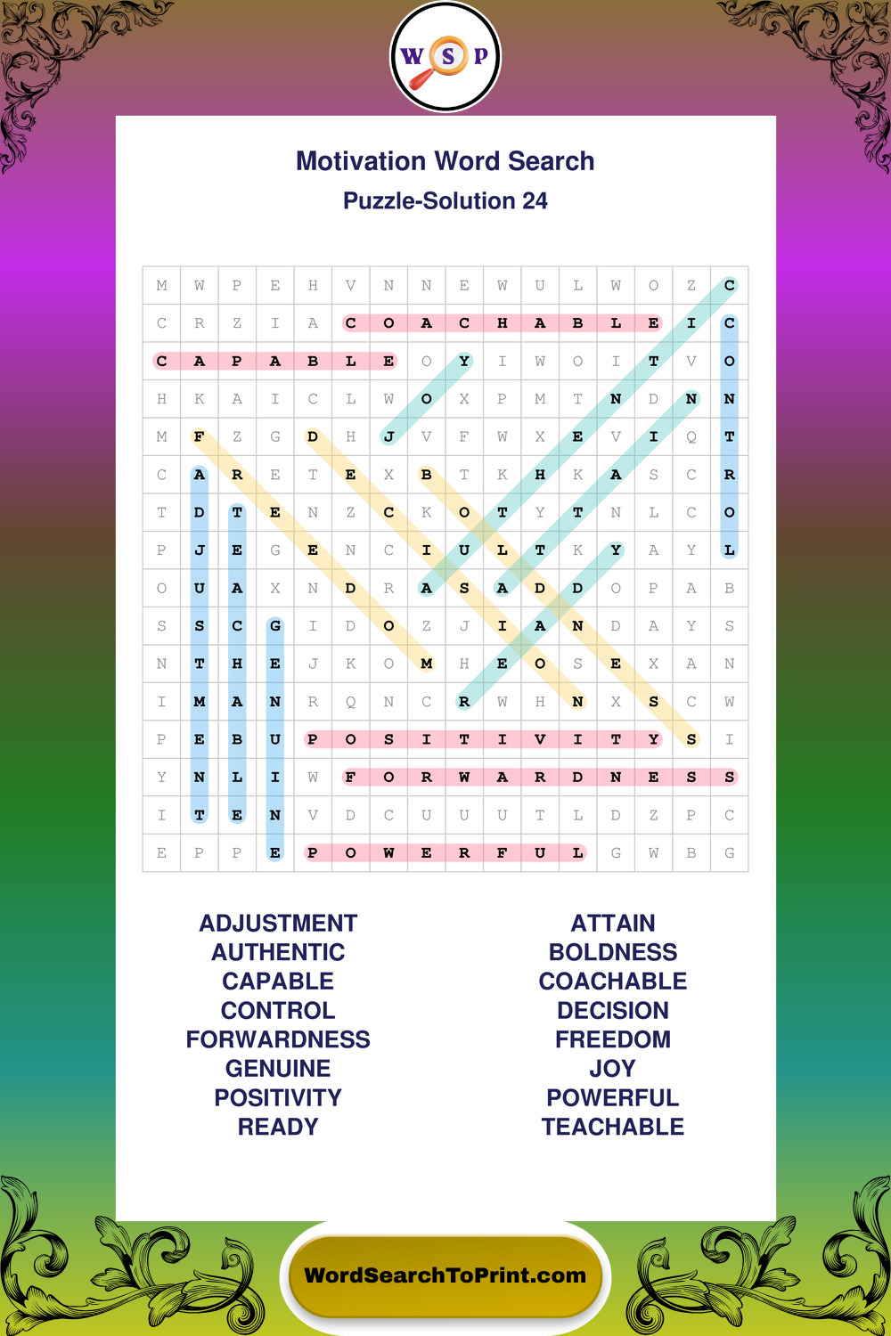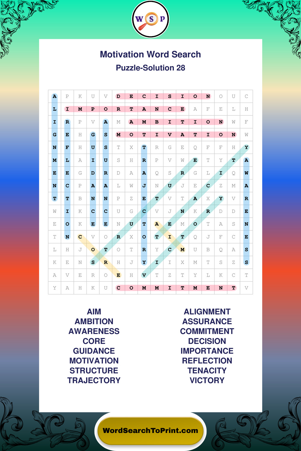 These puzzles focus on motivation, goal setting, life lessons, inspiration, and personal development concepts. They offer a structured and engaging way to explore this topic while strengthening concentration and vocabulary recognition. You may also enjoy our Inspiration word search puzzles and Wisdom word search puzzles.