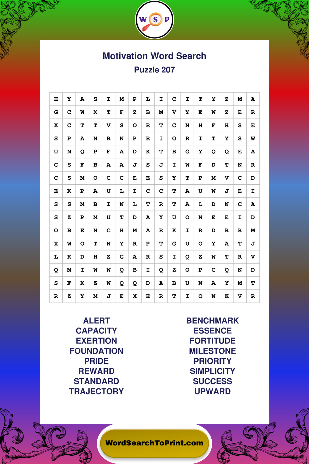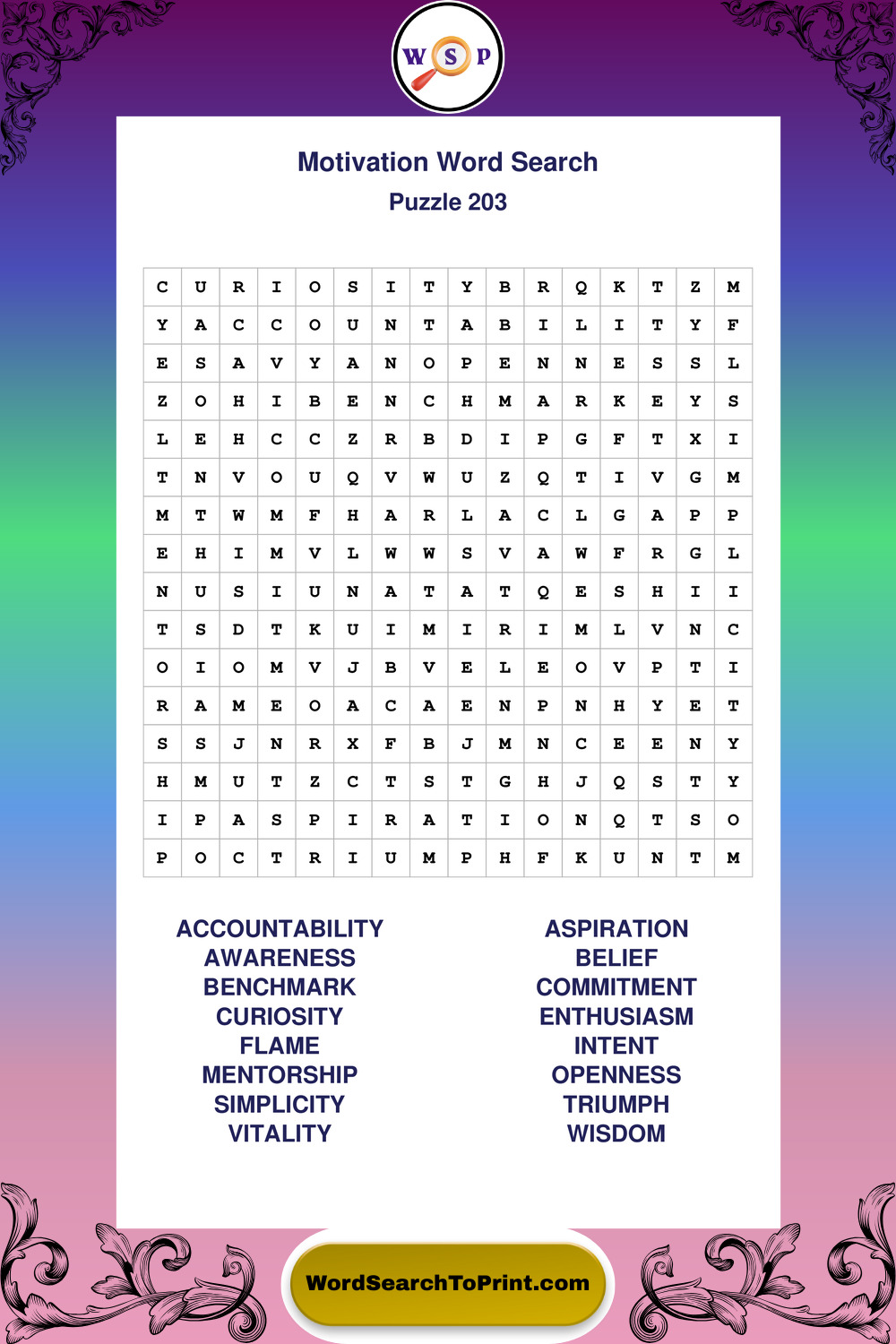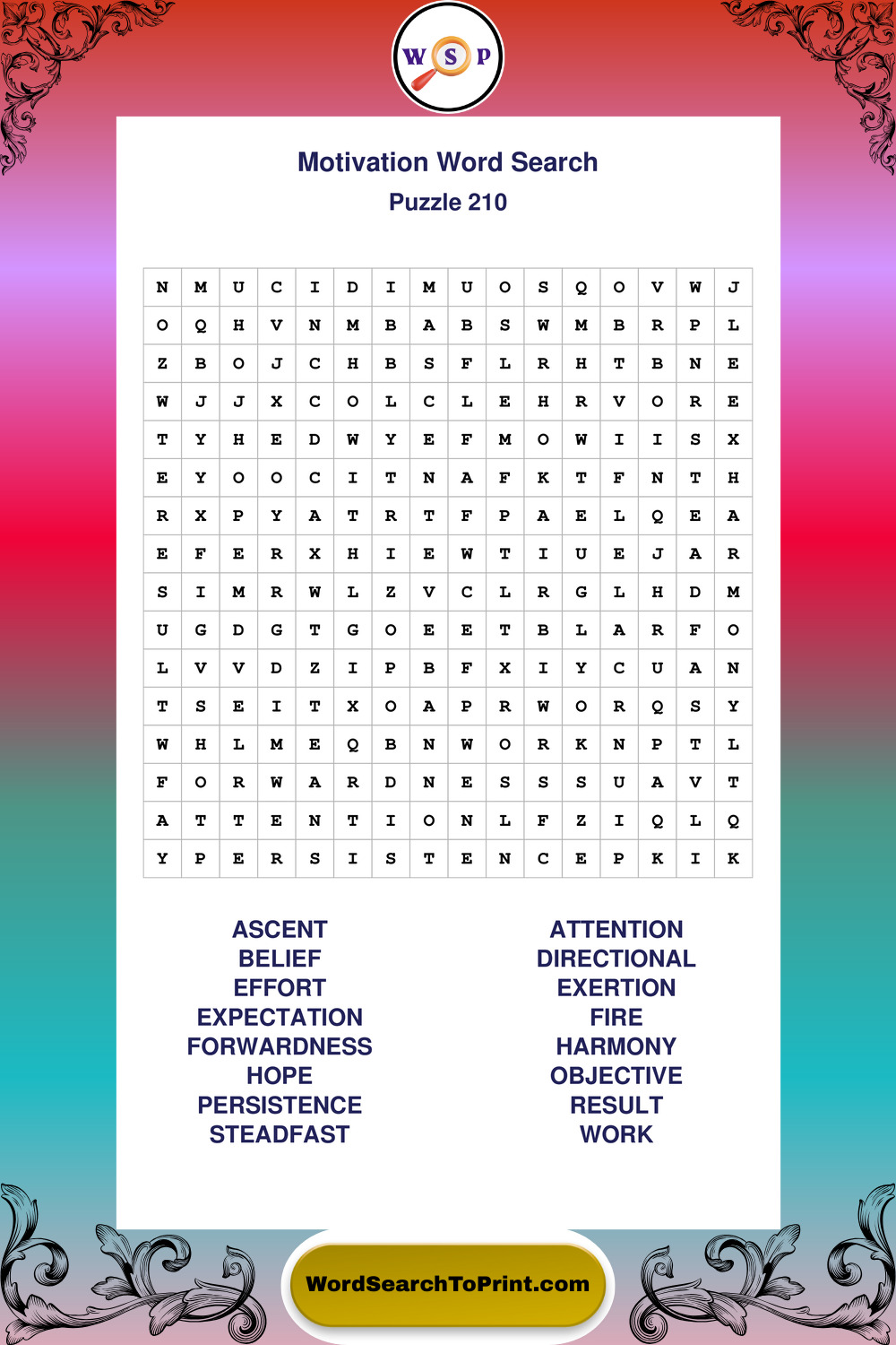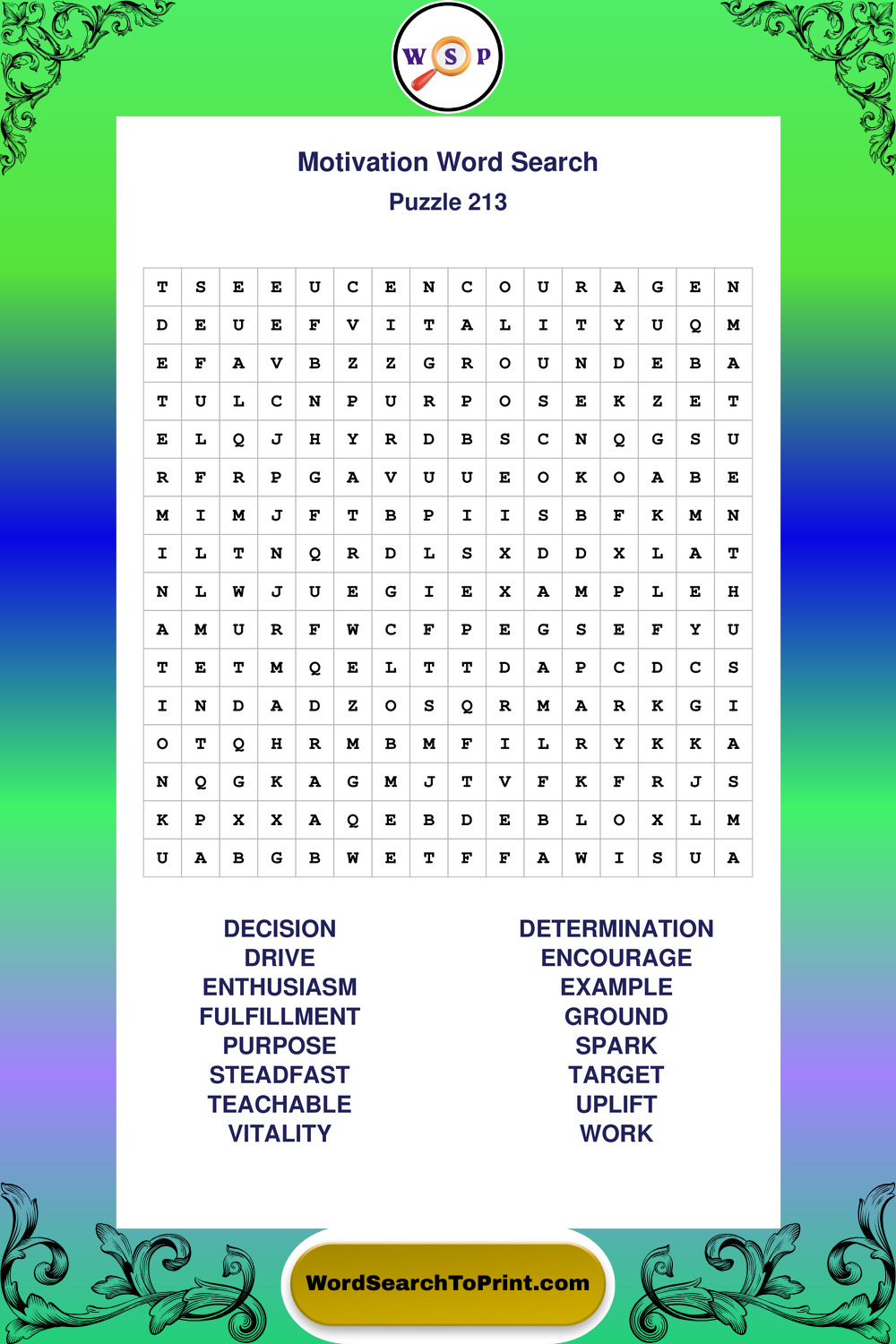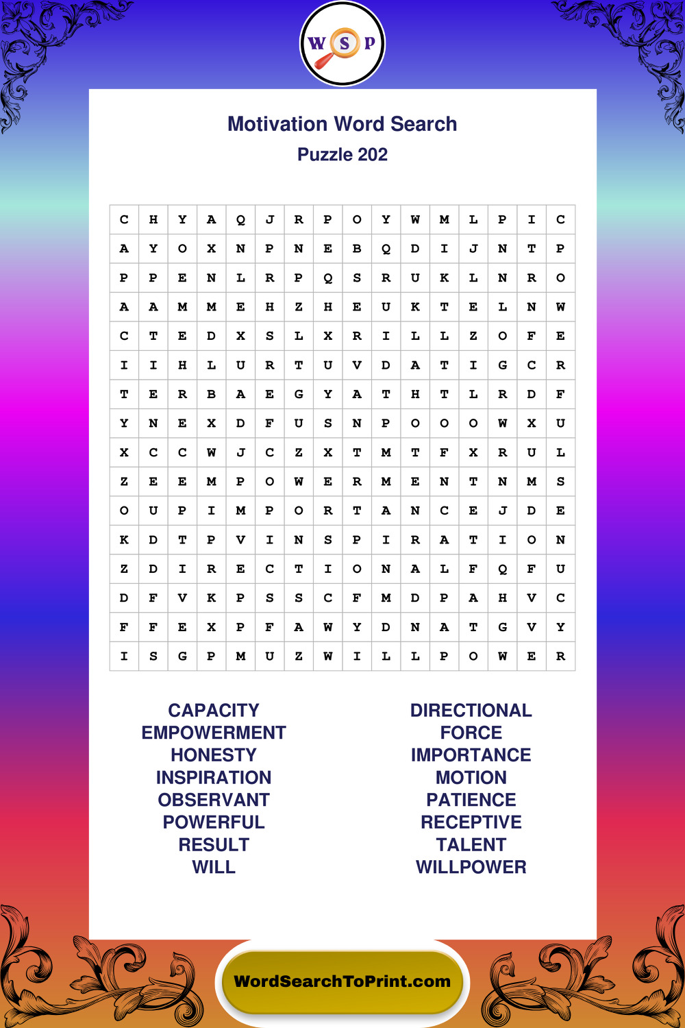 These puzzles focus on motivation, goal setting, life lessons, inspiration, and personal development concepts. They offer a structured and engaging way to explore this topic while strengthening concentration and vocabulary recognition. You may also enjoy our Inspiration word search puzzles and Wisdom word search puzzles.