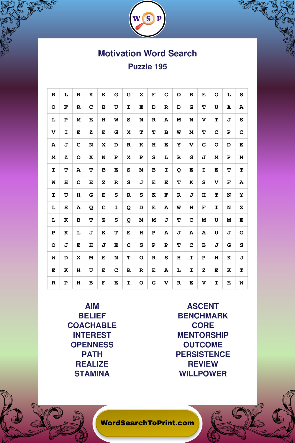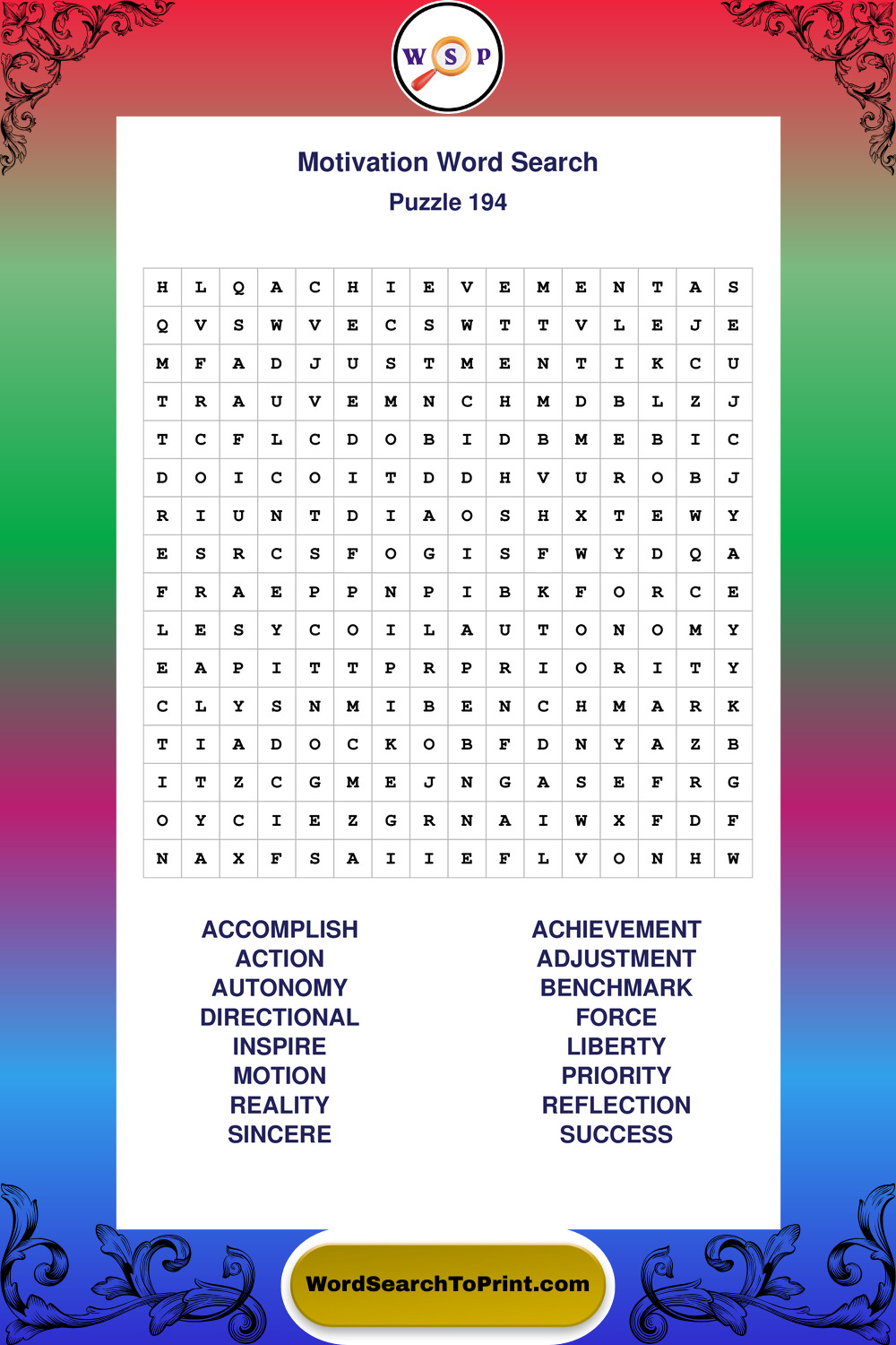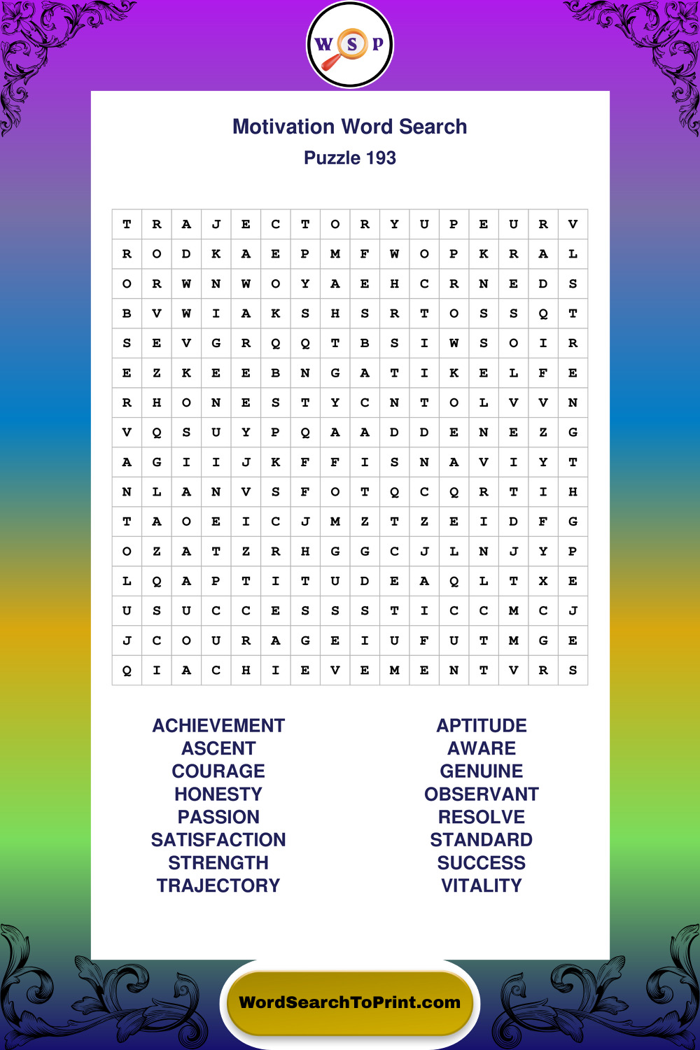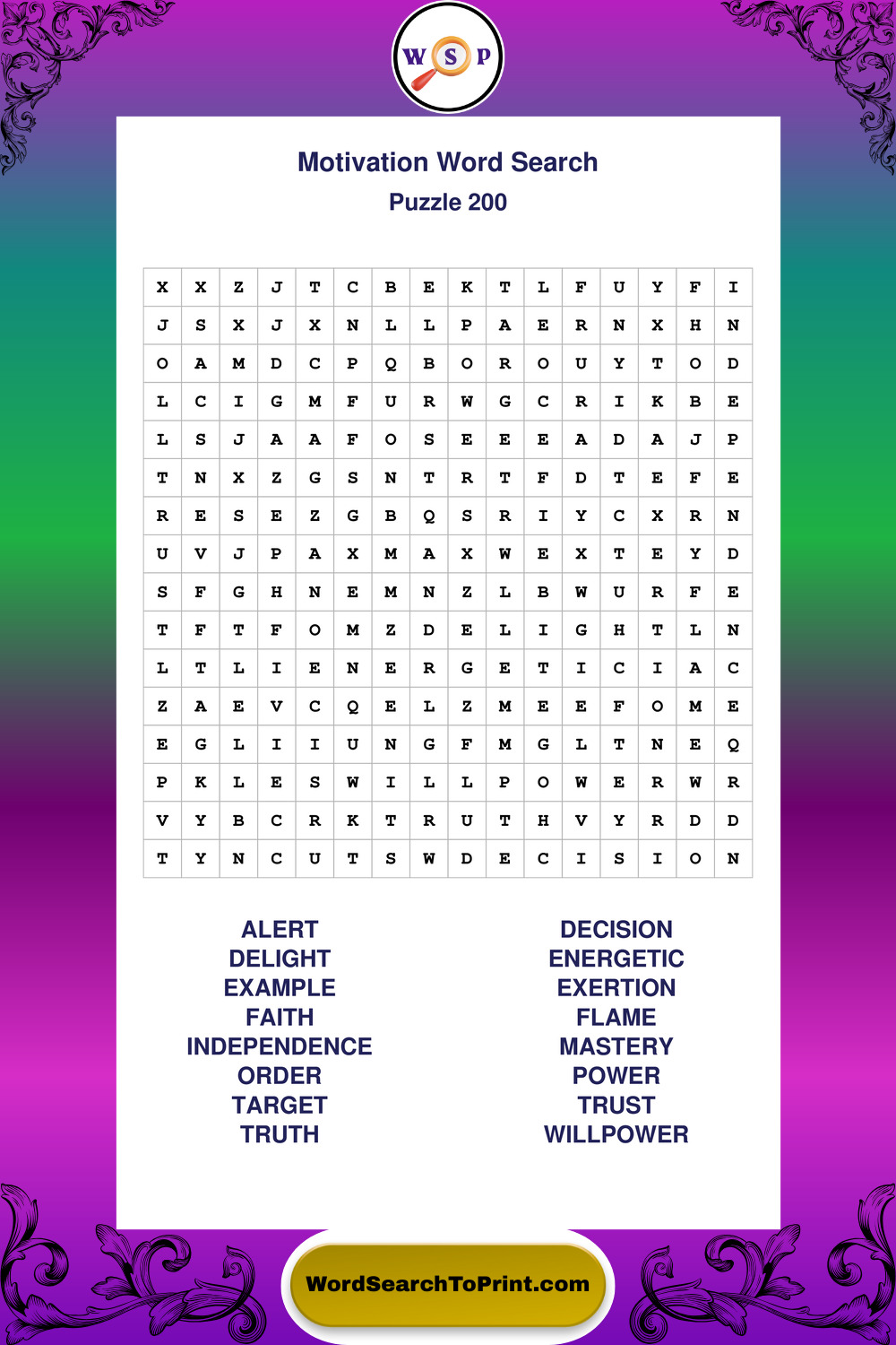 These puzzles focus on motivation, goal setting, life lessons, inspiration, and personal development concepts. They offer a structured and engaging way to explore this topic while strengthening concentration and vocabulary recognition. You may also enjoy our Inspiration word search puzzles and Wisdom word search puzzles.