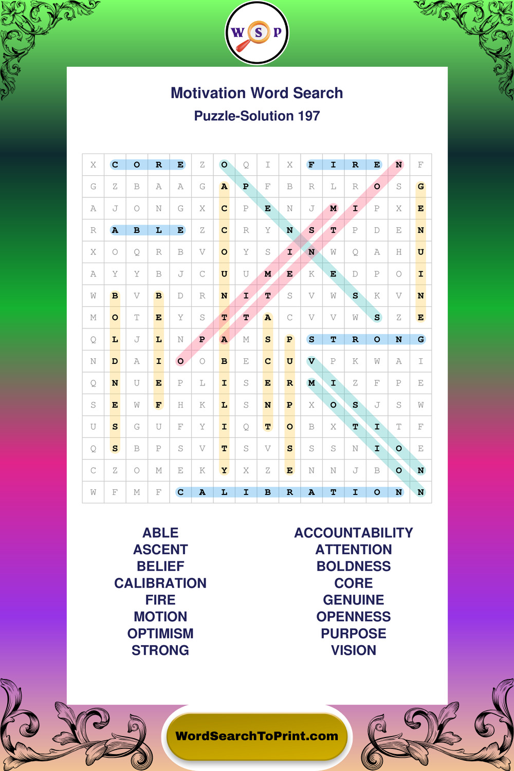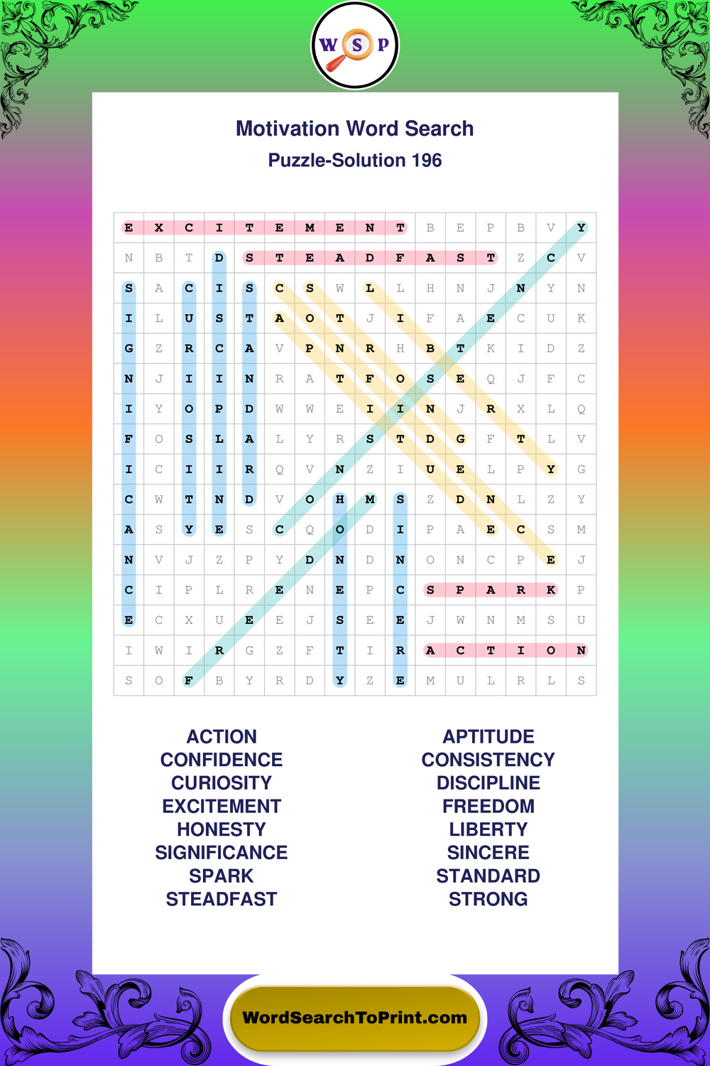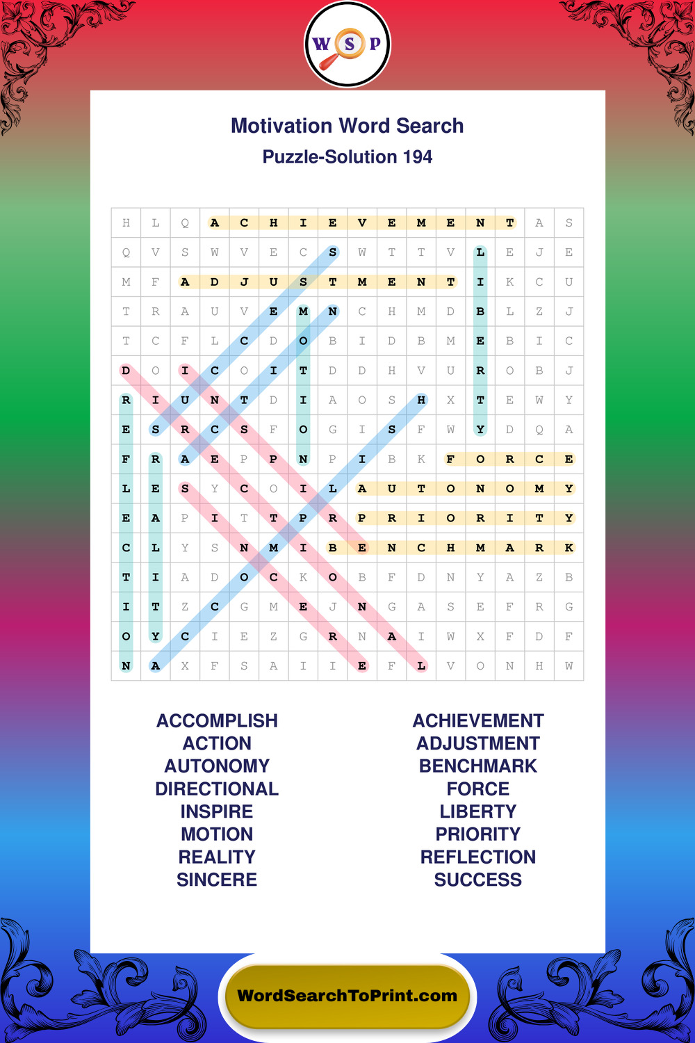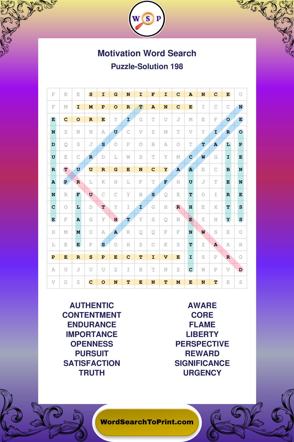 These puzzles focus on motivation, goal setting, life lessons, inspiration, and personal development concepts. They offer a structured and engaging way to explore this topic while strengthening concentration and vocabulary recognition. You may also enjoy our Inspiration word search puzzles and Wisdom word search puzzles.