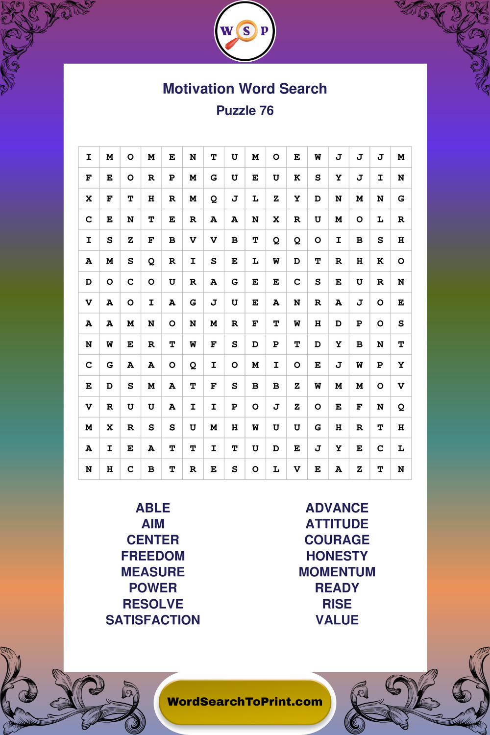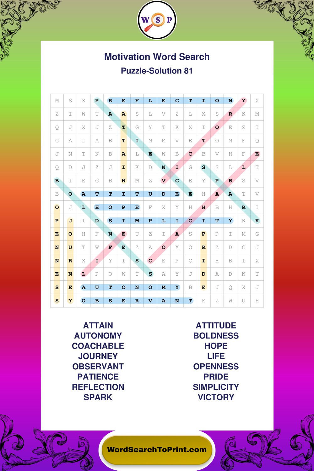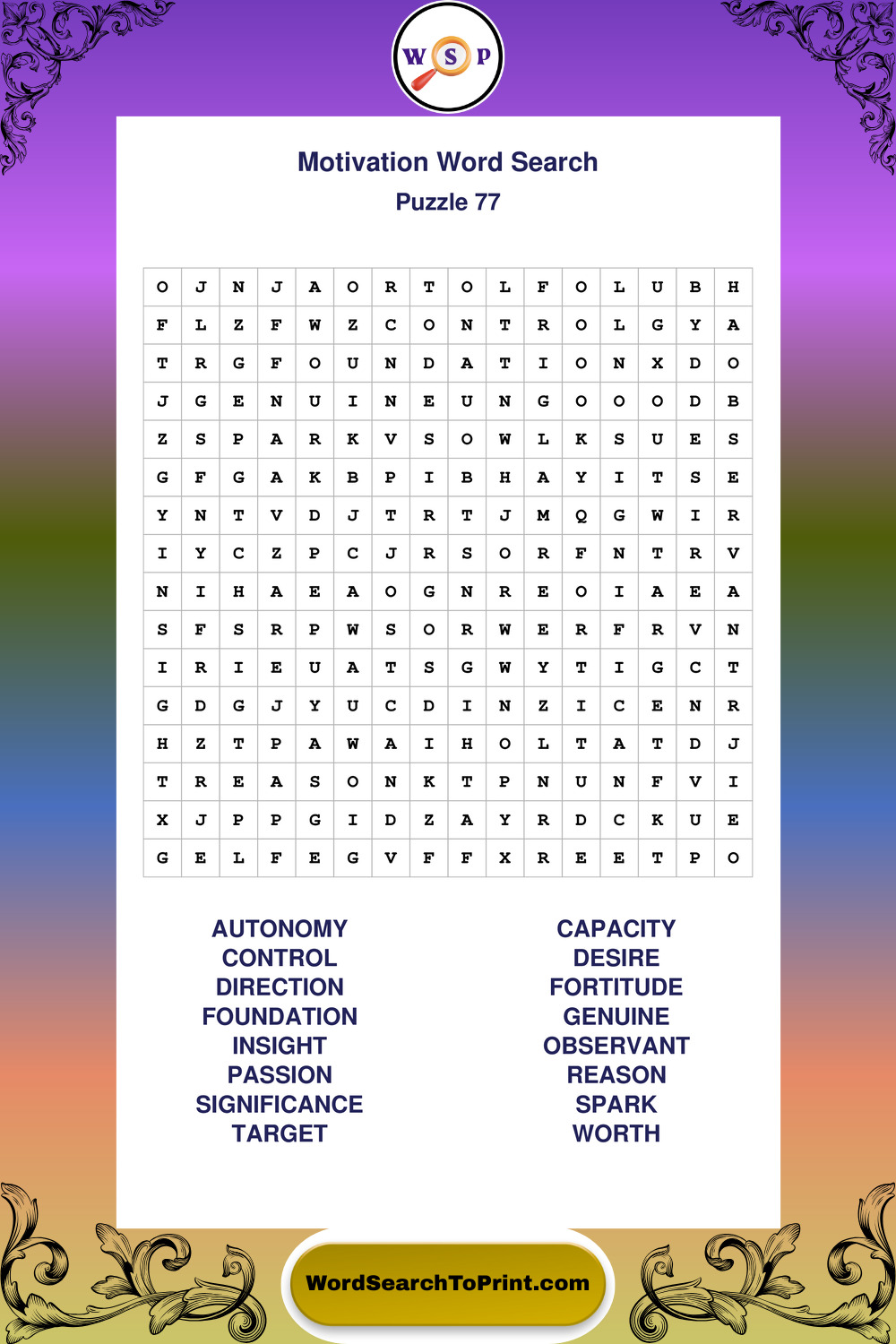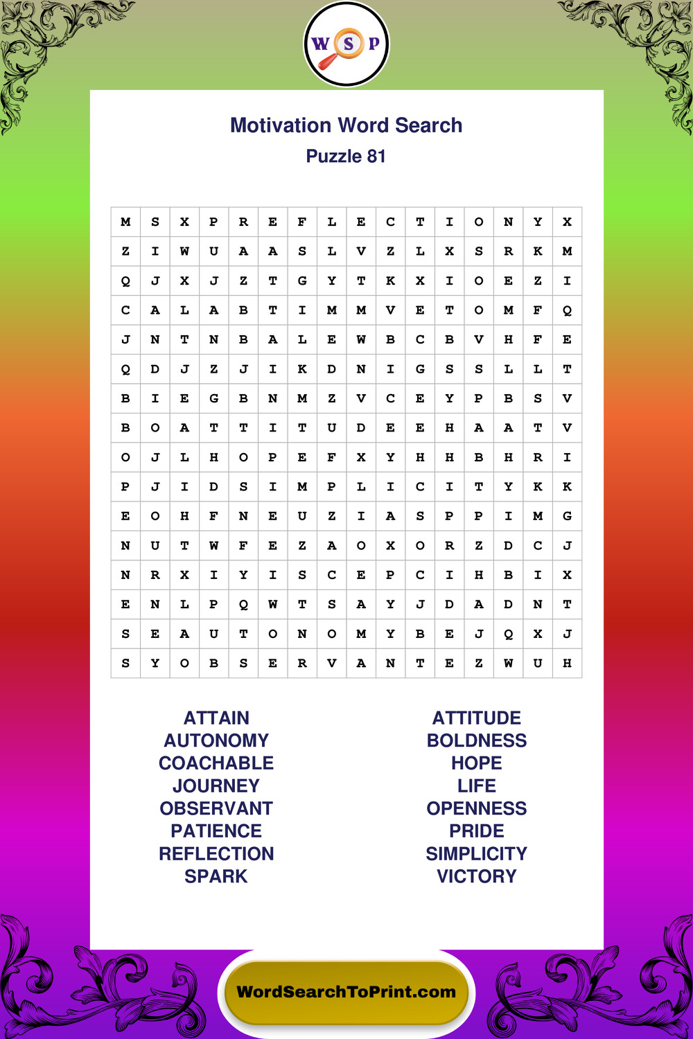 These puzzles focus on motivation, goal setting, life lessons, inspiration, and personal development concepts. They offer a structured and engaging way to explore this topic while strengthening concentration and vocabulary recognition. You may also enjoy our Inspiration word search puzzles and Wisdom word search puzzles.