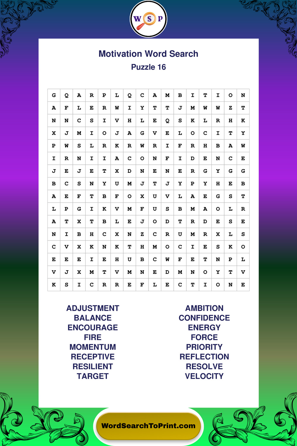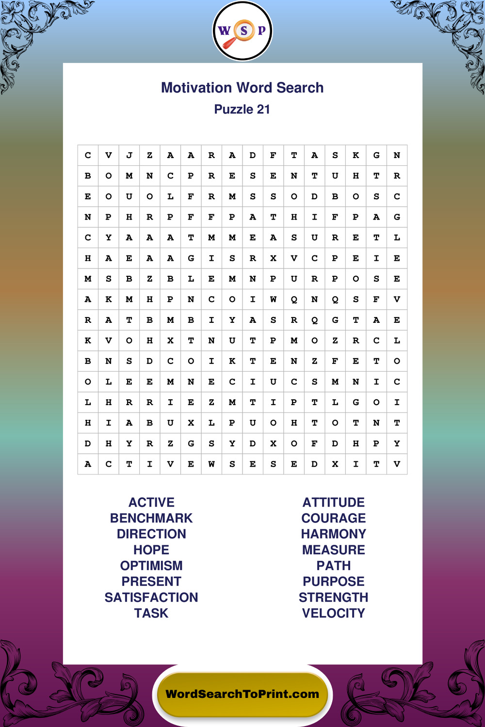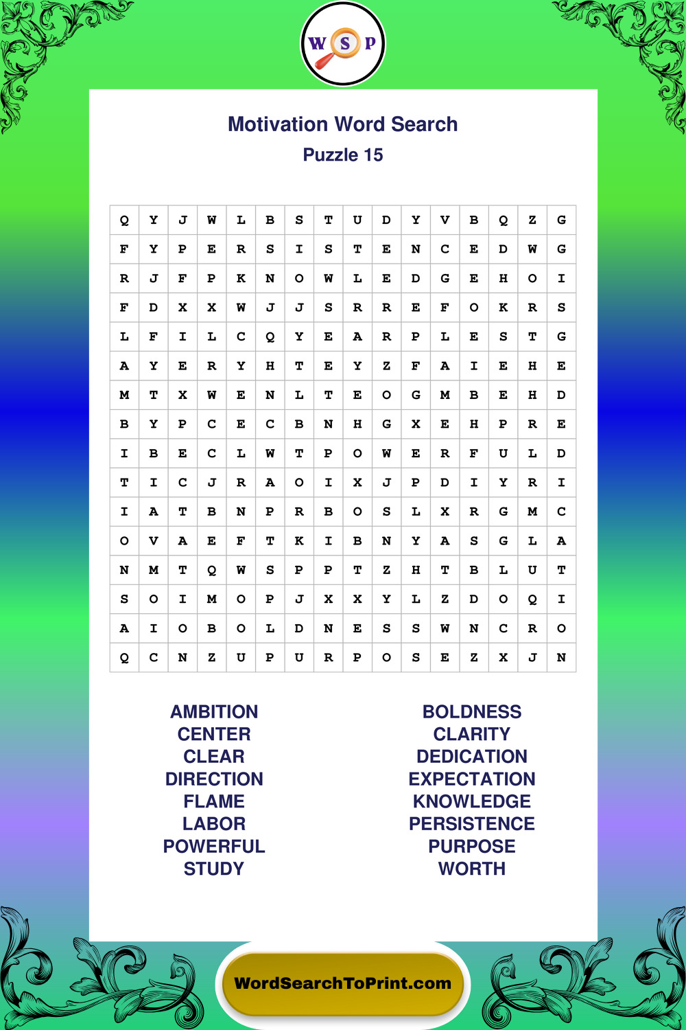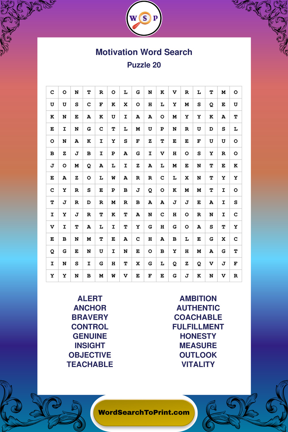 These puzzles focus on motivation, goal setting, life lessons, inspiration, and personal development concepts. They offer a structured and engaging way to explore this topic while strengthening concentration and vocabulary recognition. You may also enjoy our Inspiration word search puzzles and Wisdom word search puzzles.