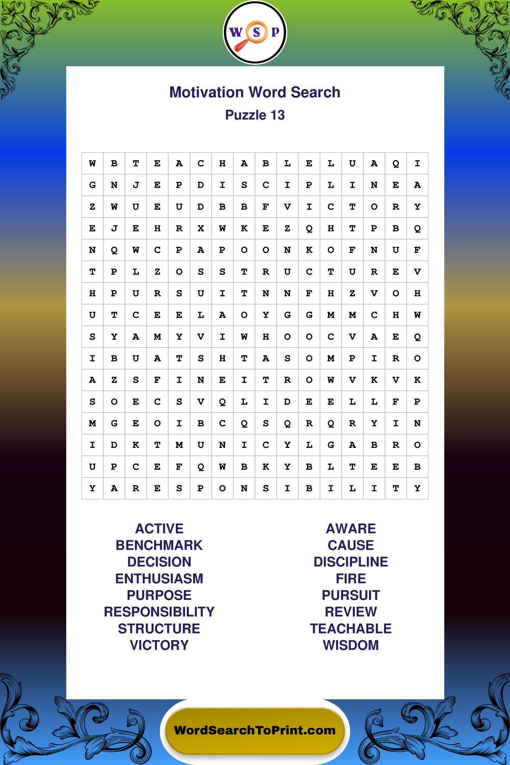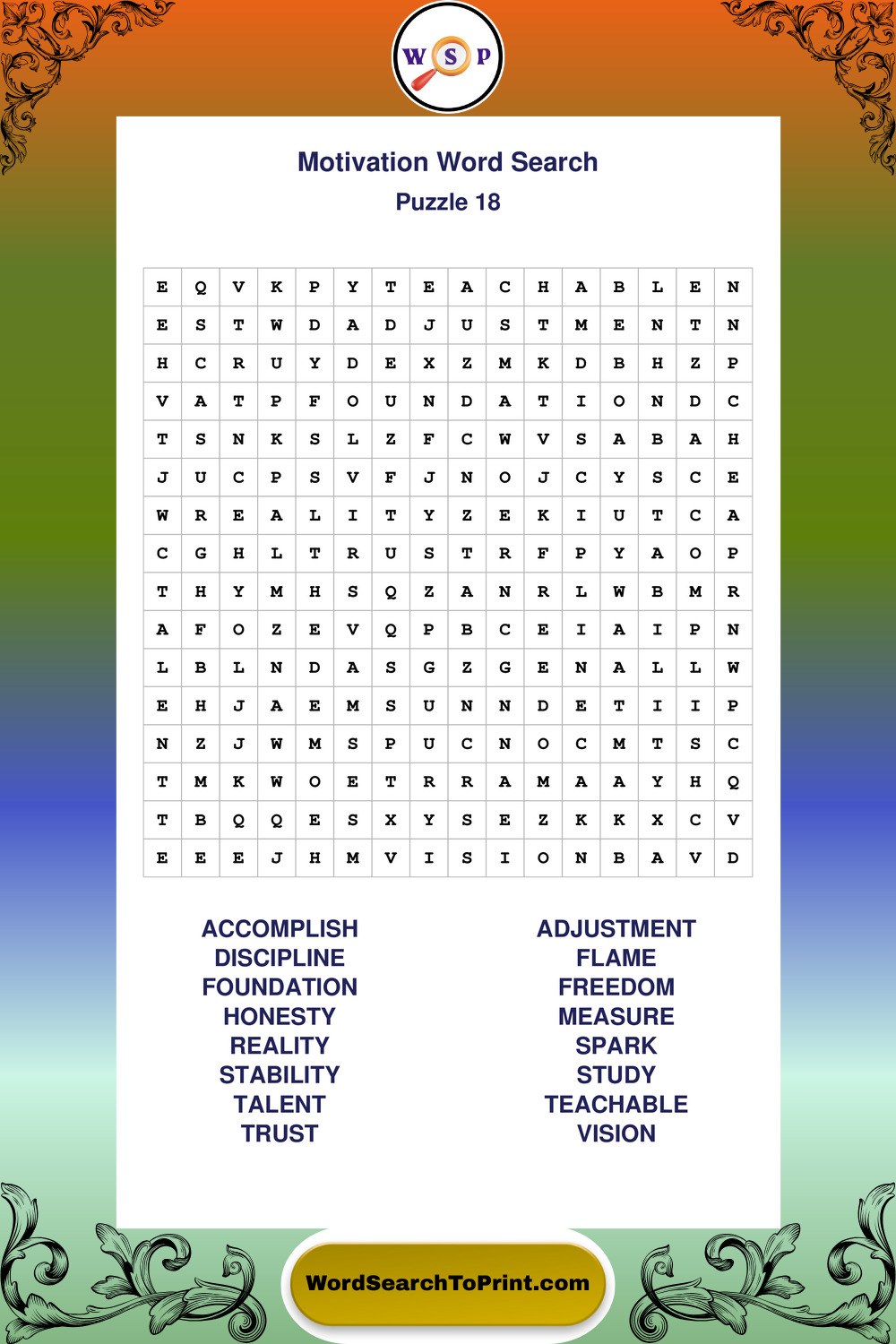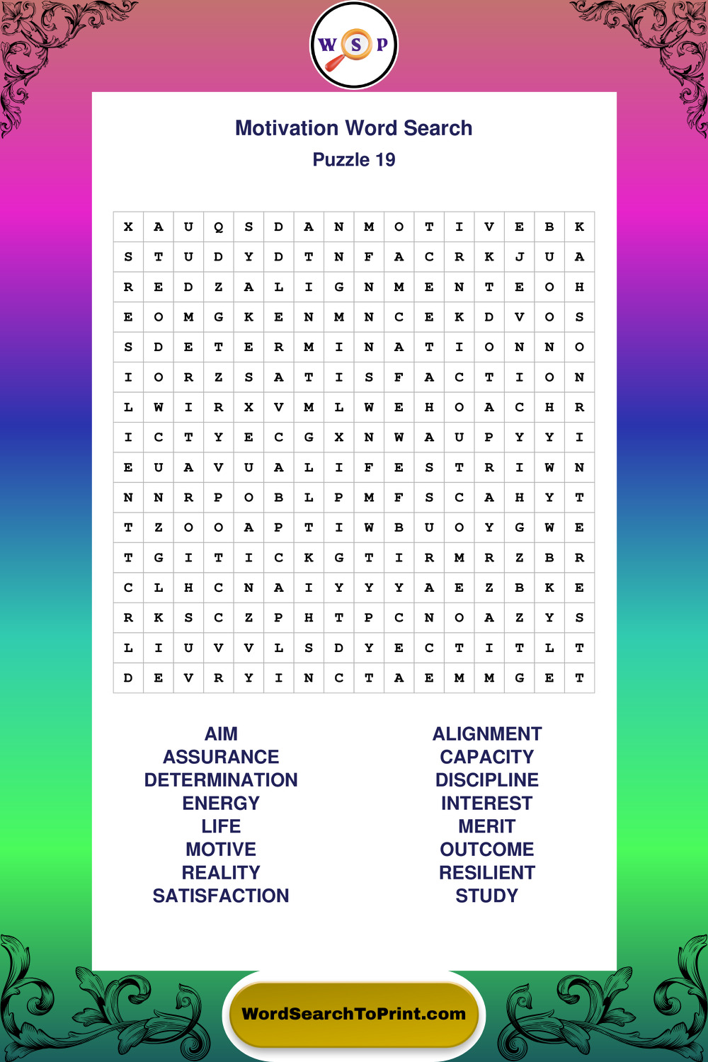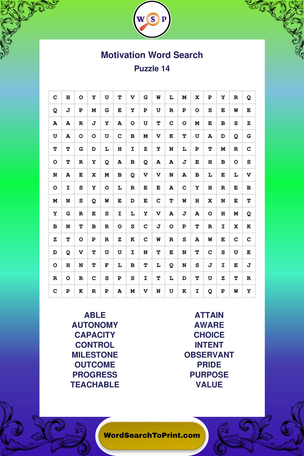 These puzzles focus on motivation, goal setting, life lessons, inspiration, and personal development concepts. They offer a structured and engaging way to explore this topic while strengthening concentration and vocabulary recognition. You may also enjoy our Inspiration word search puzzles and Wisdom word search puzzles.