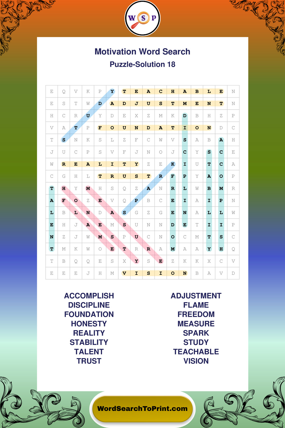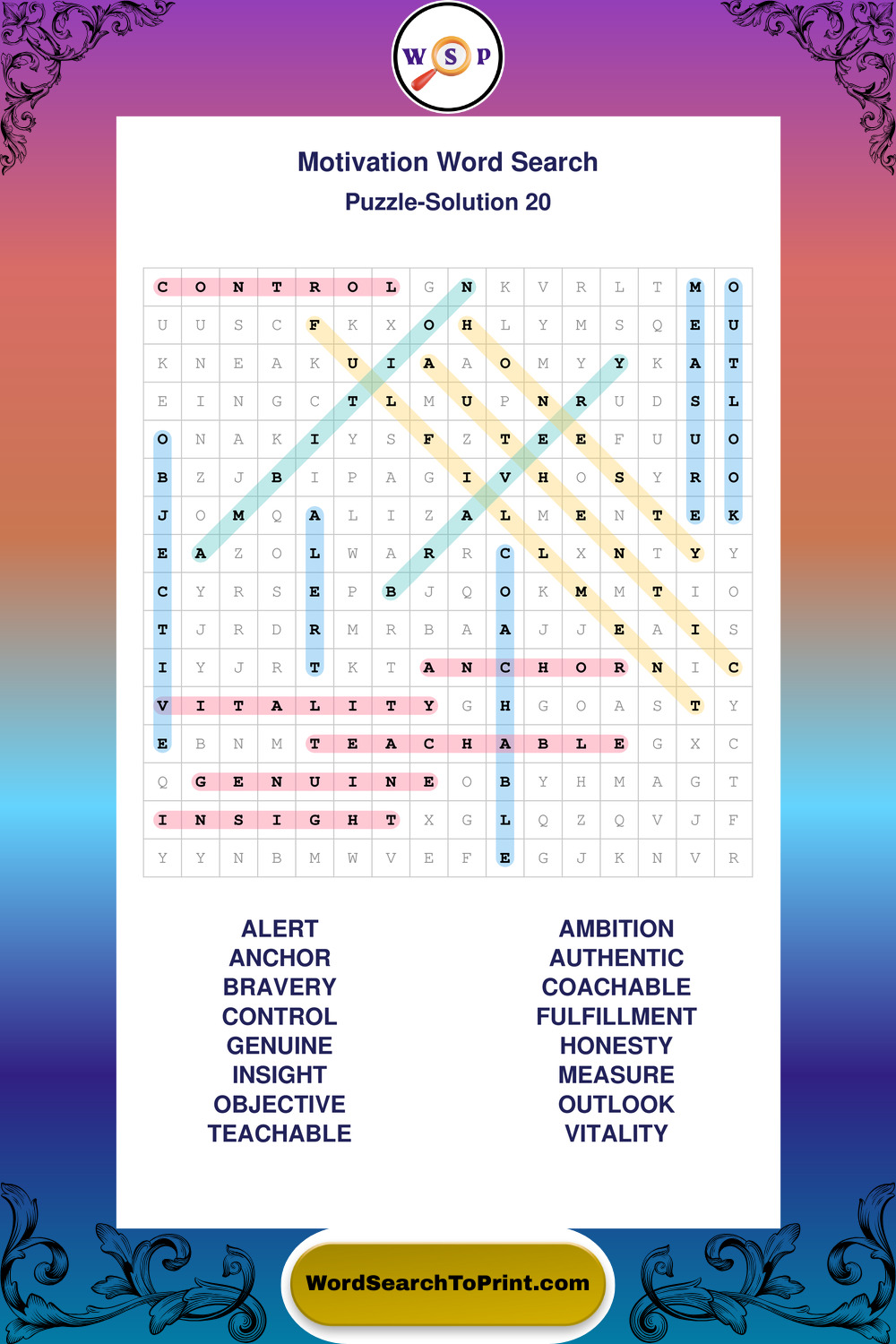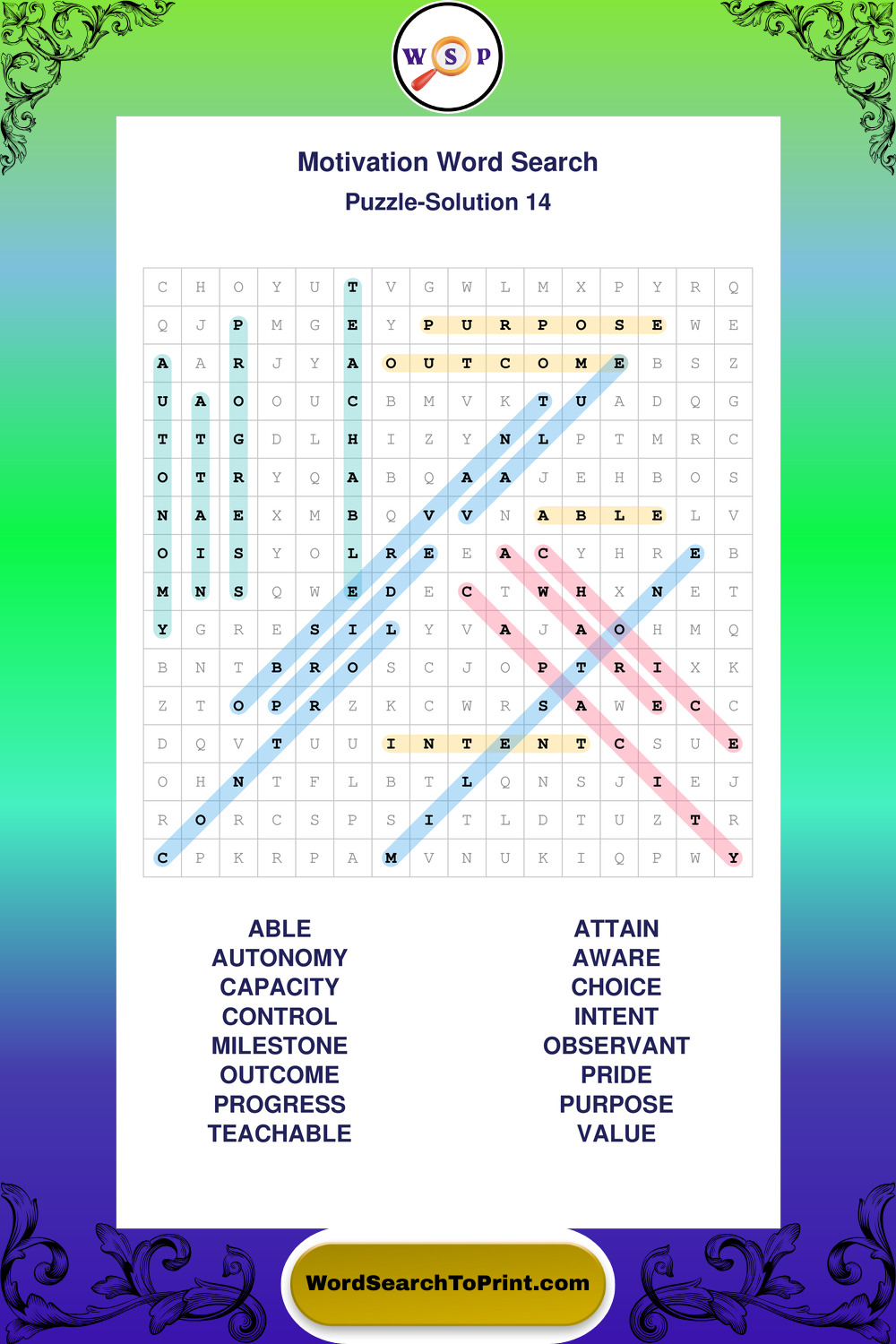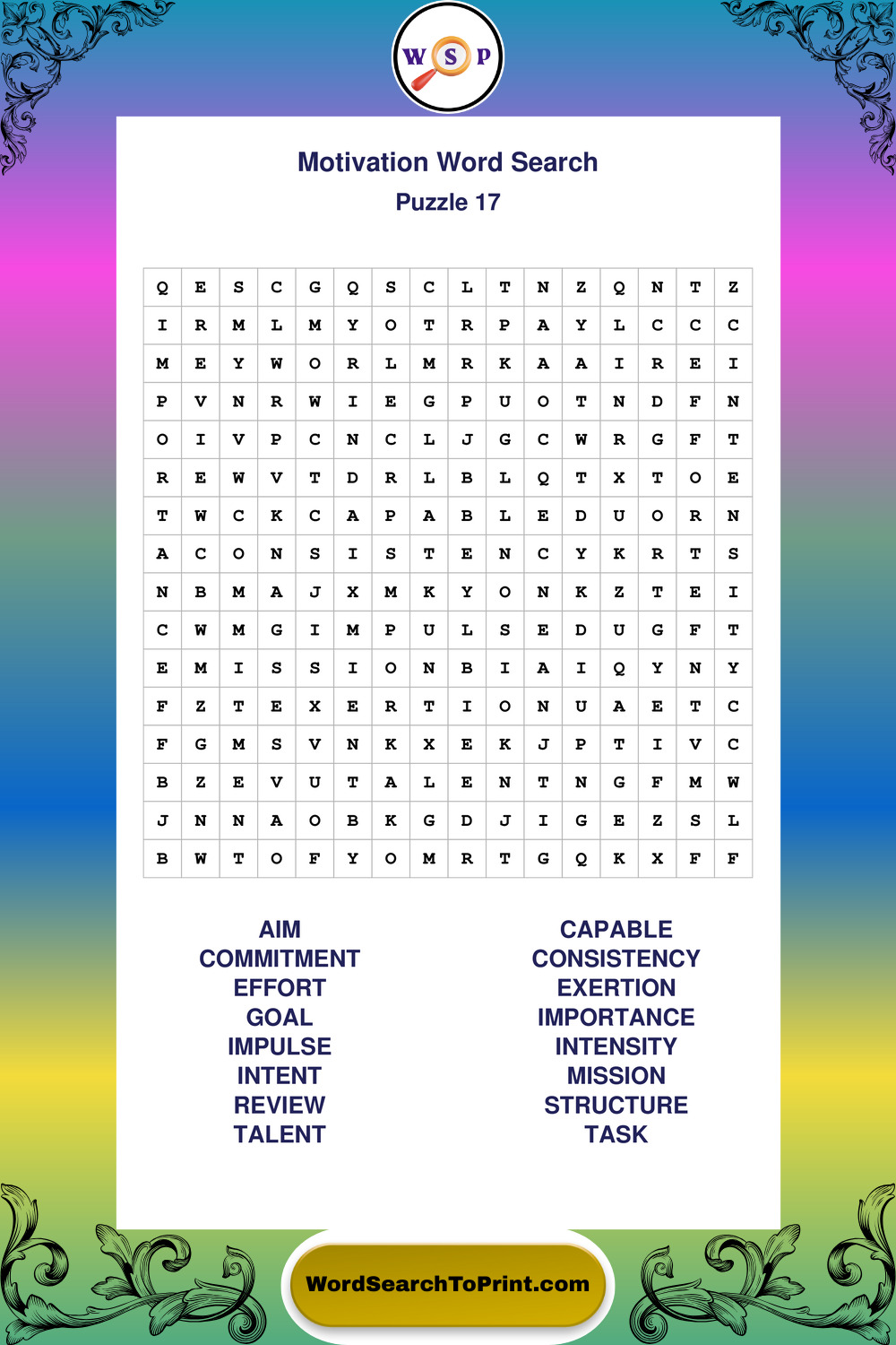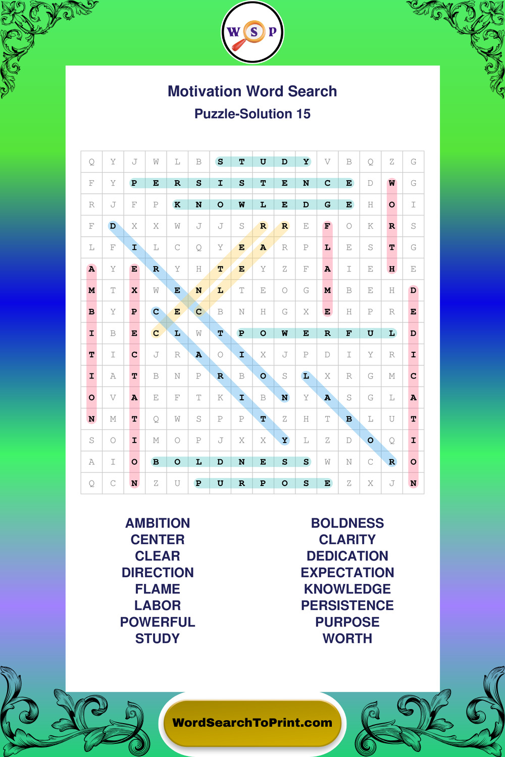 These puzzles focus on motivation, goal setting, life lessons, inspiration, and personal development concepts. They offer a structured and engaging way to explore this topic while strengthening concentration and vocabulary recognition. You may also enjoy our Inspiration word search puzzles and Wisdom word search puzzles.