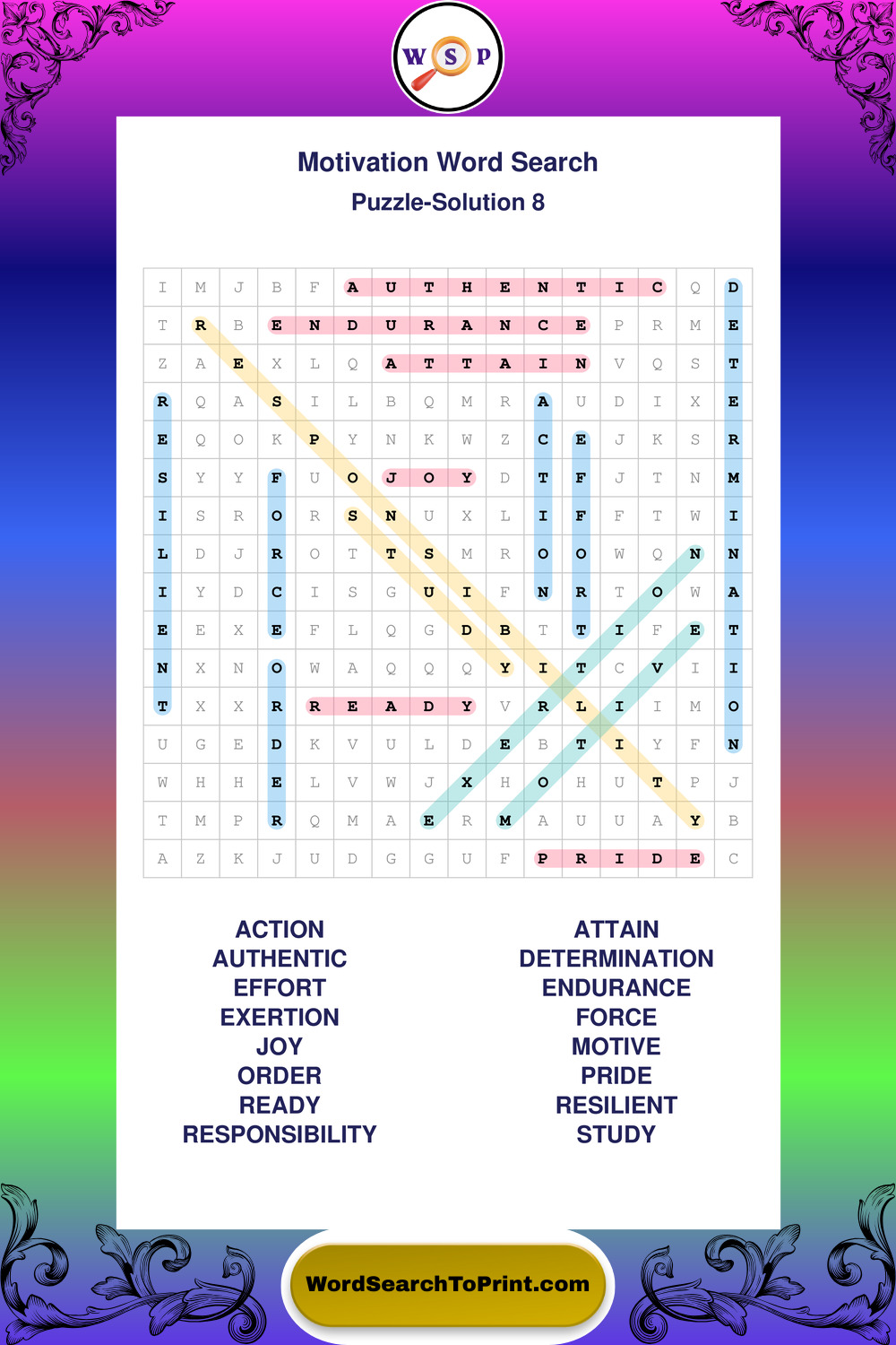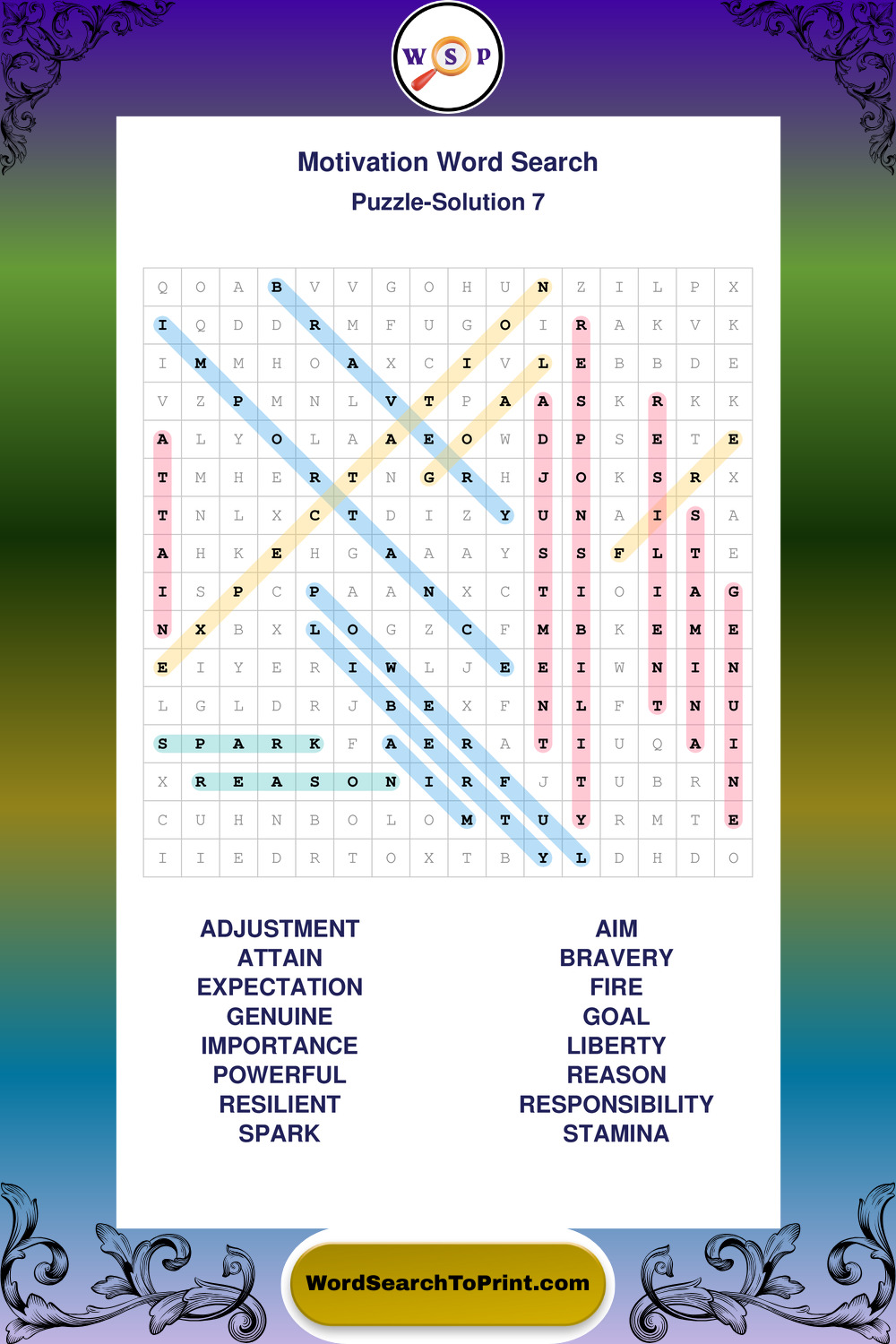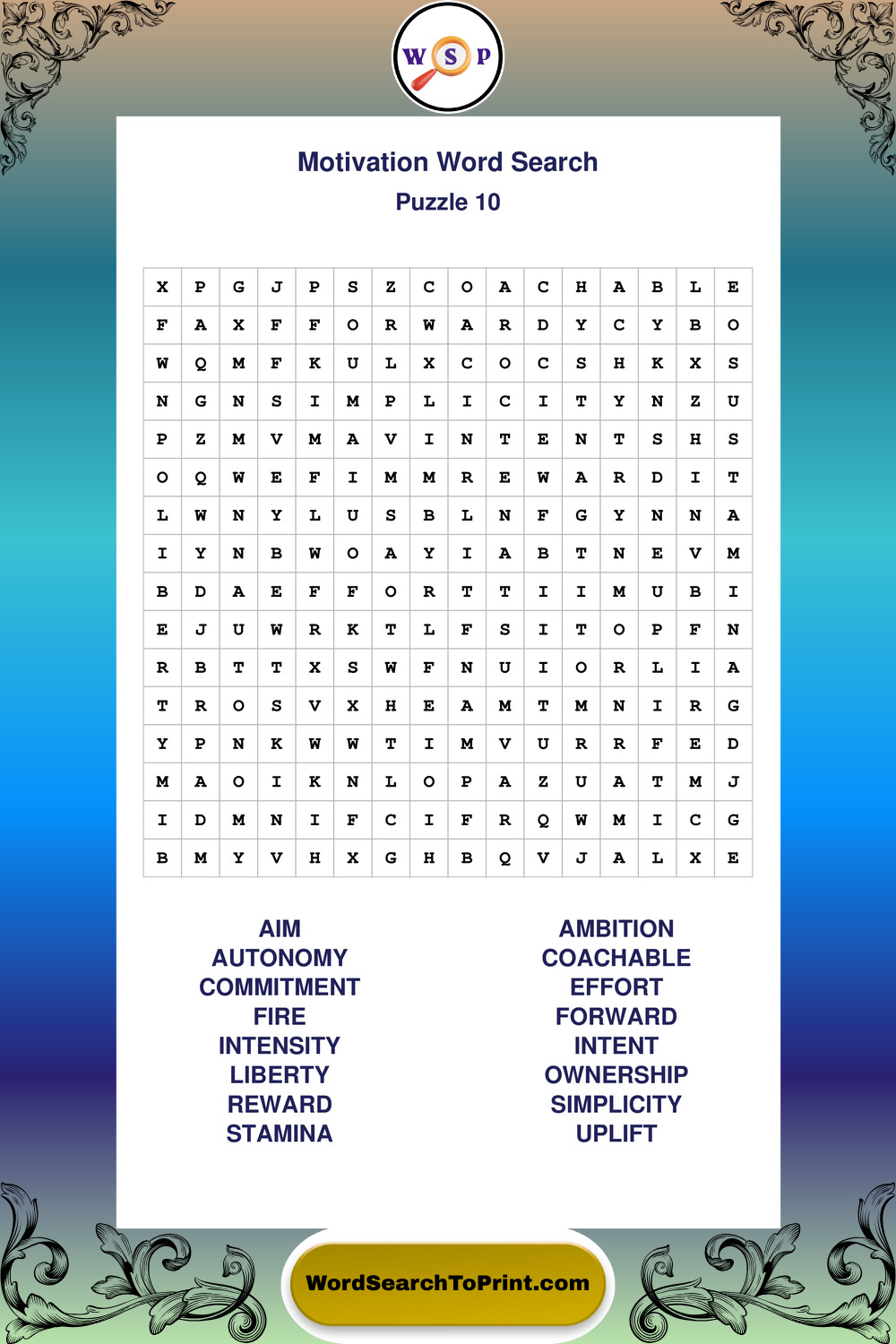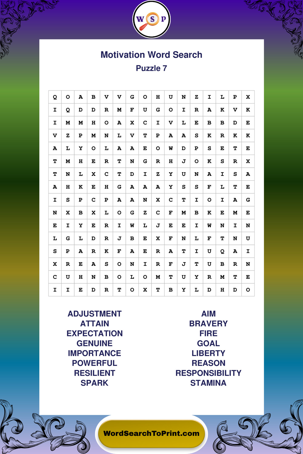 These puzzles focus on motivation, goal setting, life lessons, inspiration, and personal development concepts. They offer a structured and engaging way to explore this topic while strengthening concentration and vocabulary recognition. You may also enjoy our Inspiration word search puzzles and Wisdom word search puzzles.