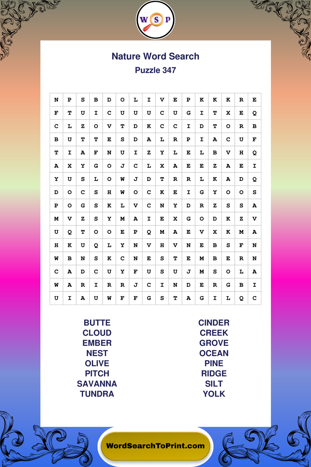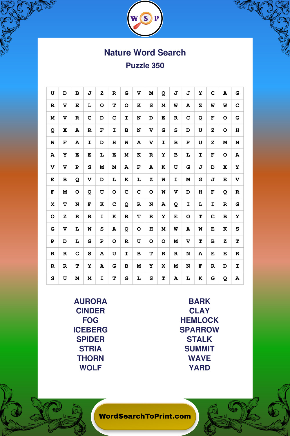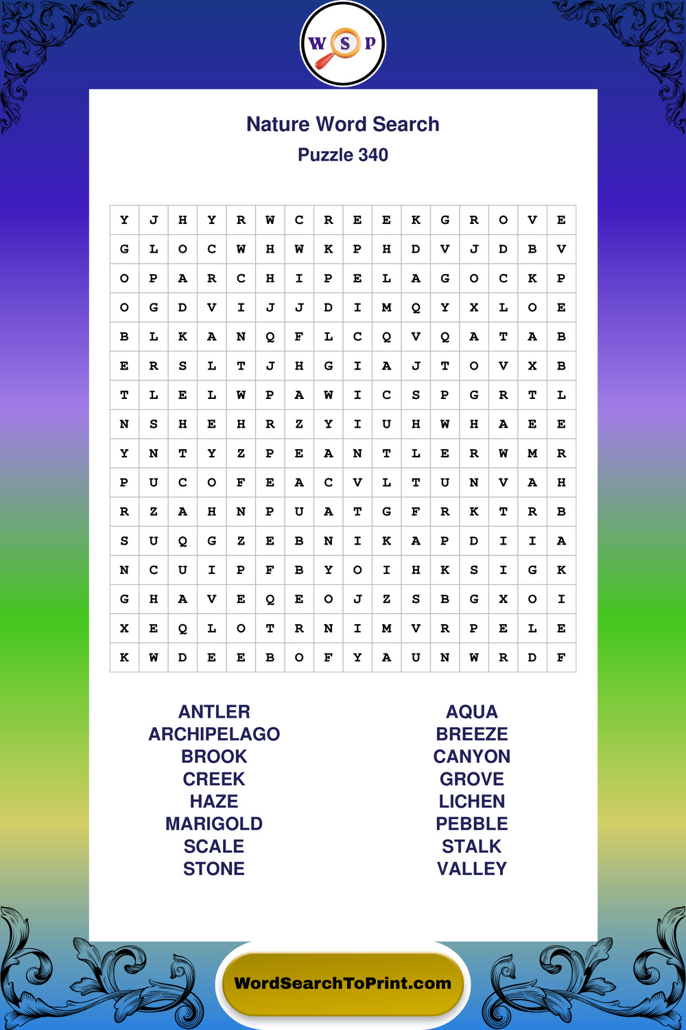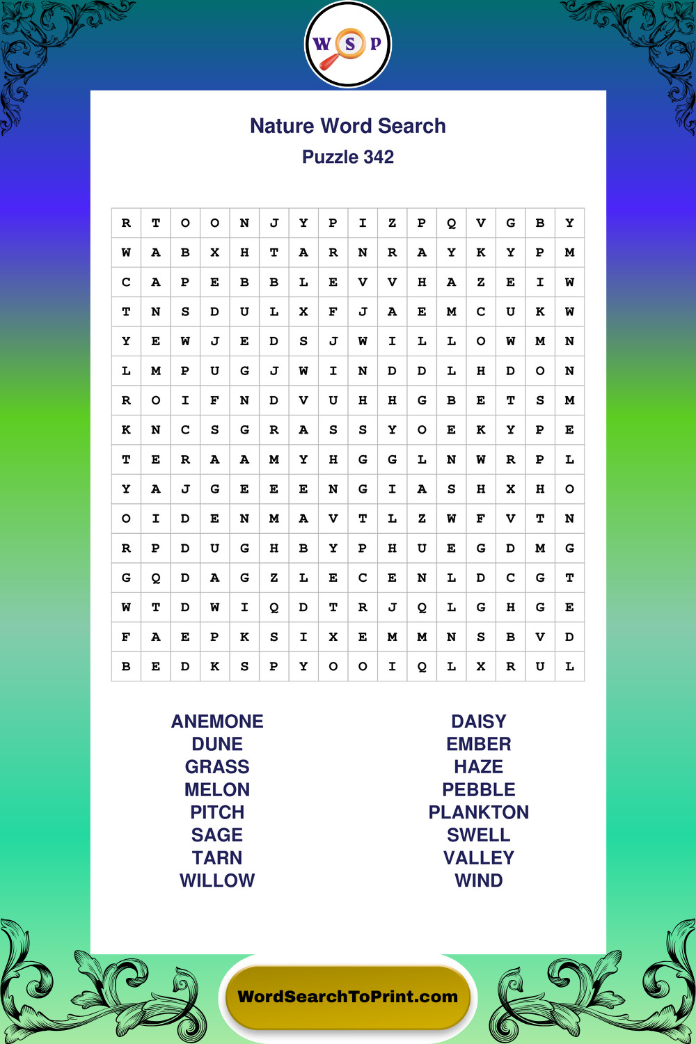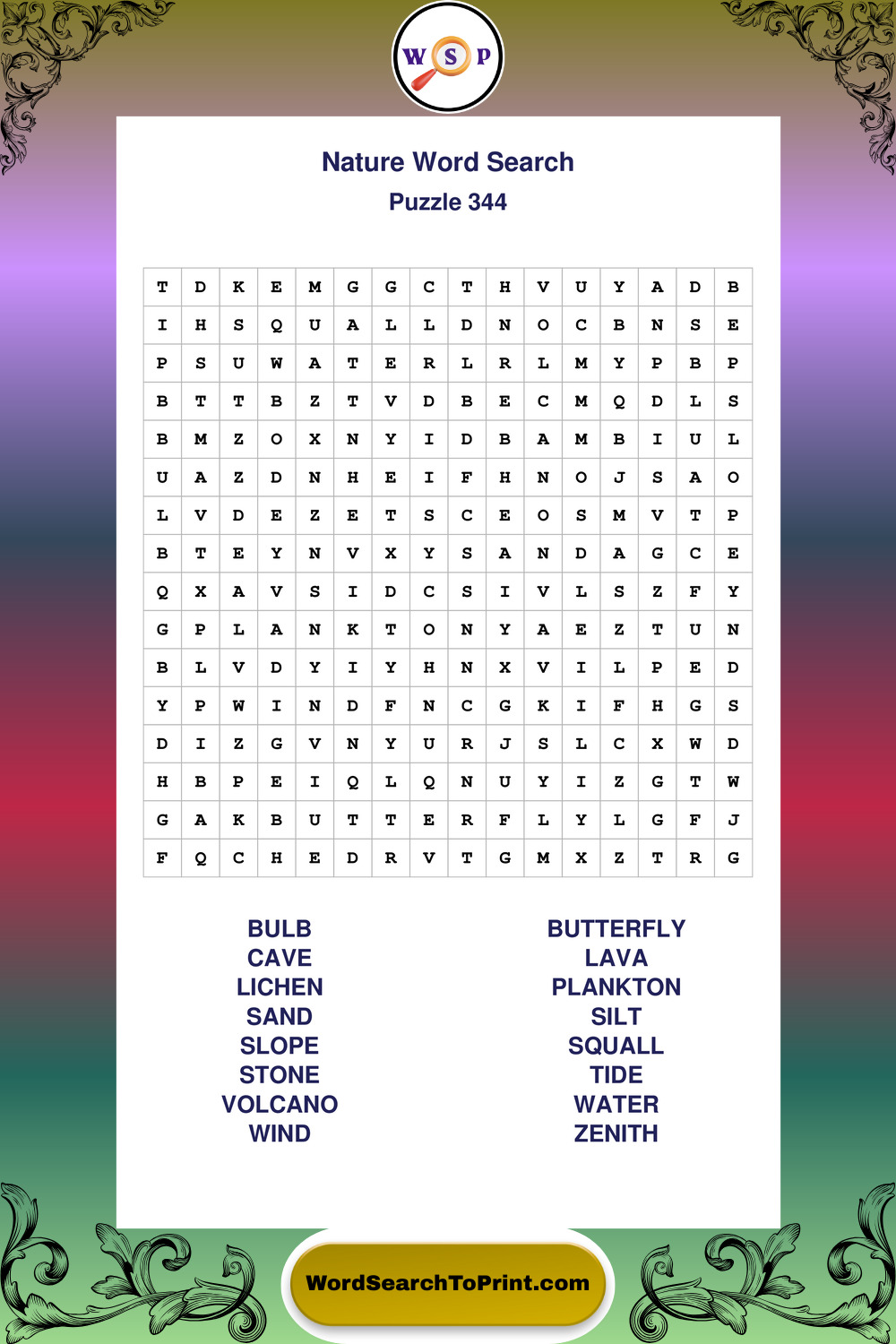 Find easy-to-read large print Nature wordsearches designed for peaceful focus and simple, enjoyable solving.