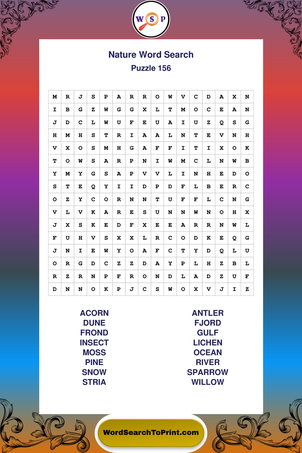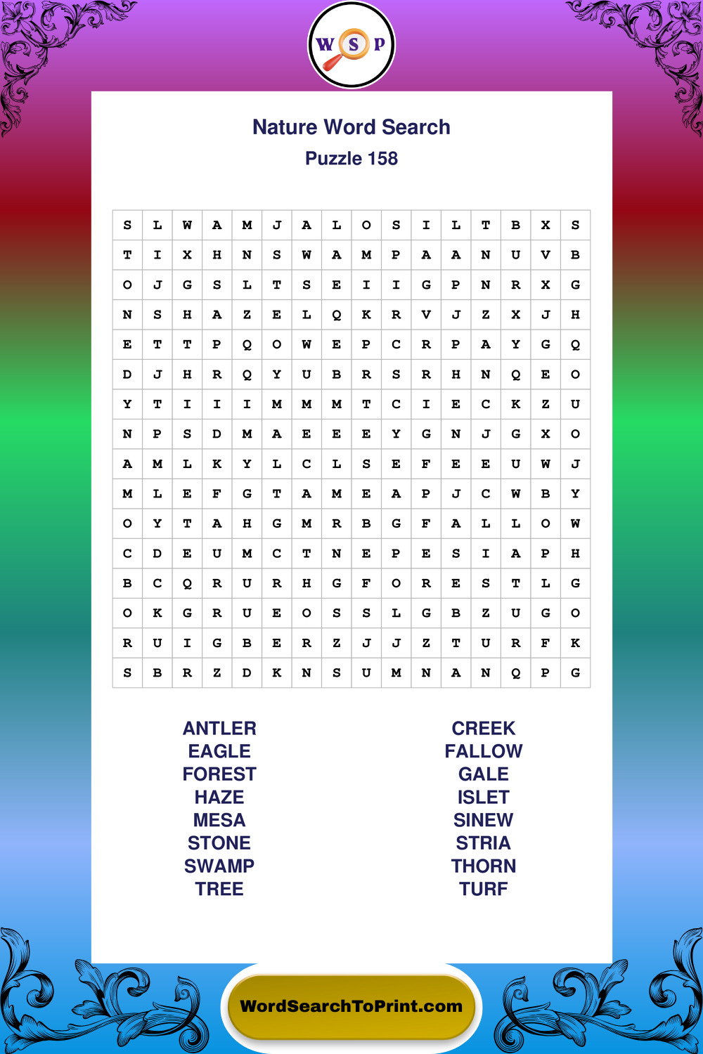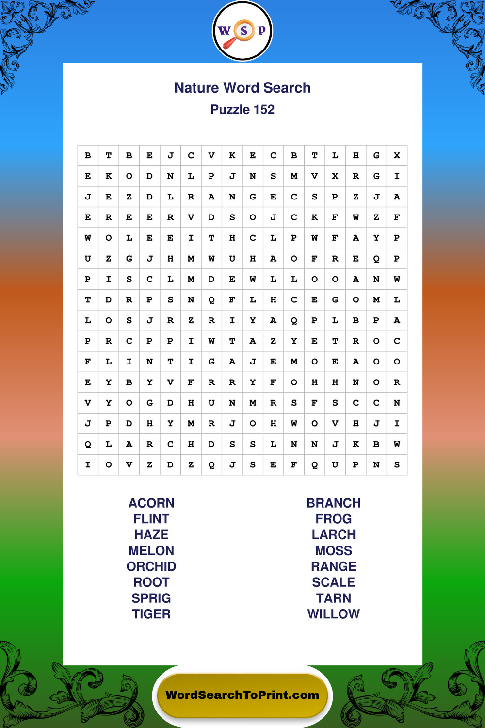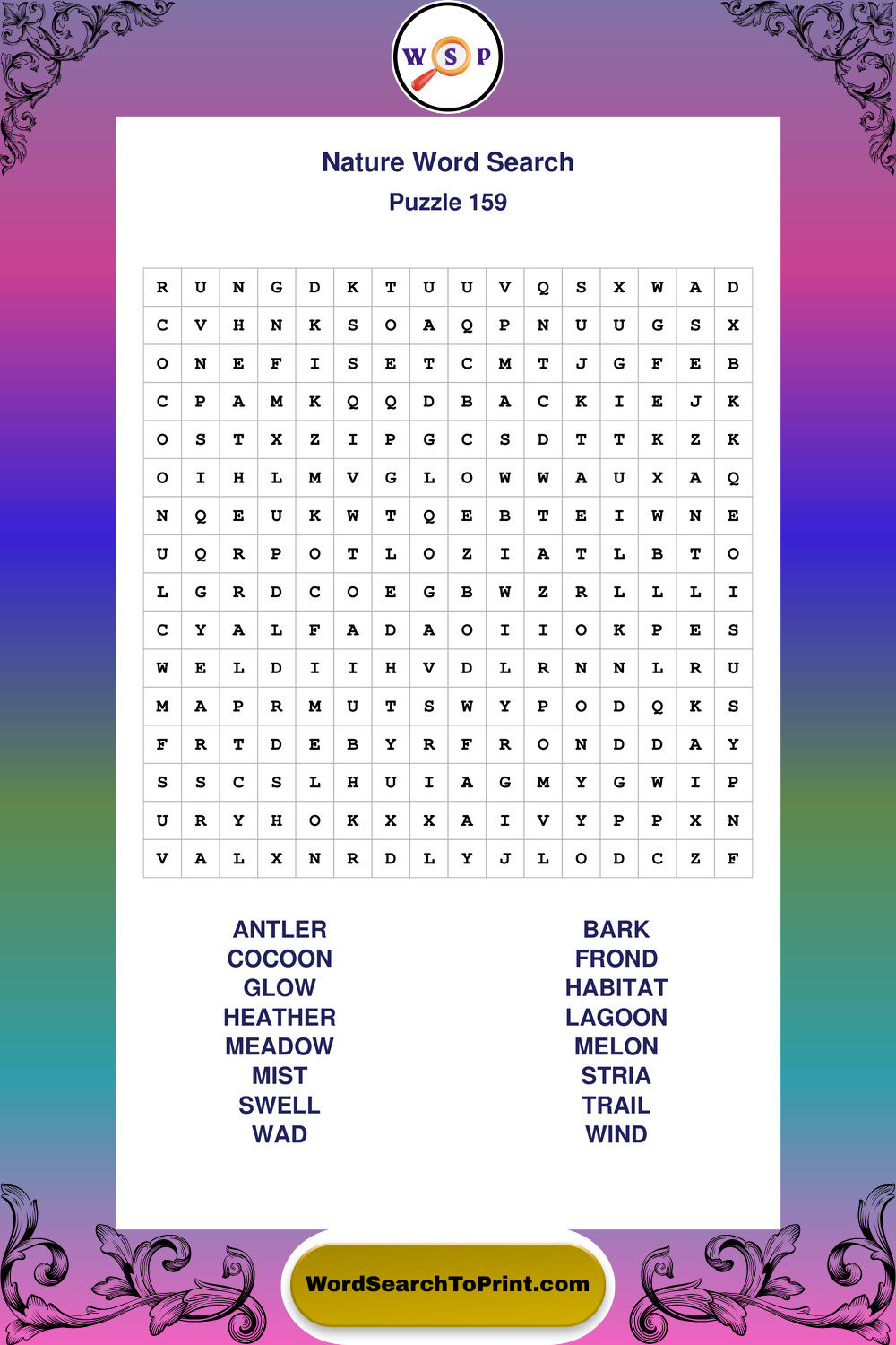 Find easy-to-read large print Nature wordsearches designed for peaceful focus and simple, enjoyable solving.