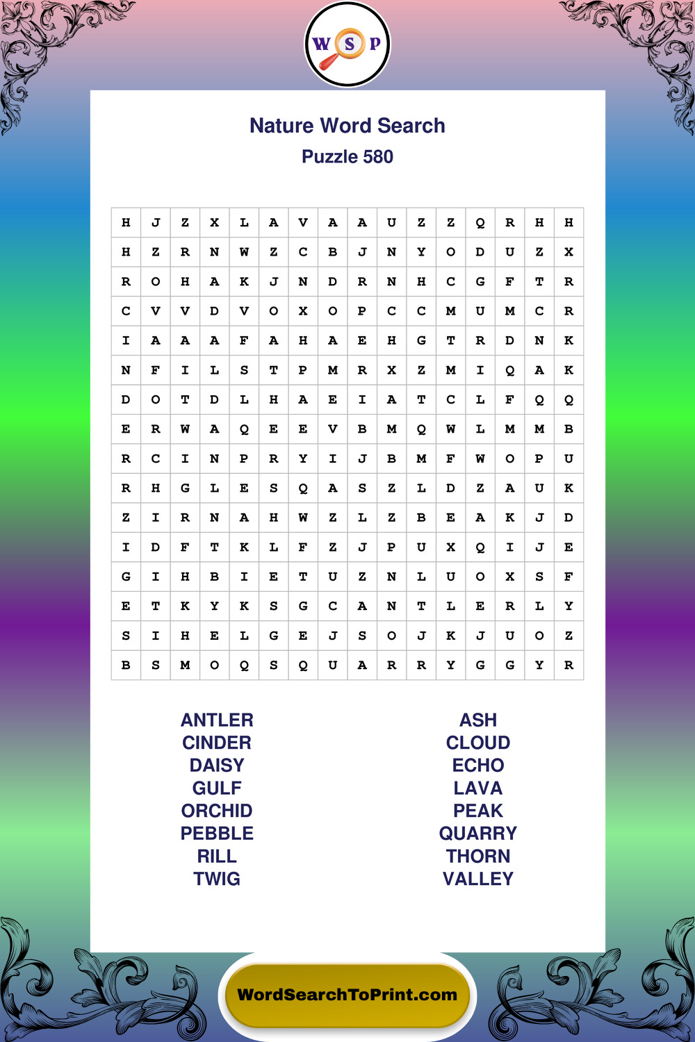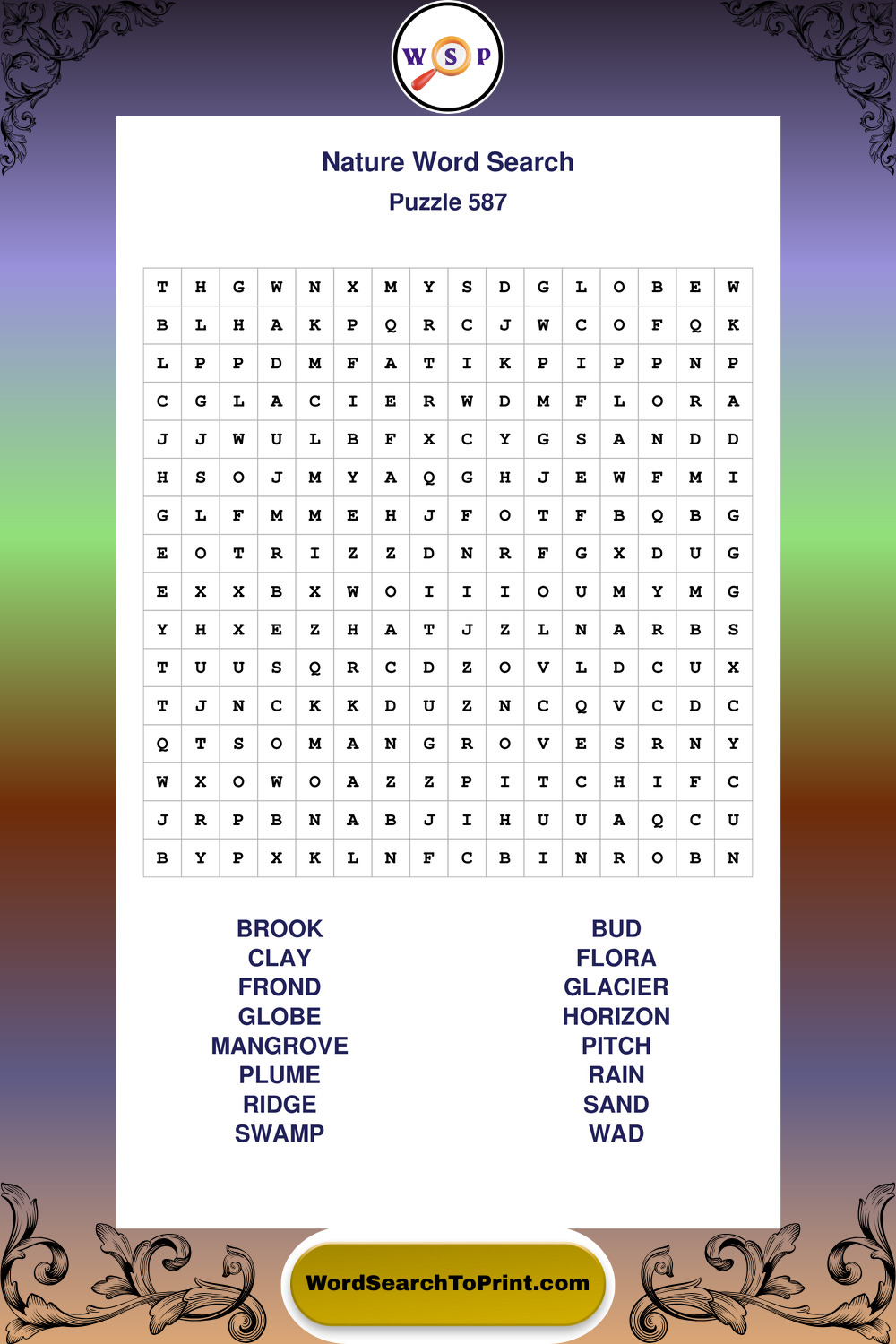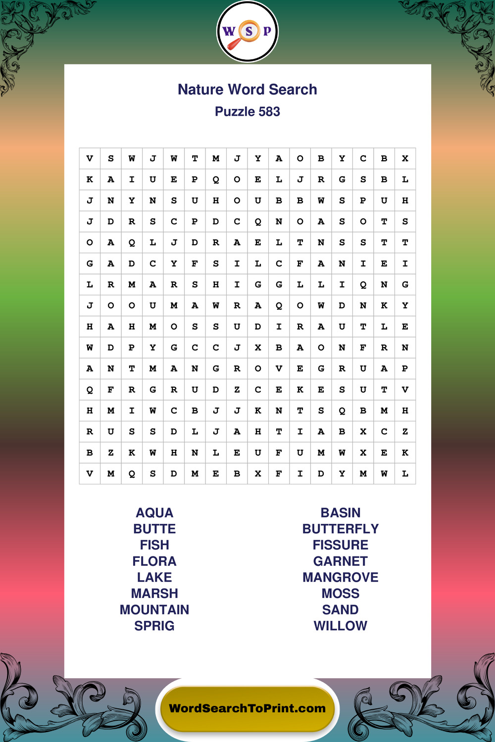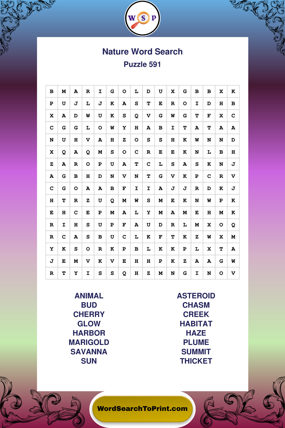 Find easy-to-read large print Nature wordsearches designed for peaceful focus and simple, enjoyable solving.