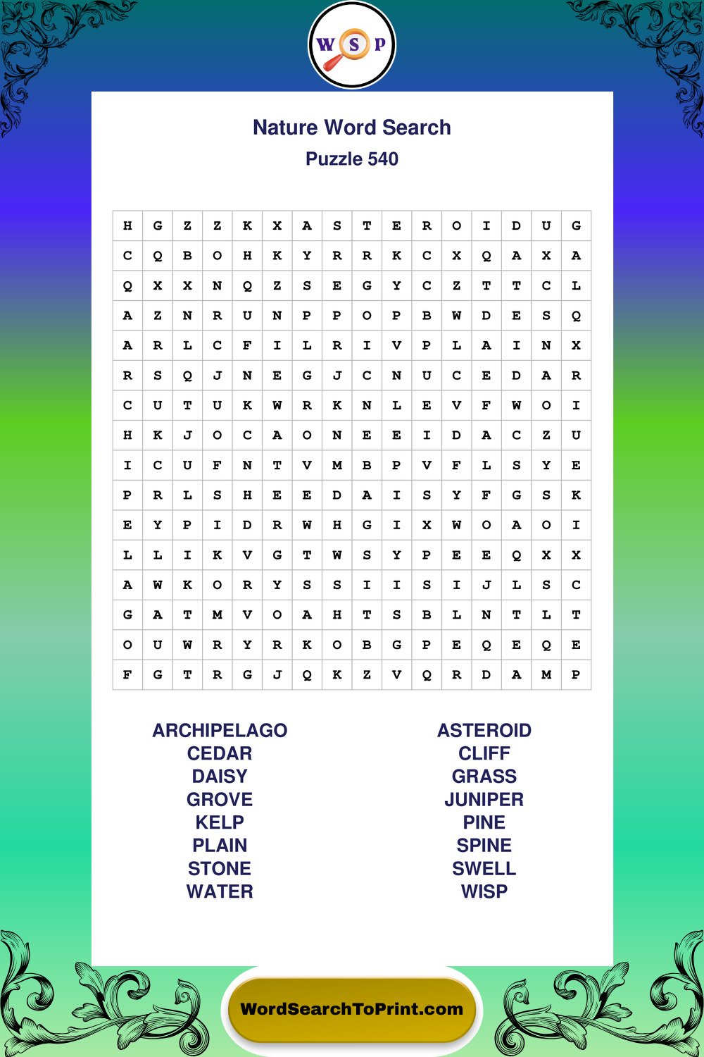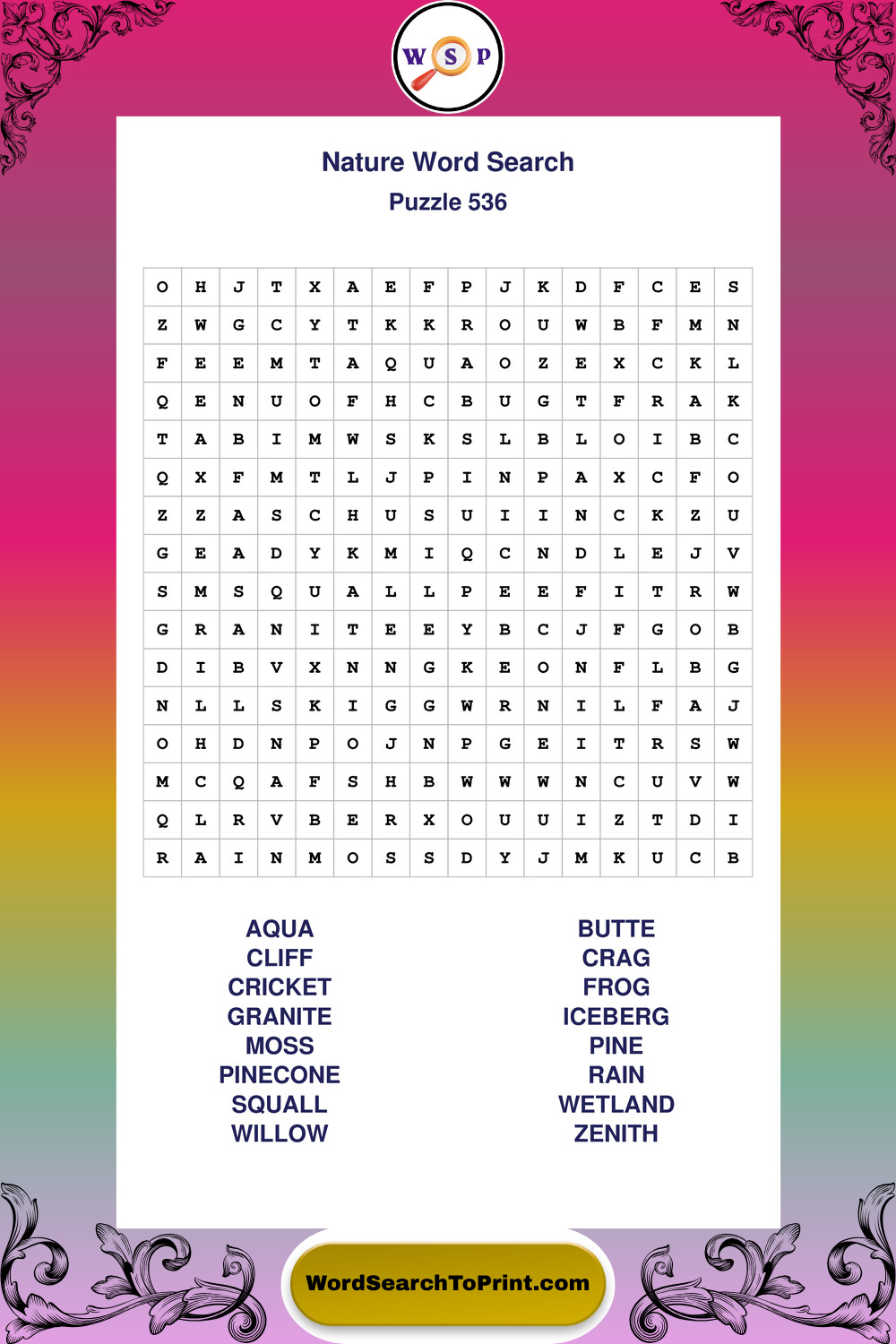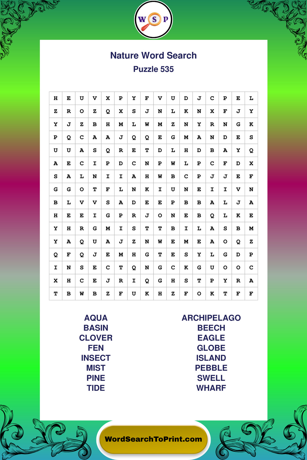 Find easy-to-read large print Nature wordsearches designed for peaceful focus and simple, enjoyable solving.