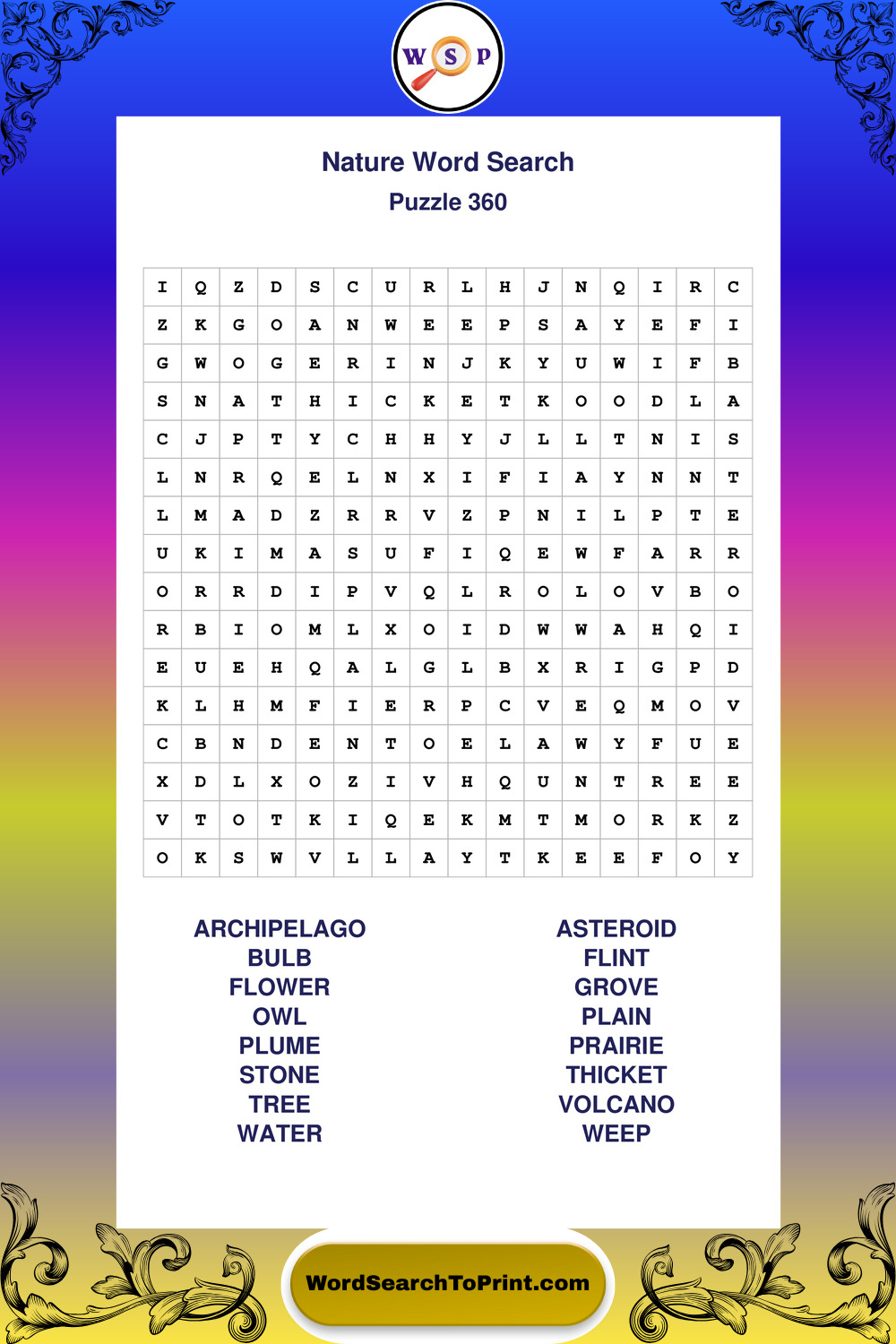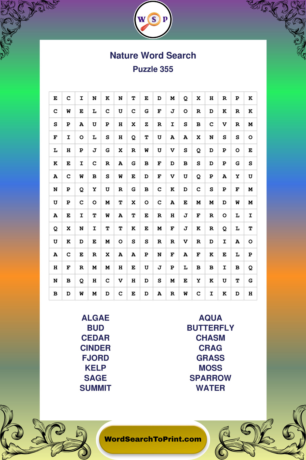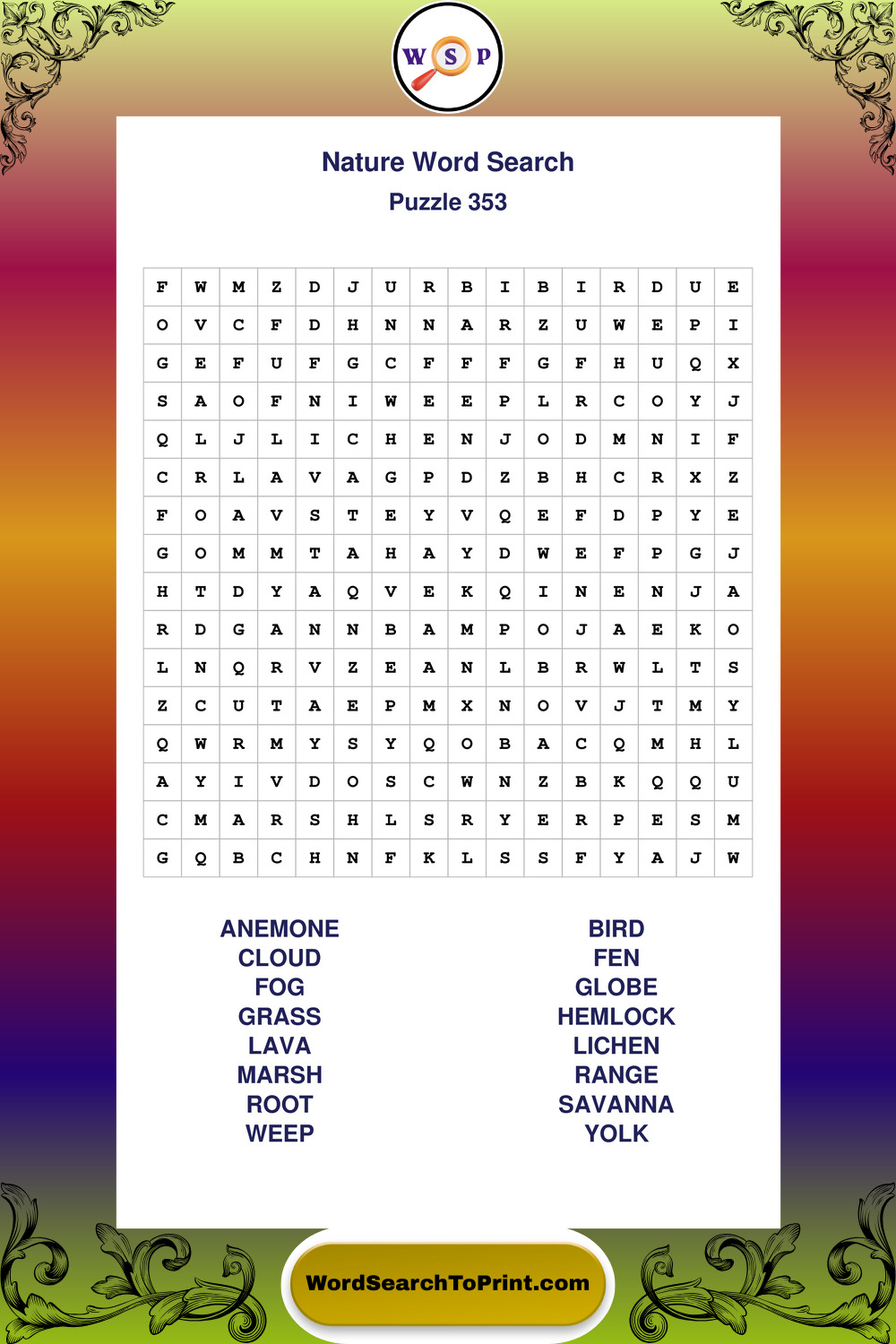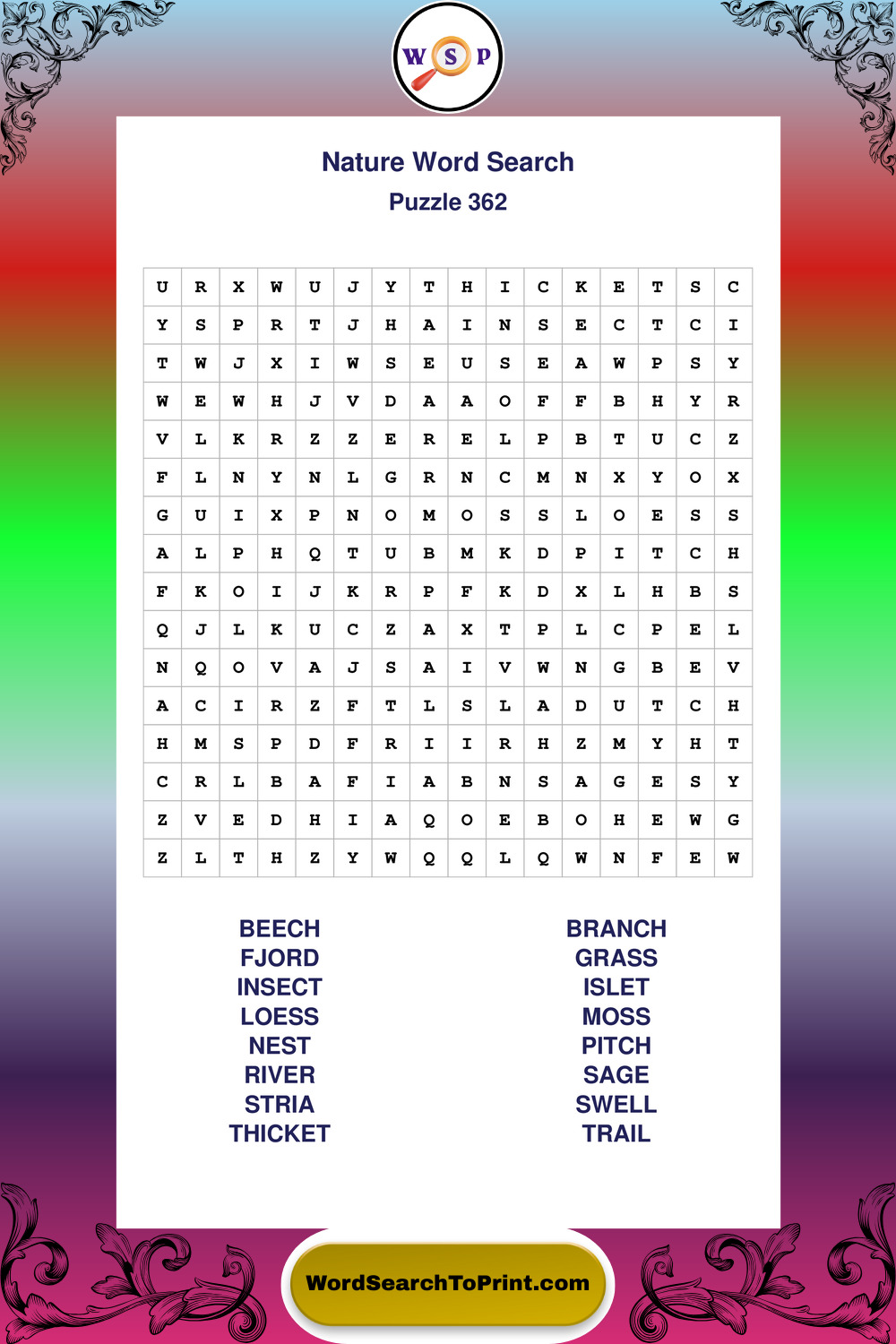 Find easy-to-read large print Nature wordsearches designed for peaceful focus and simple, enjoyable solving.