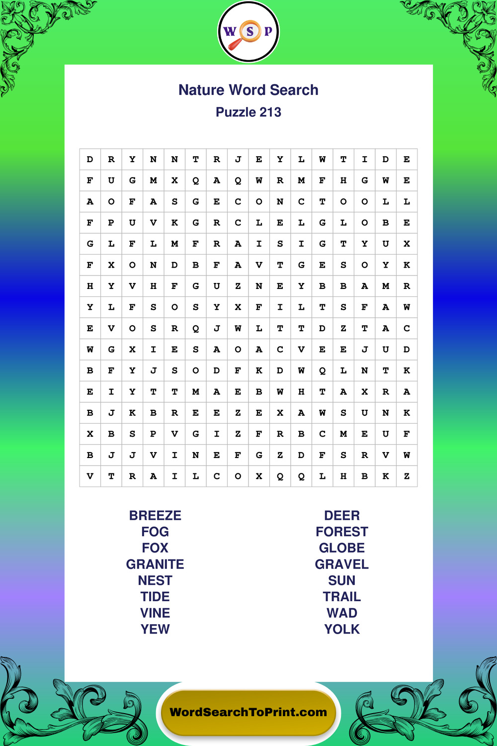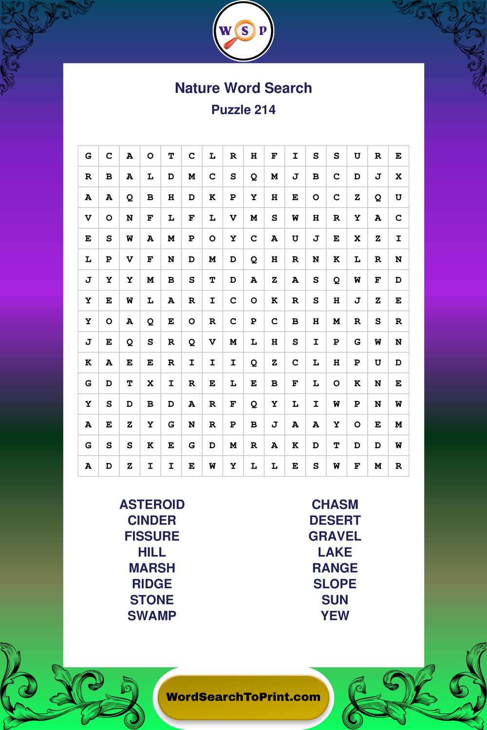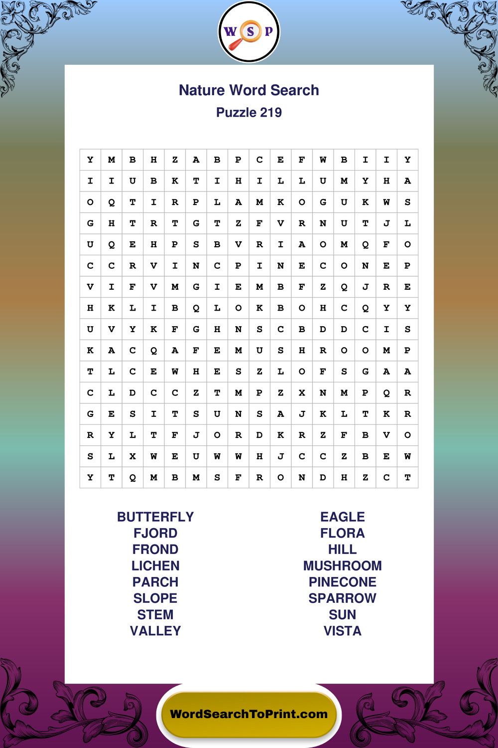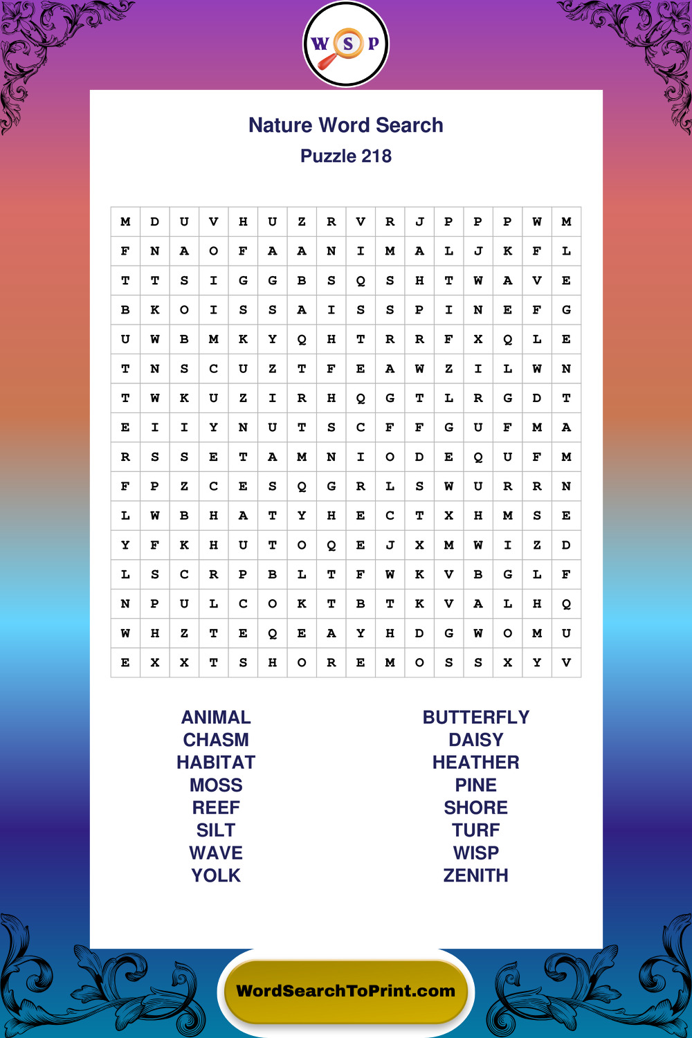 Find easy-to-read large print Nature wordsearches designed for peaceful focus and simple, enjoyable solving.