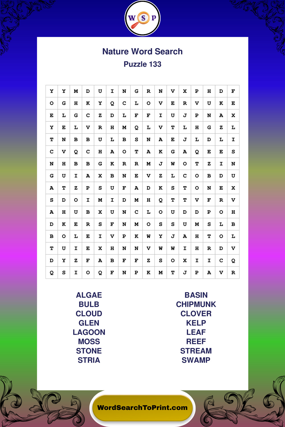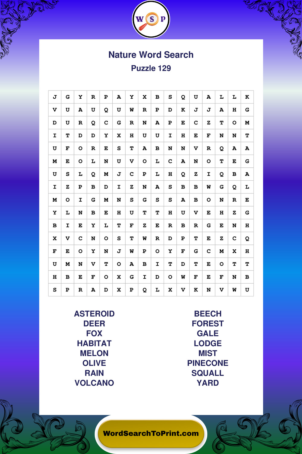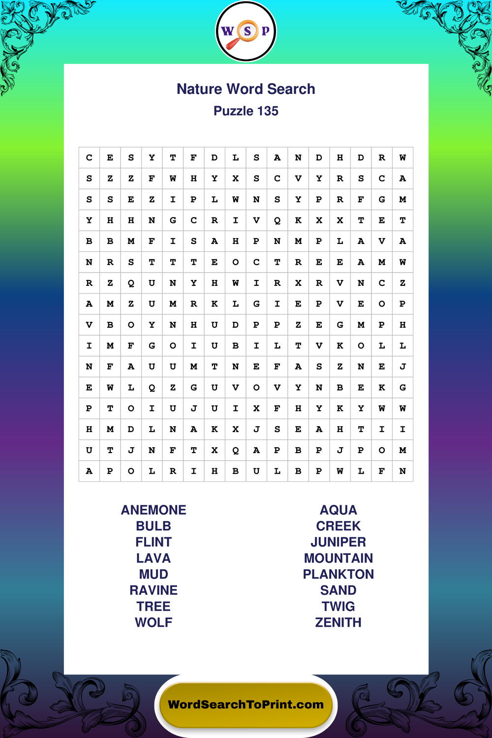 Find easy-to-read large print Nature wordsearches designed for peaceful focus and simple, enjoyable solving.