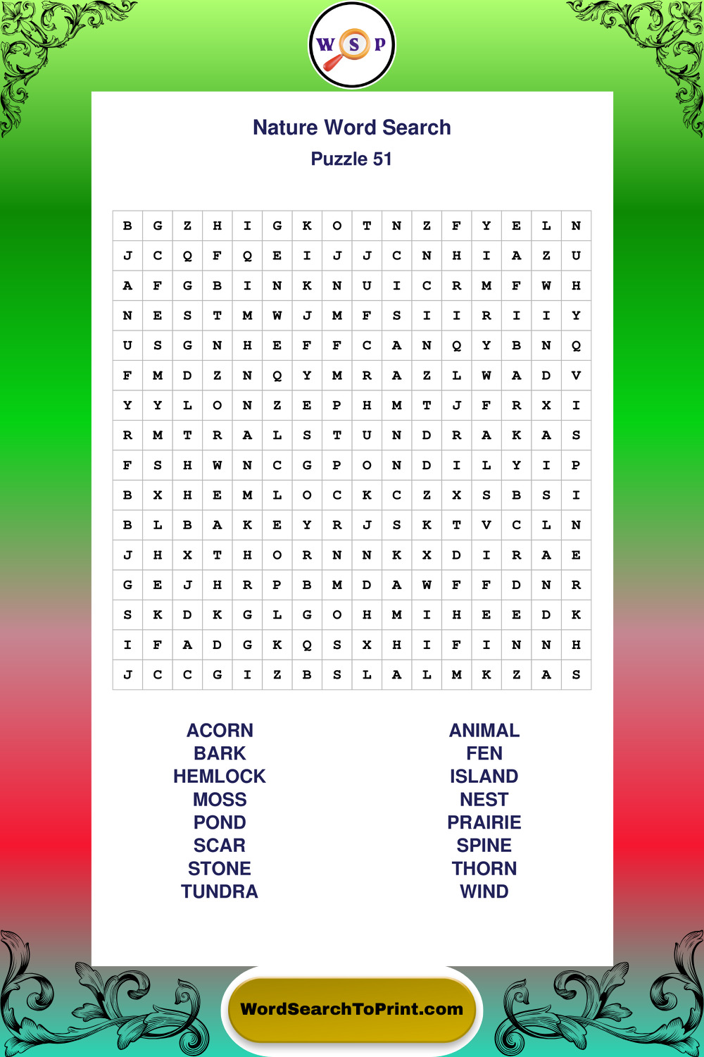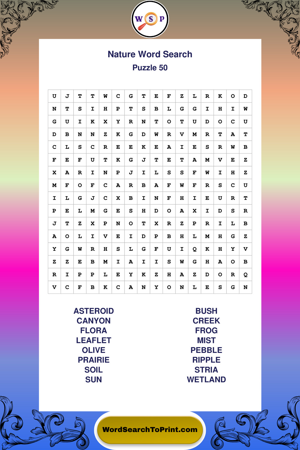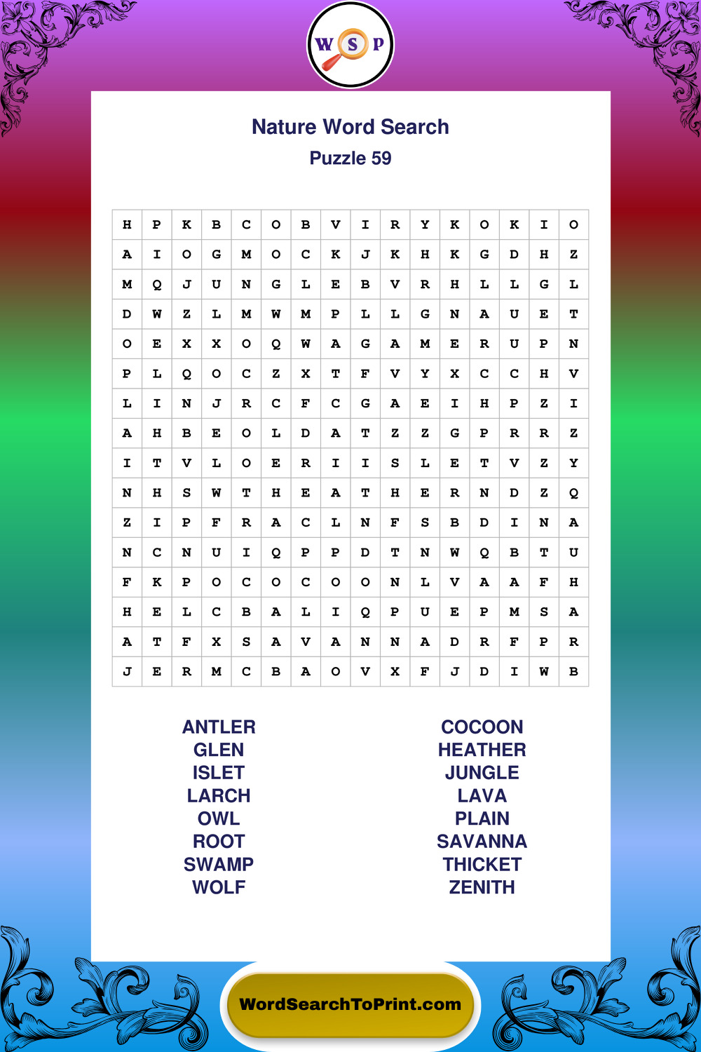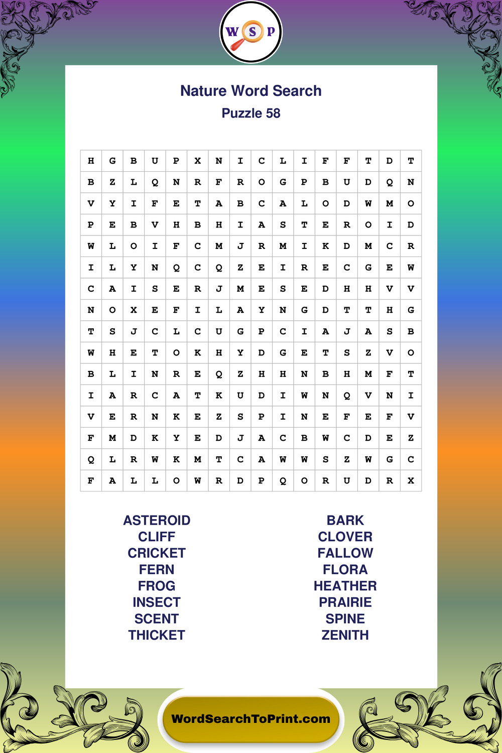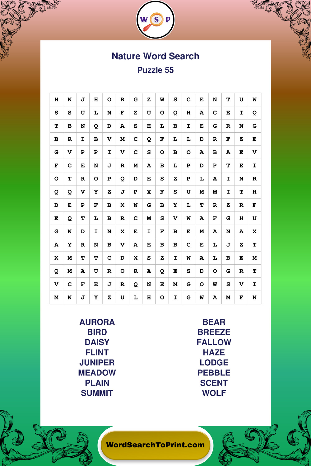 Find easy-to-read large print Nature wordsearches designed for peaceful focus and simple, enjoyable solving.