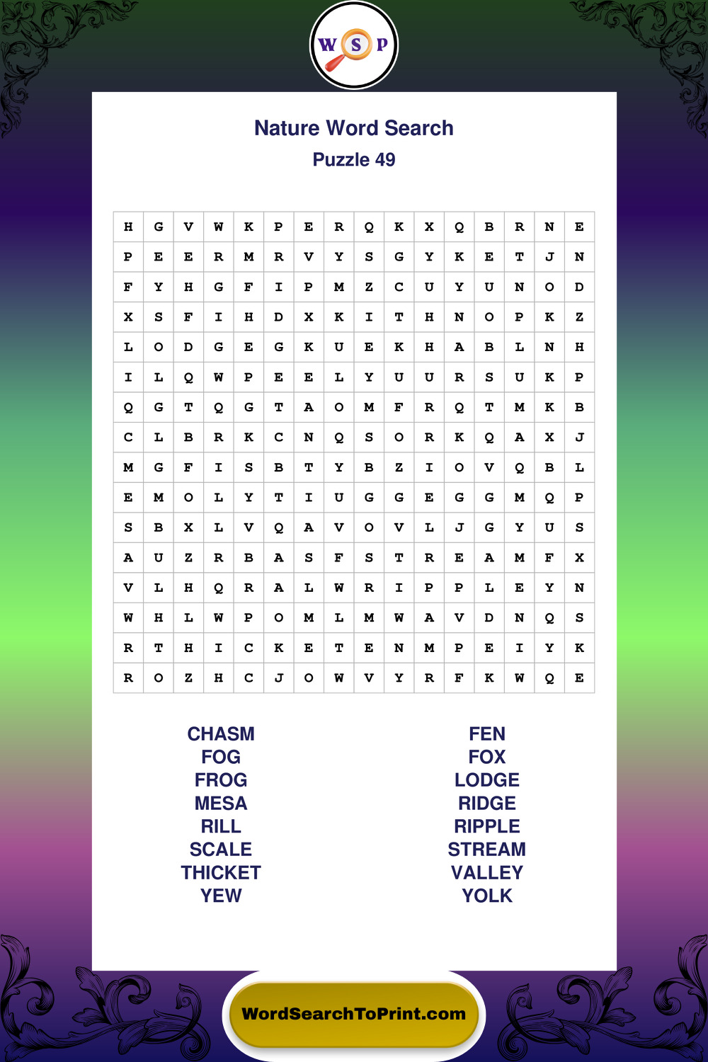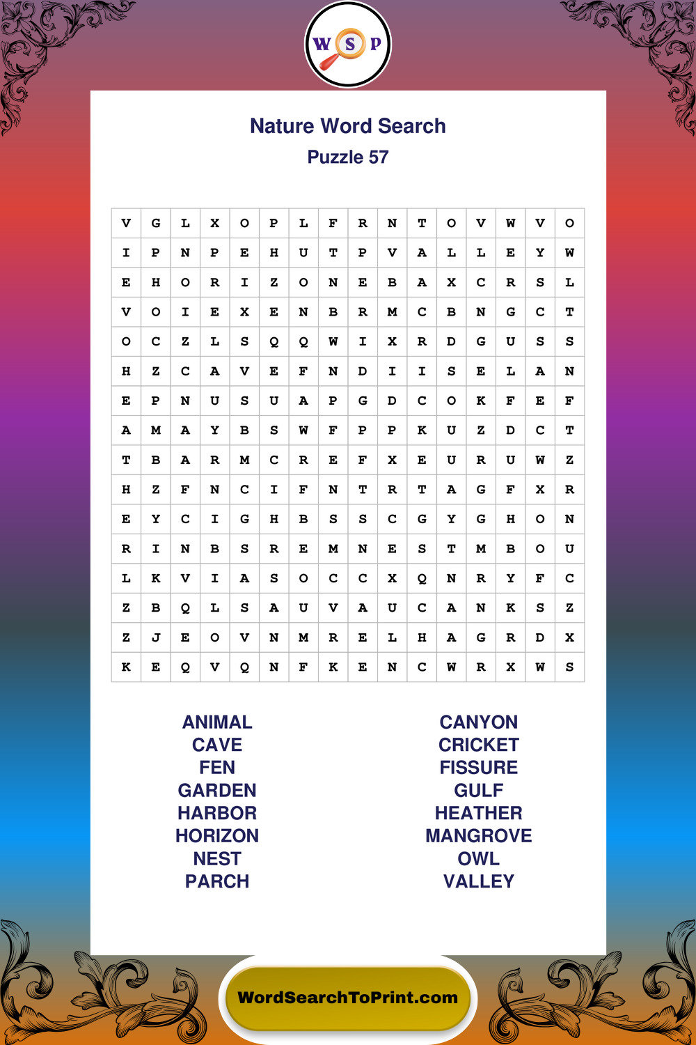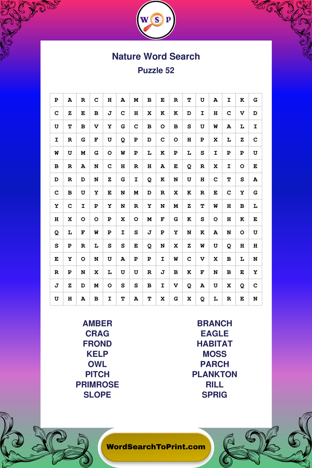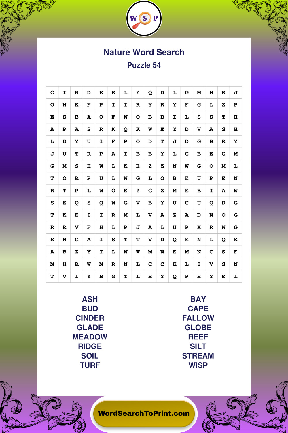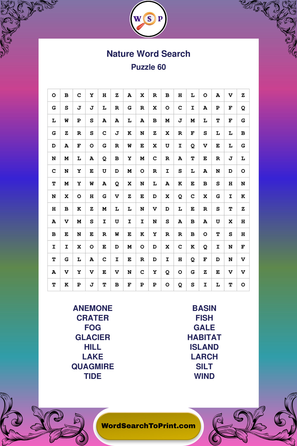 Find easy-to-read large print Nature wordsearches designed for peaceful focus and simple, enjoyable solving.
