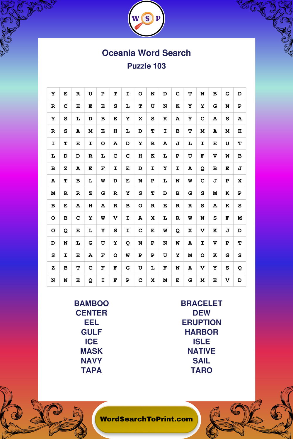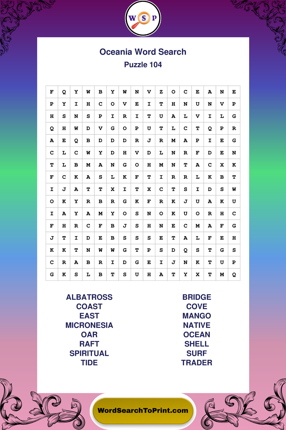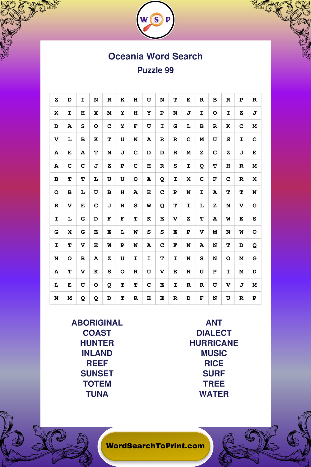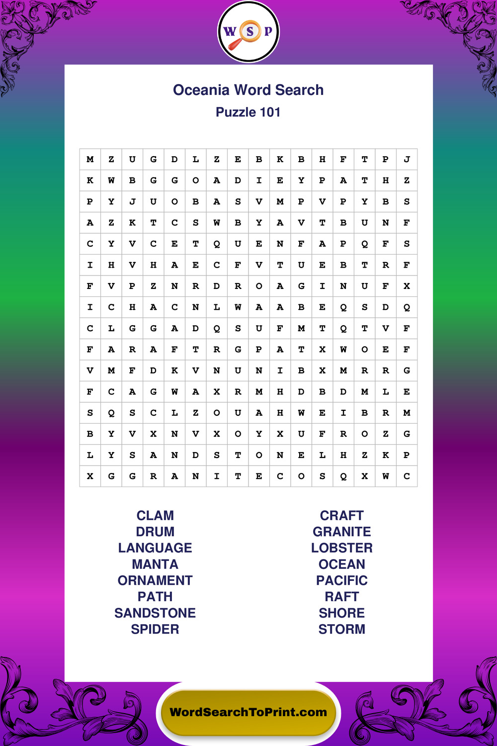 Enjoy these free large print Oceania wordsearches designed for easy reading and relaxed puzzle solving. Perfect for teens, adults, and seniors.