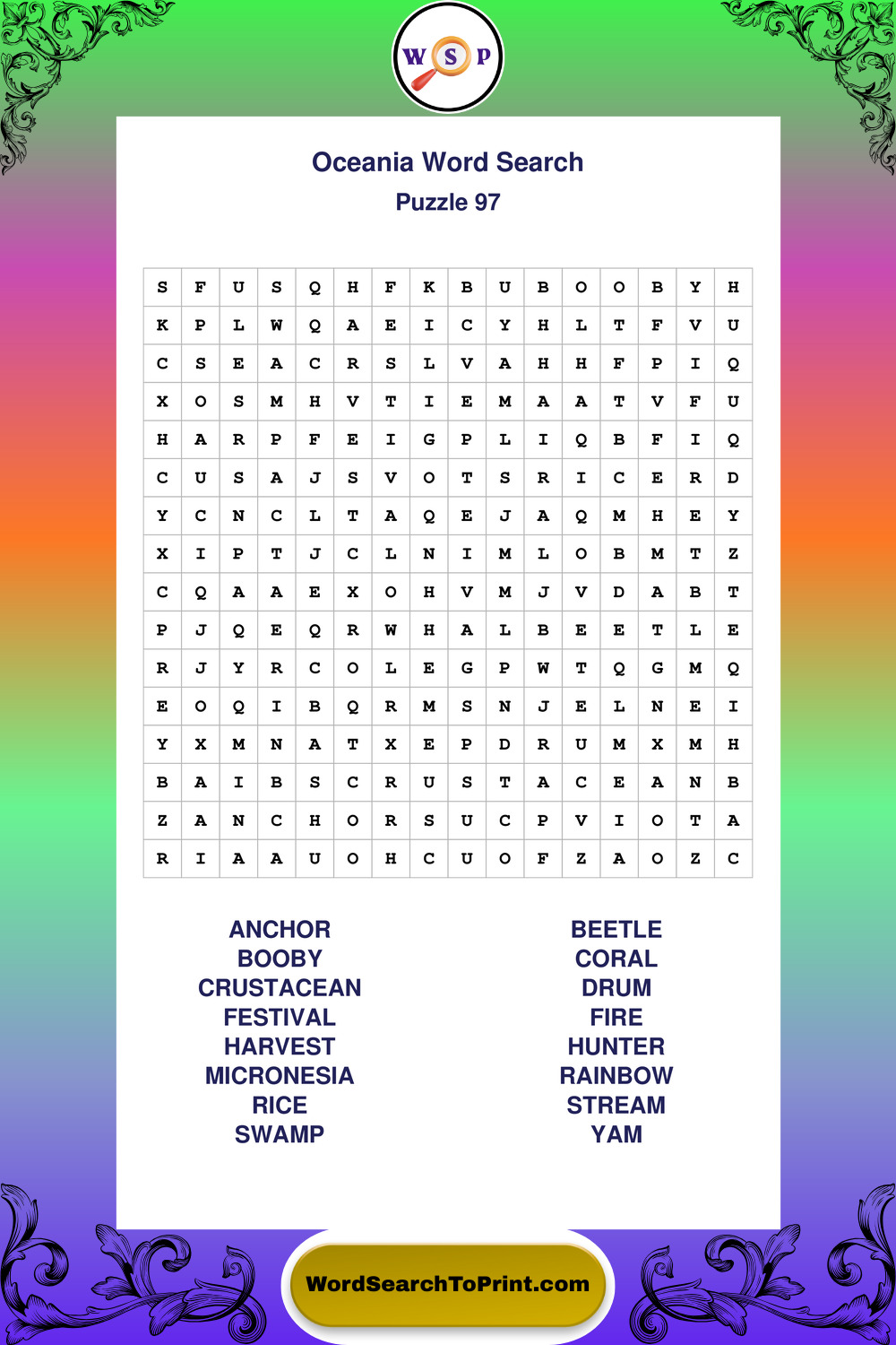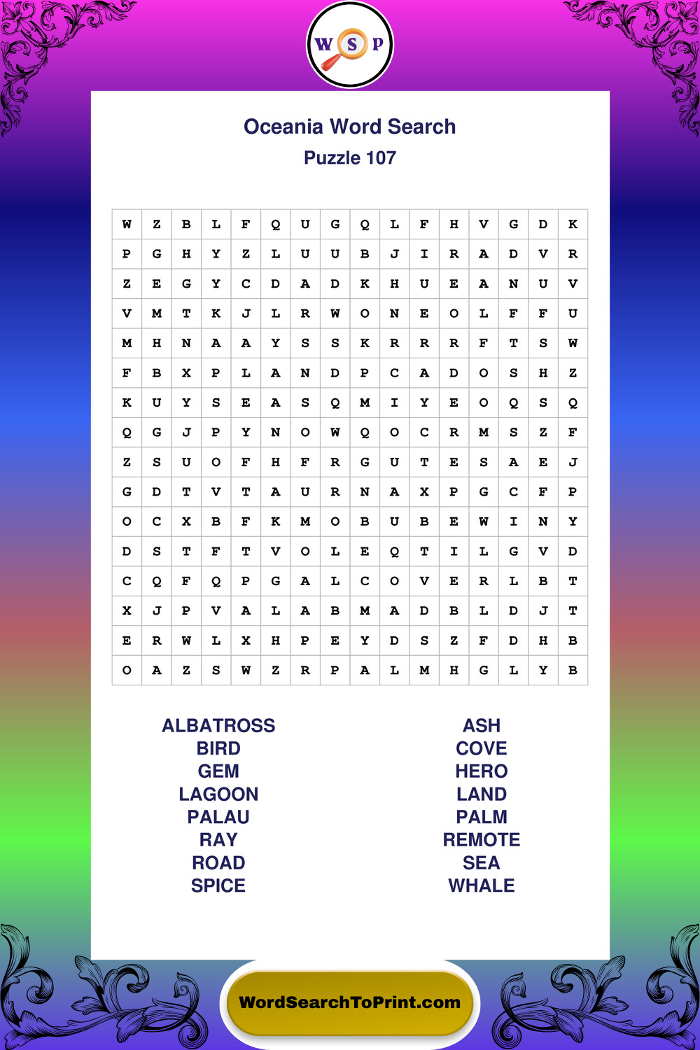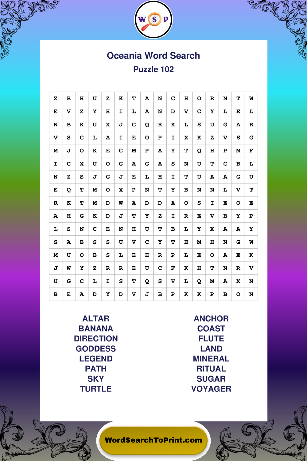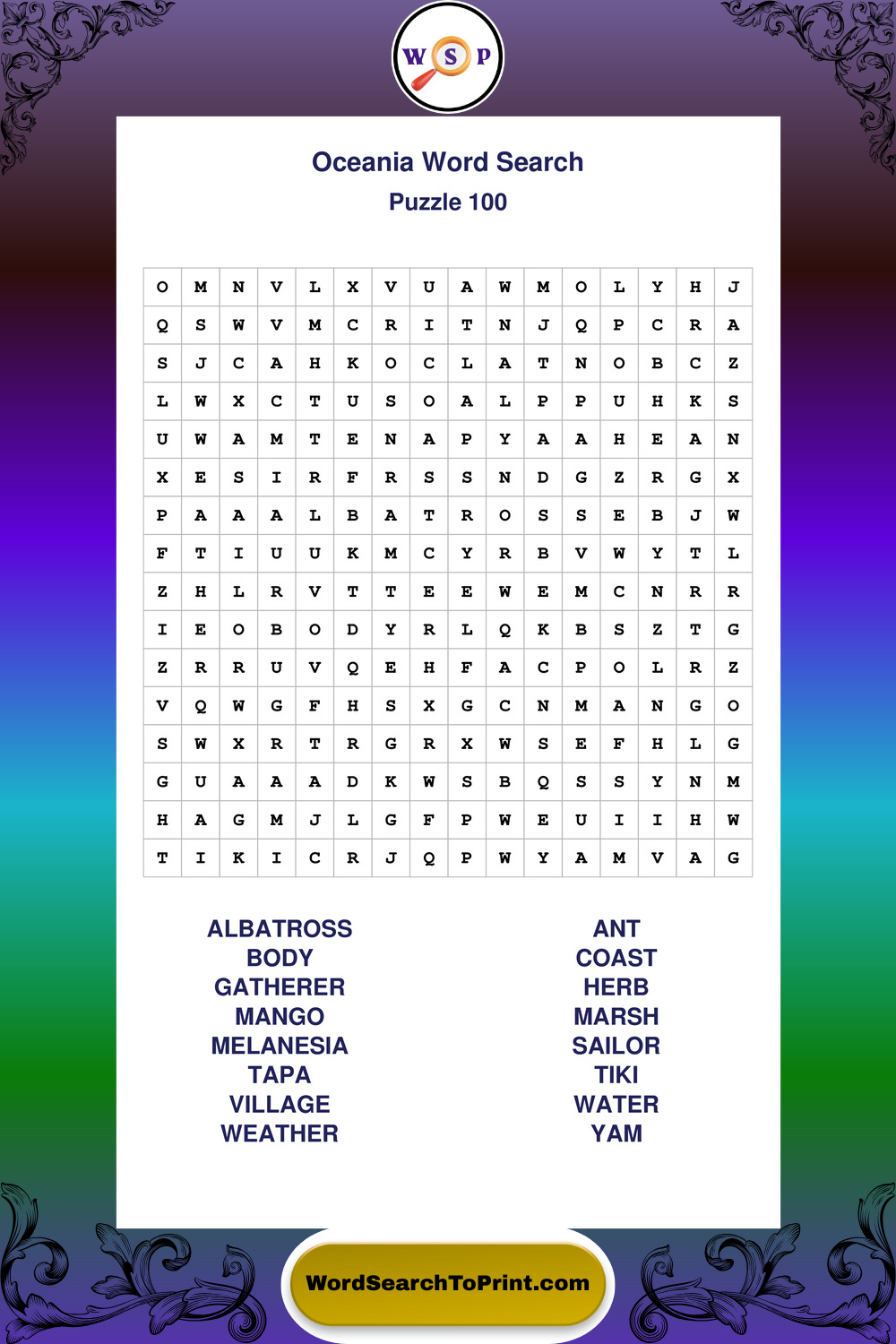 Enjoy these free large print Oceania wordsearches designed for easy reading and relaxed puzzle solving. Perfect for teens, adults, and seniors.